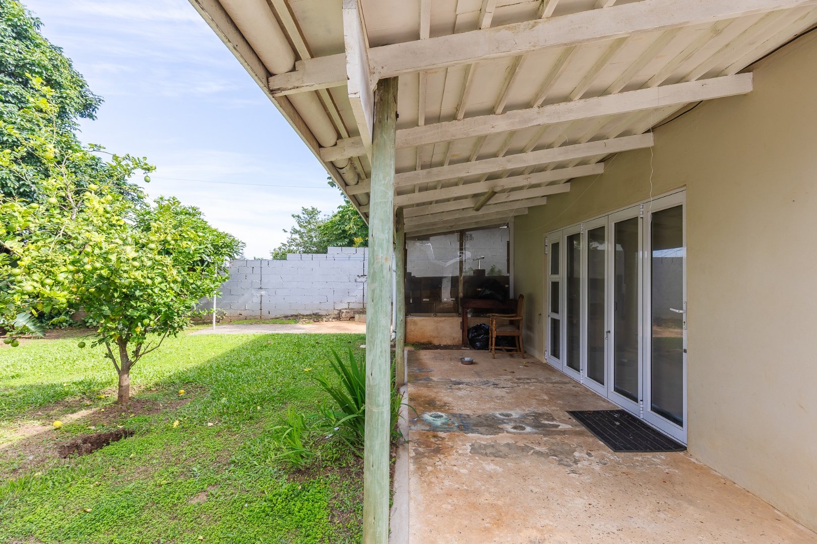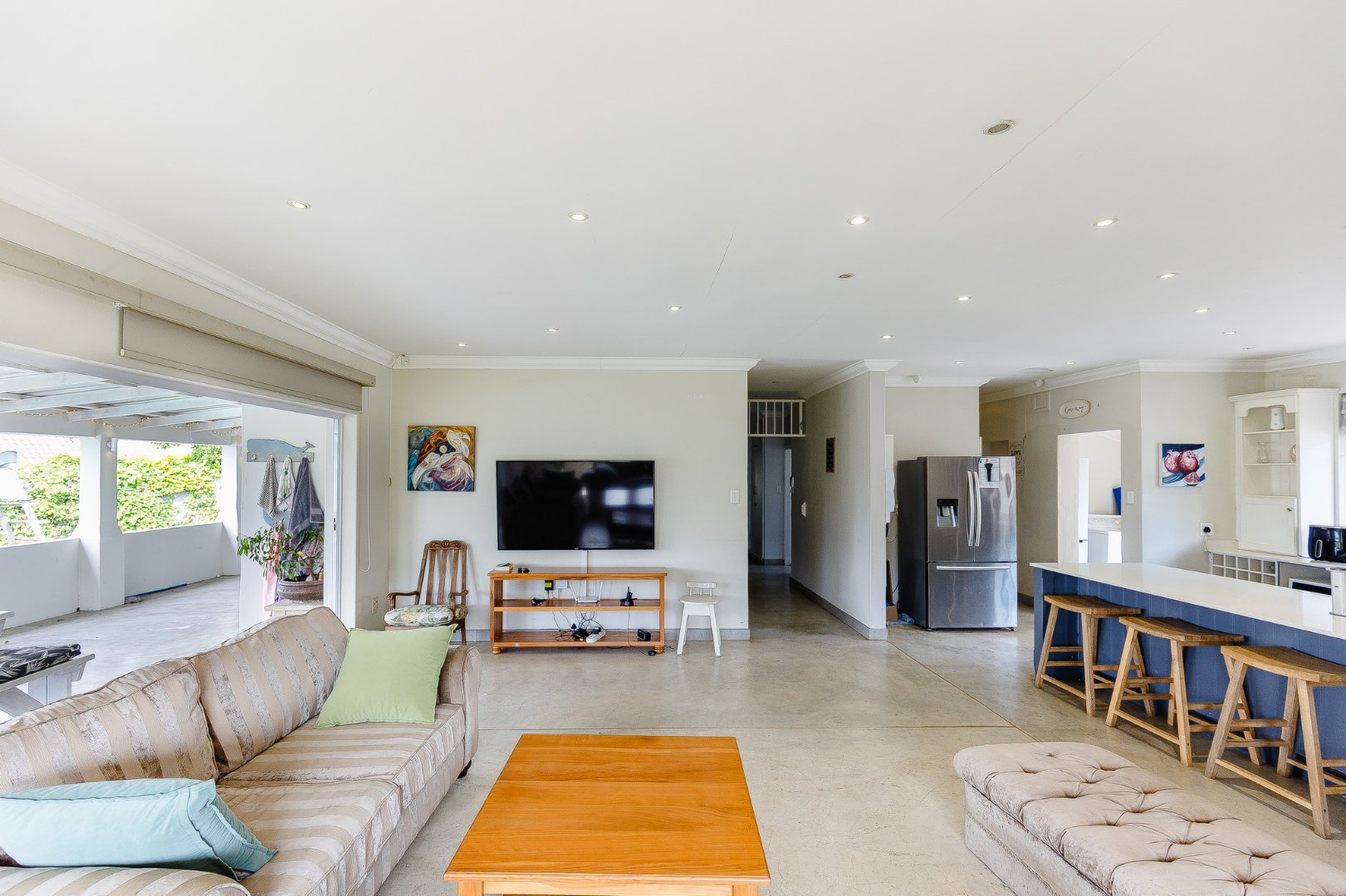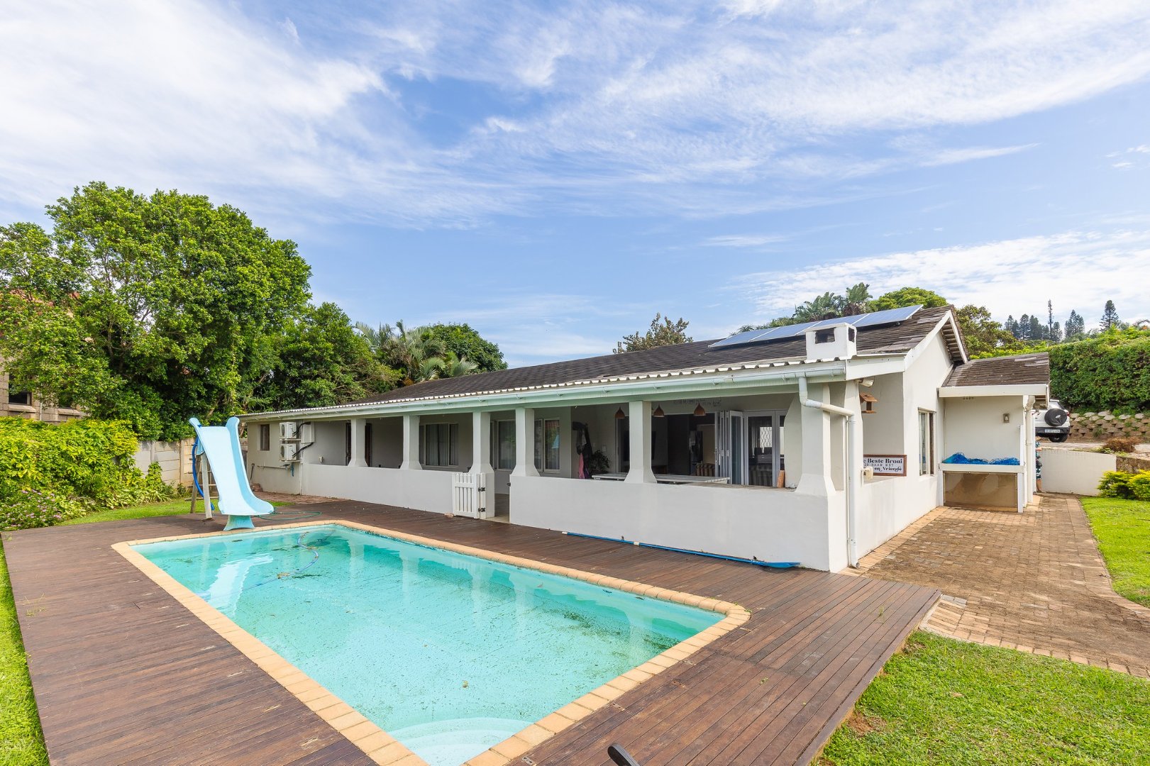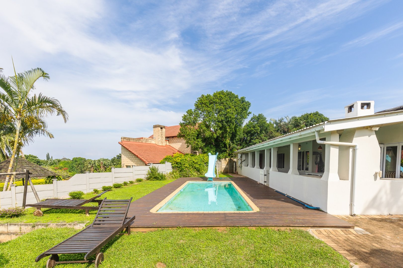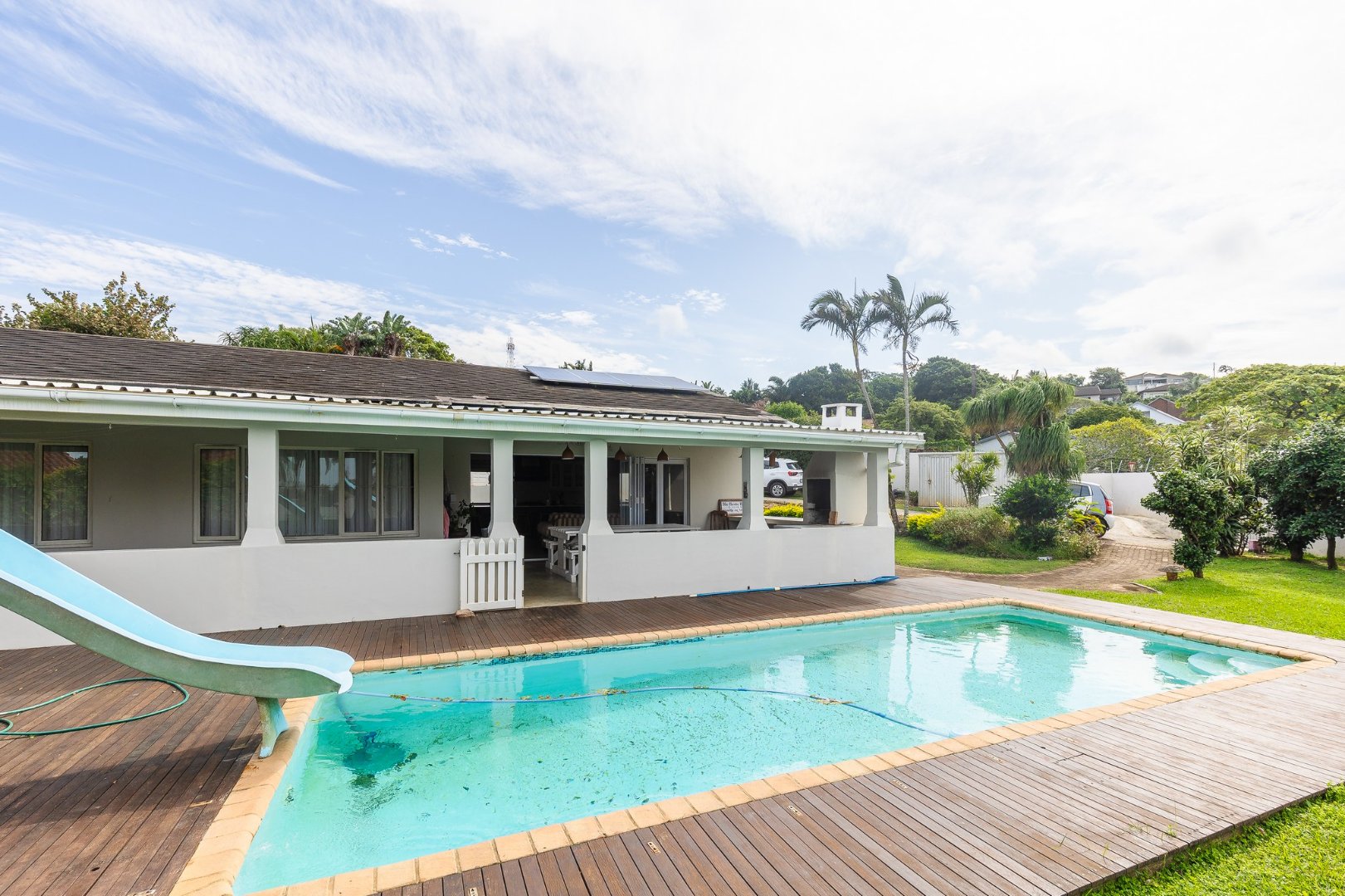 The lounge leads to a large patio, via stack doors. The patio has a built-in braai, and overlooks the swimming pool .