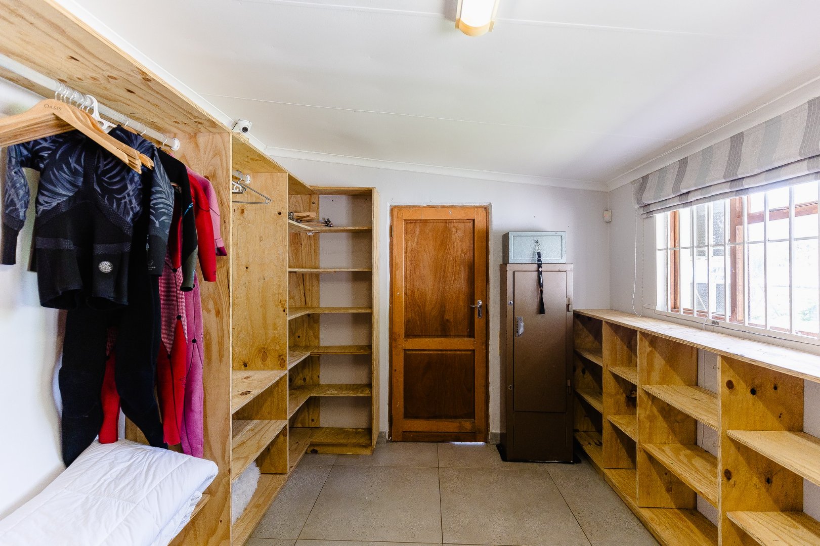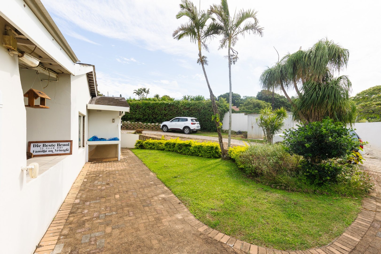 This home features Jojo tanks for water storage, solar panels for energy efficiency, CCTV for security, and beams and an alarm system, all within a fully walled perimeter with an electric fence.