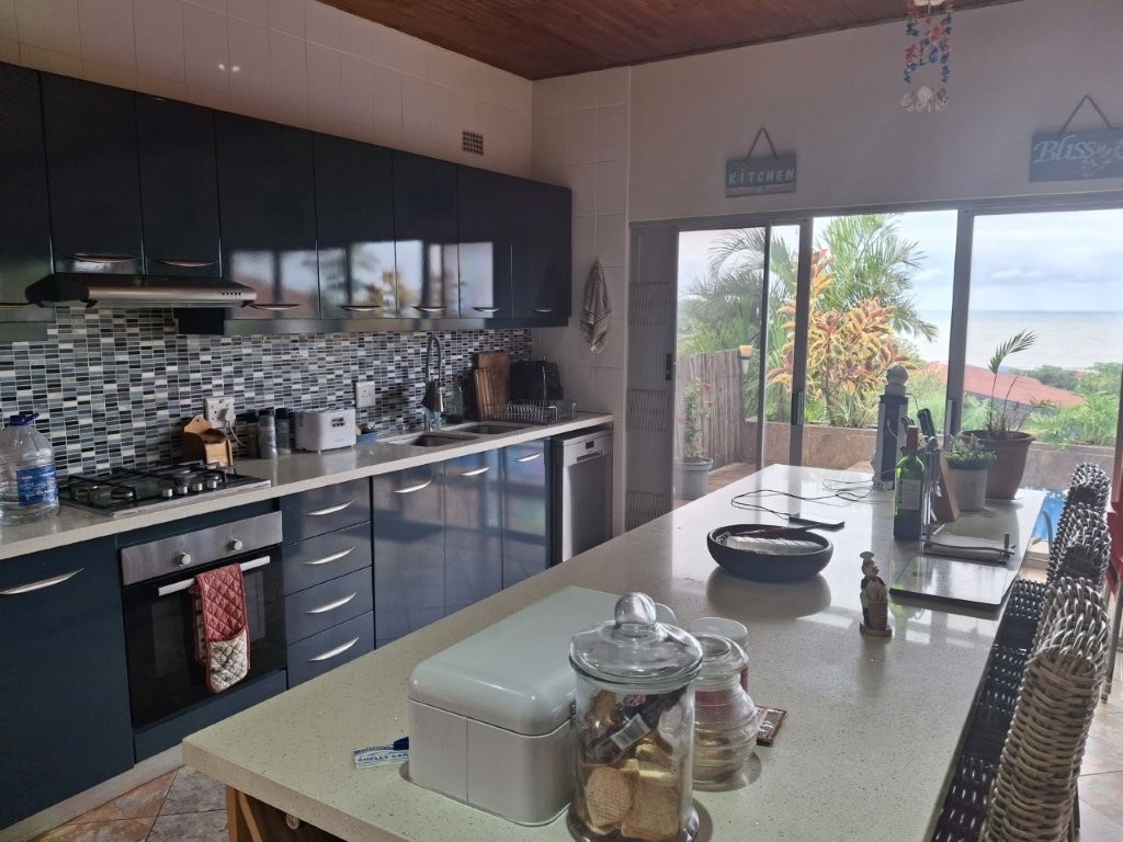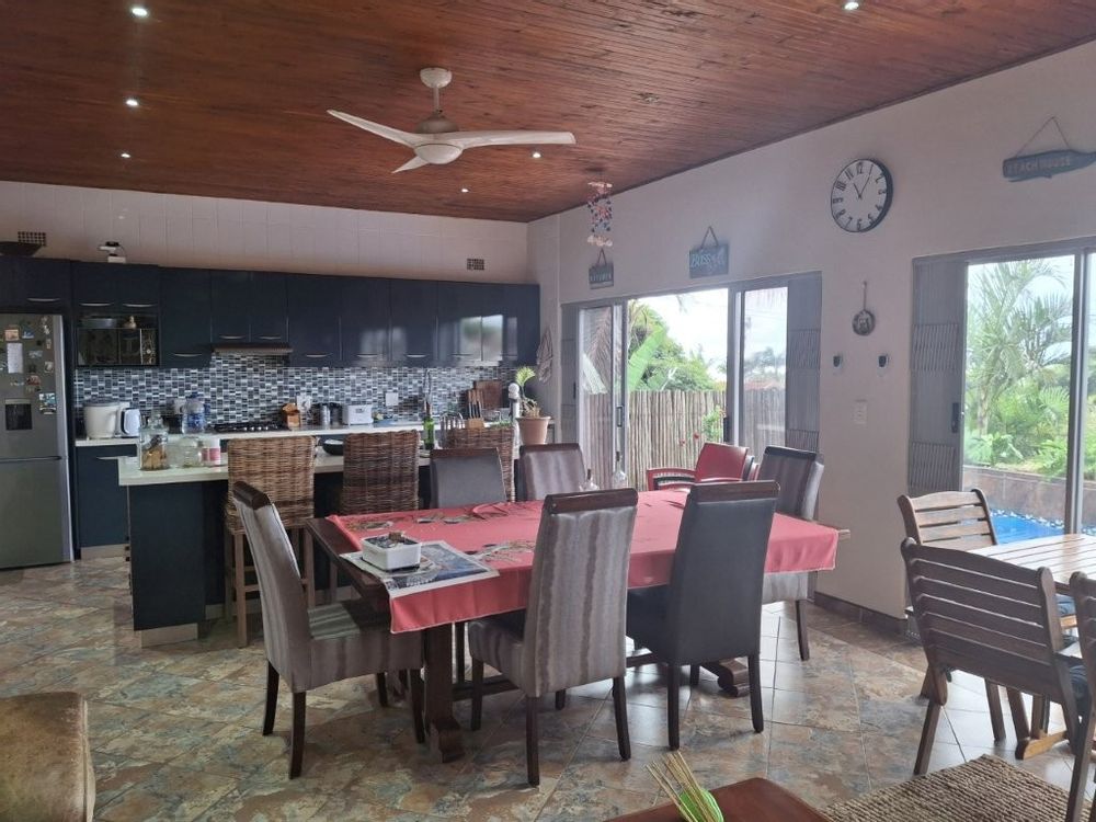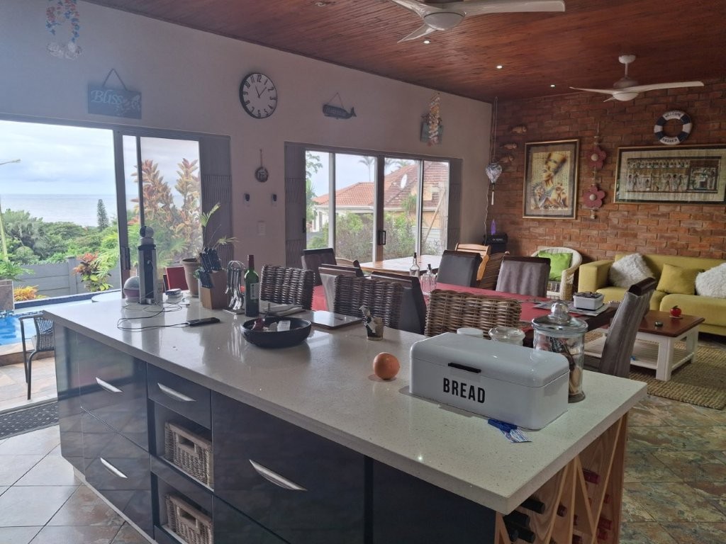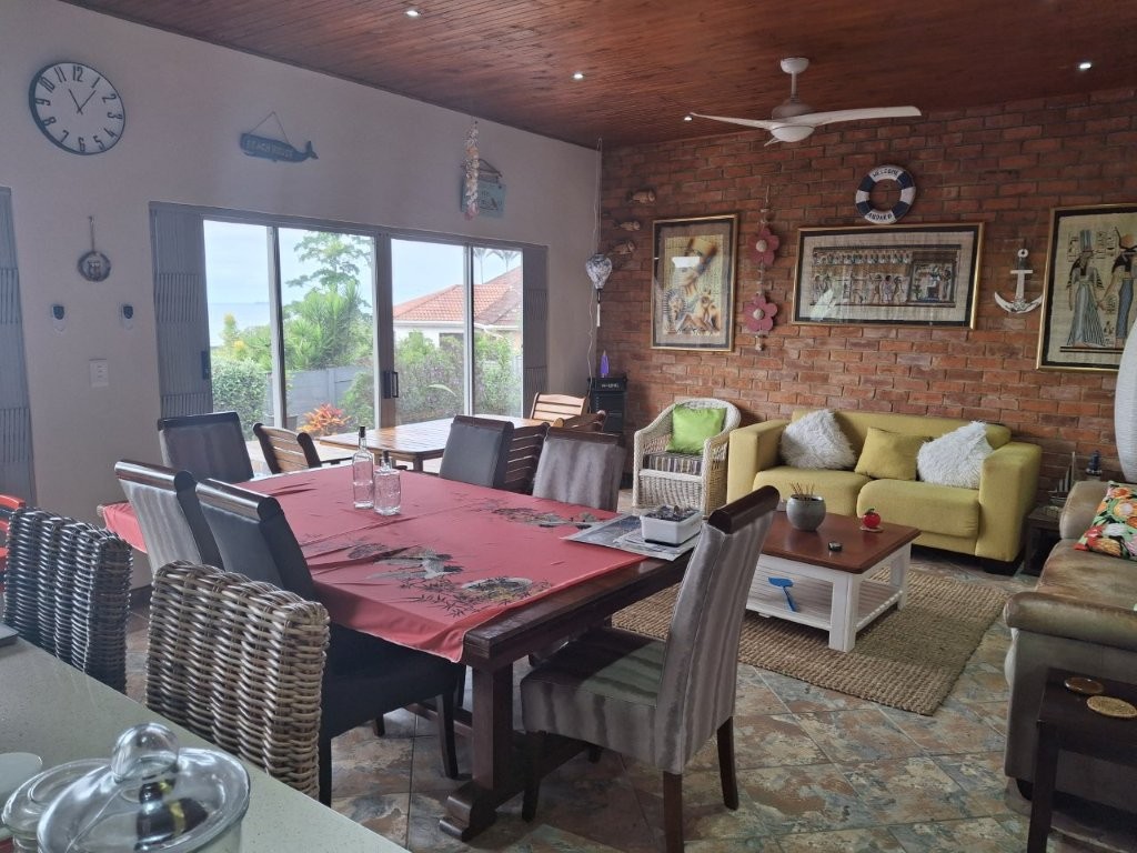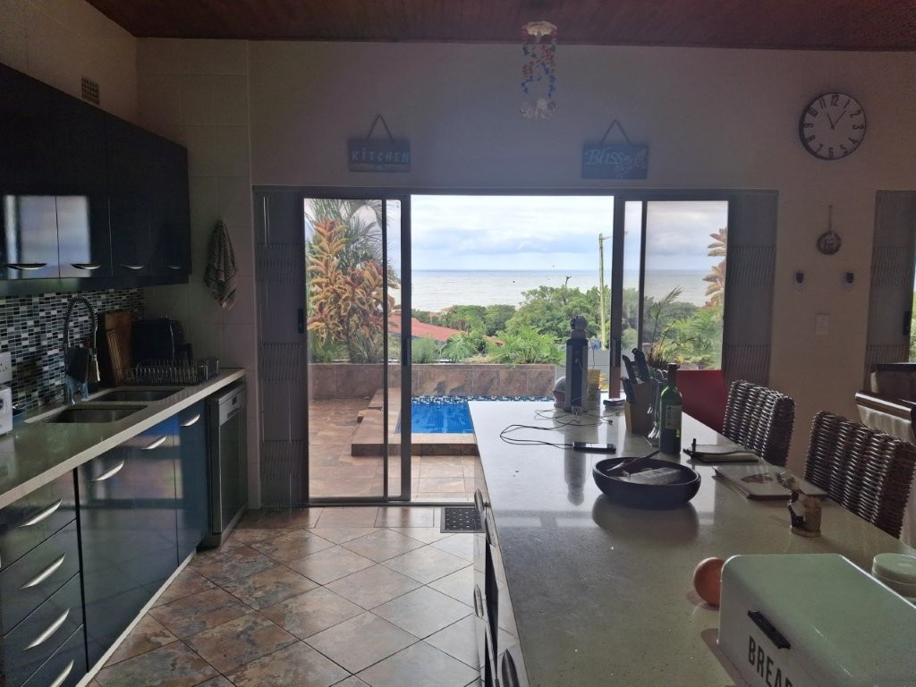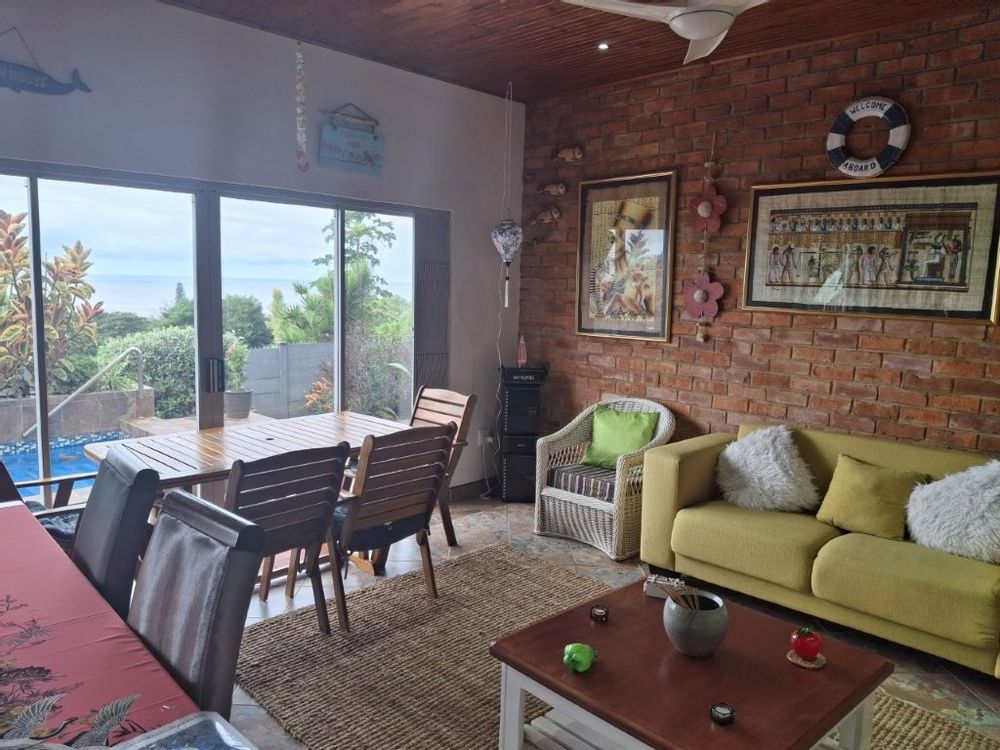 This spacious family home, situated in St Michaels, with amazing ocean views offers everything you need for comfortable coastal living with a lucrative rental income. As you enter the main house, into a welcoming entrance hall, you will find on the right wing, 3 spacious bedrooms and 2 modern bathrooms, the main bedroom, with an abundance of cupboard space, has the bathroom en-suite and a second bathroom, strategically placed, caters for the 2 remaining bedrooms. There is also a homely TV room with a feature fireplace, offering you cosy private evenings. The left wing of the home gives you open plan living, with a large lounge, informal dining and a beautiful modern kitchen with top of the range cabinetry and sleek granite work surfaces. These areas flow, through double volume sliding doors, to an outside patio and pool area with beautiful views over the Indian Ocean. To the right of the patio there is an enclosed entertainment area, with a built-in braai, so come rain or sunshine entertaining is a breeze.