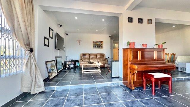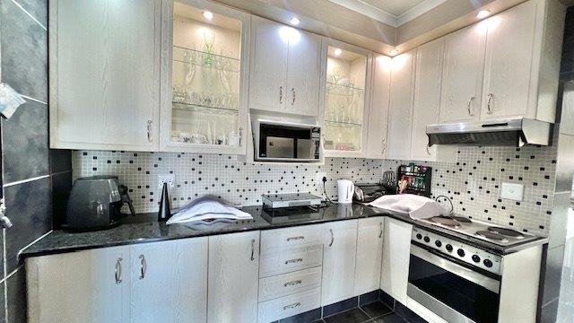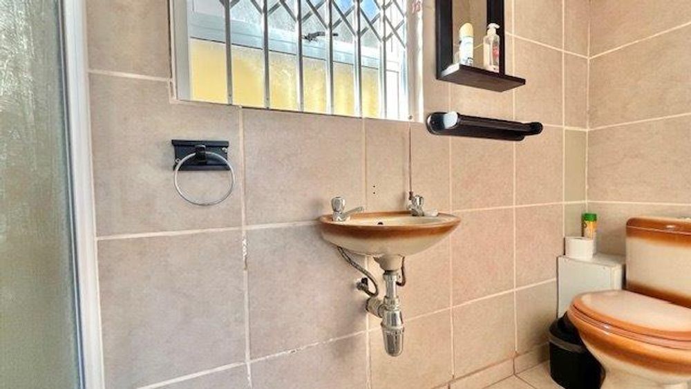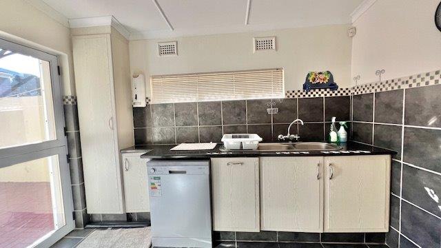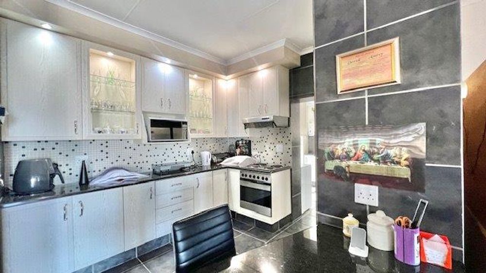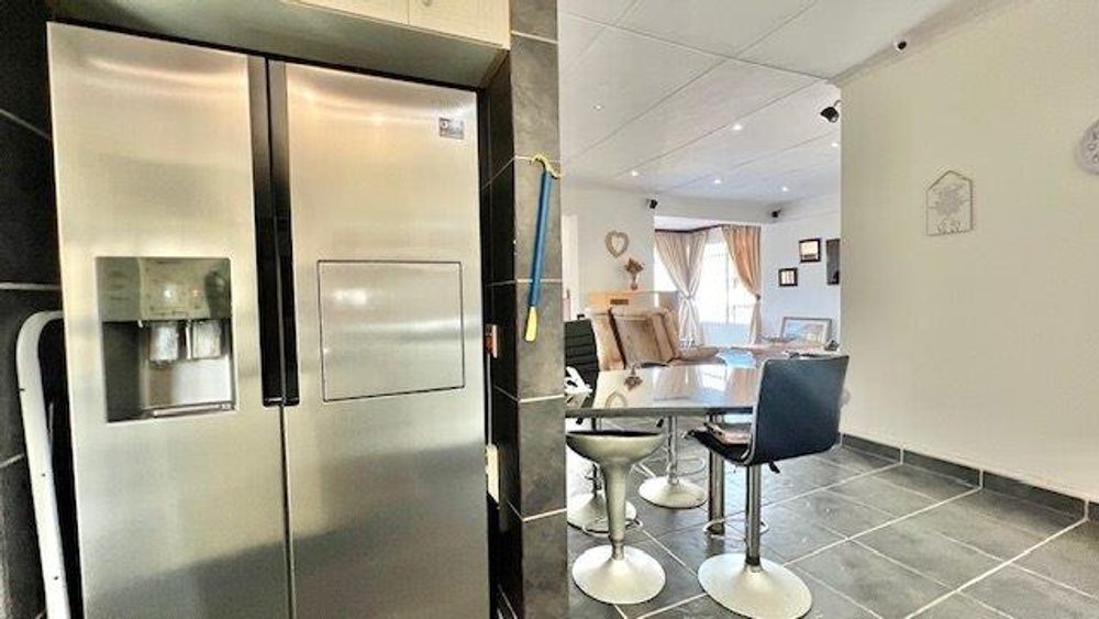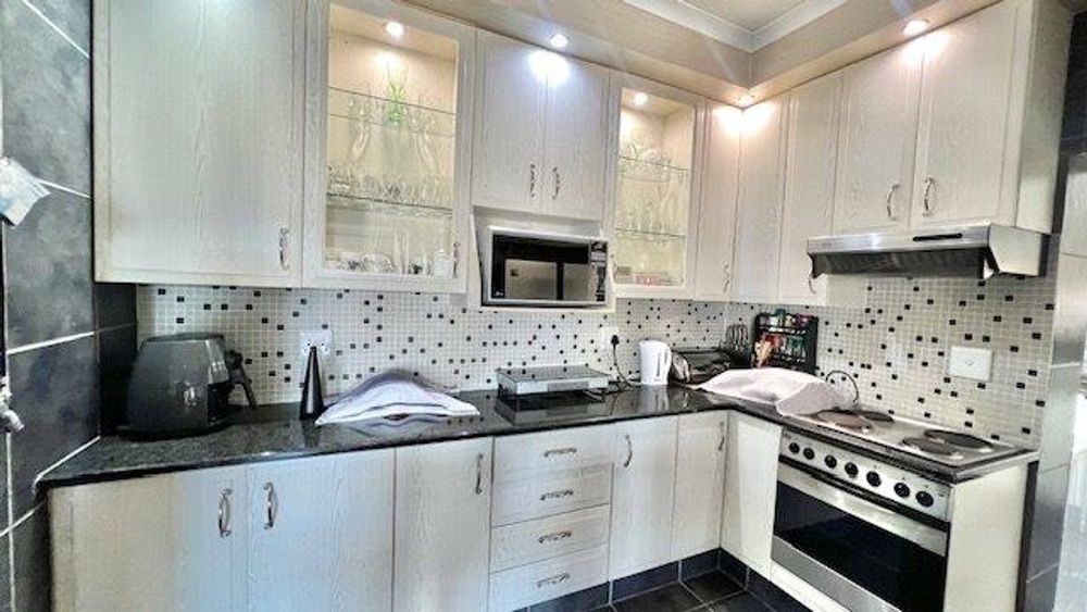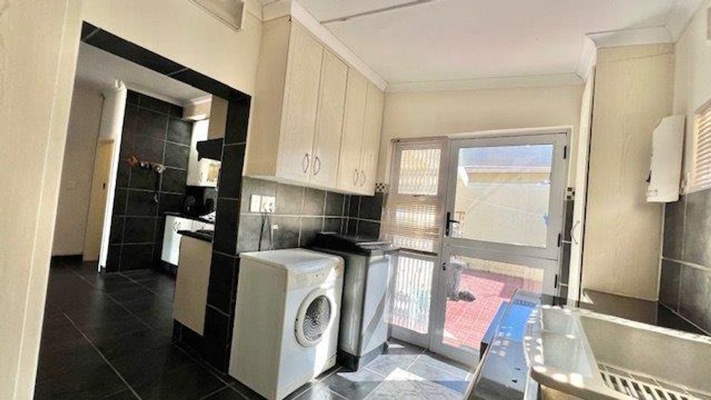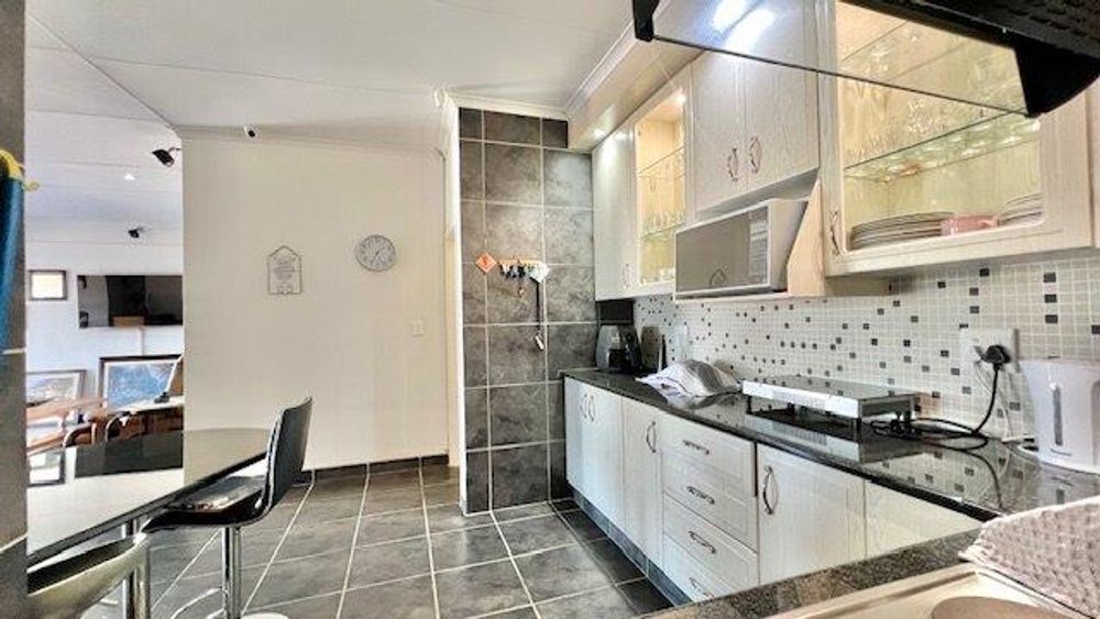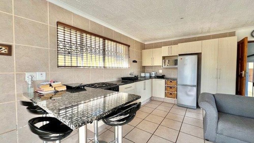 The home features an open-plan lounge and dining area, a modern kitchen with granite countertops, and a separate scullery and laundry room. There’s a double garage with a storage room, plus domestic quarters that include a small kitchen area, shower, and toilet.