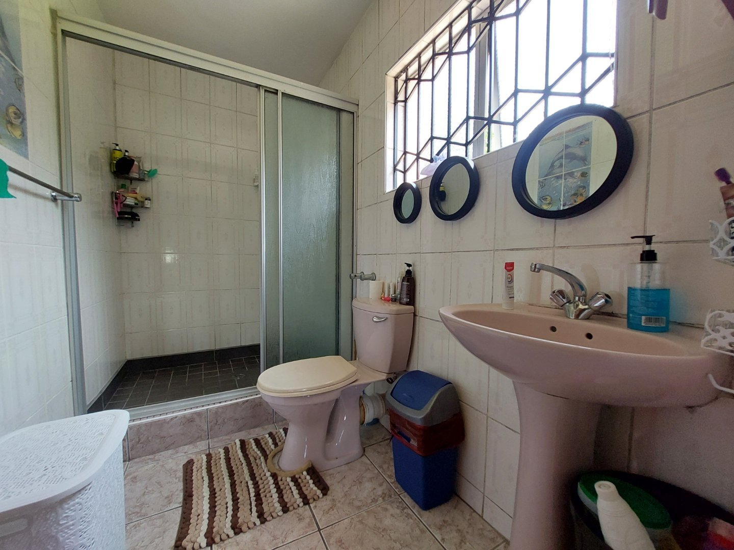 The interior of the home is designed for both functionality and warmth. At its heart lies a spacious kitchen and dining area, featuring ample wooden cabinetry, a built-in stove, and a conventional oven, all kept comfortable by integrated air-conditioning. The inviting lounge area exudes a timeless elegance, characterized by high ceilings and original Swiss parquet flooring. The home’s layout includes four well-proportioned bedrooms, each equipped with air-conditioning to ensure year-round comfort. Three of the bedrooms include built-in cupboards, while two—including the primary suite—feature private en-suite bathrooms with modern showers. A third well-appointed bathroom serves the remaining two bedrooms.