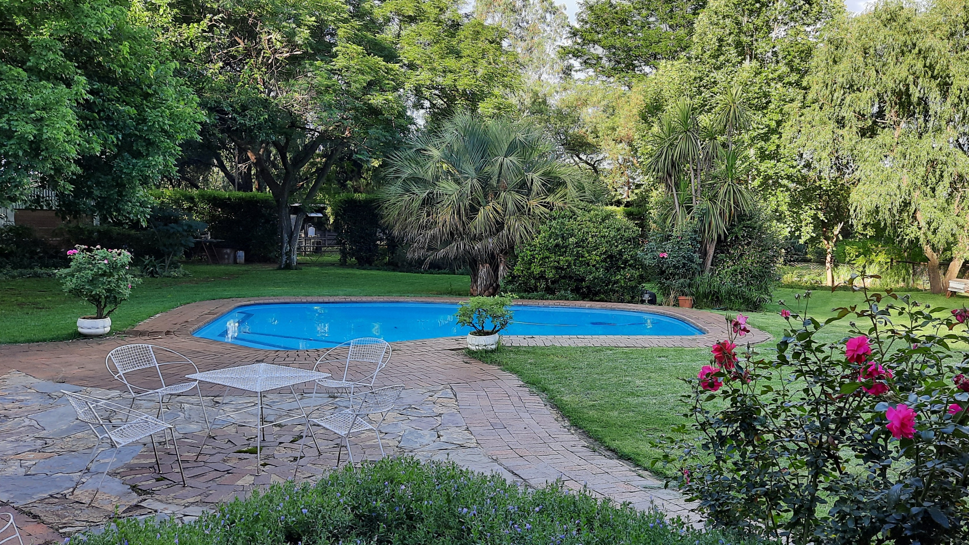 There is a sparkling swimming pool in the beautiful garden.