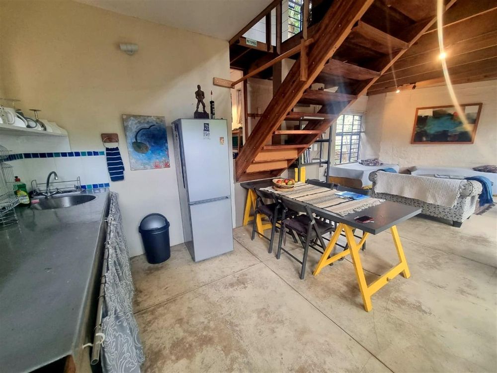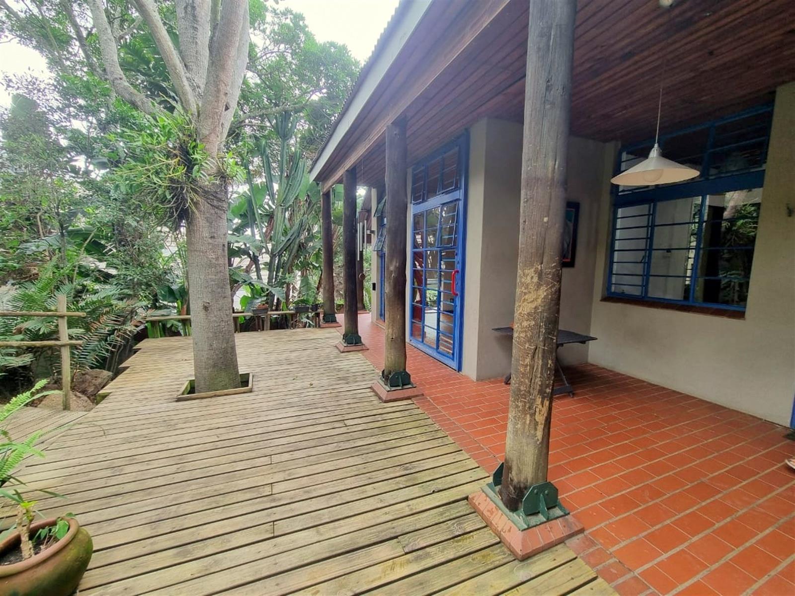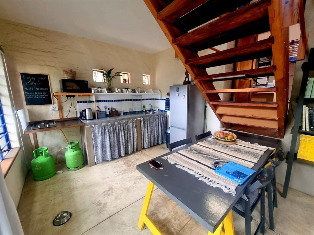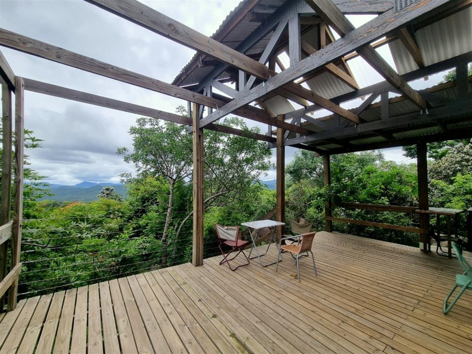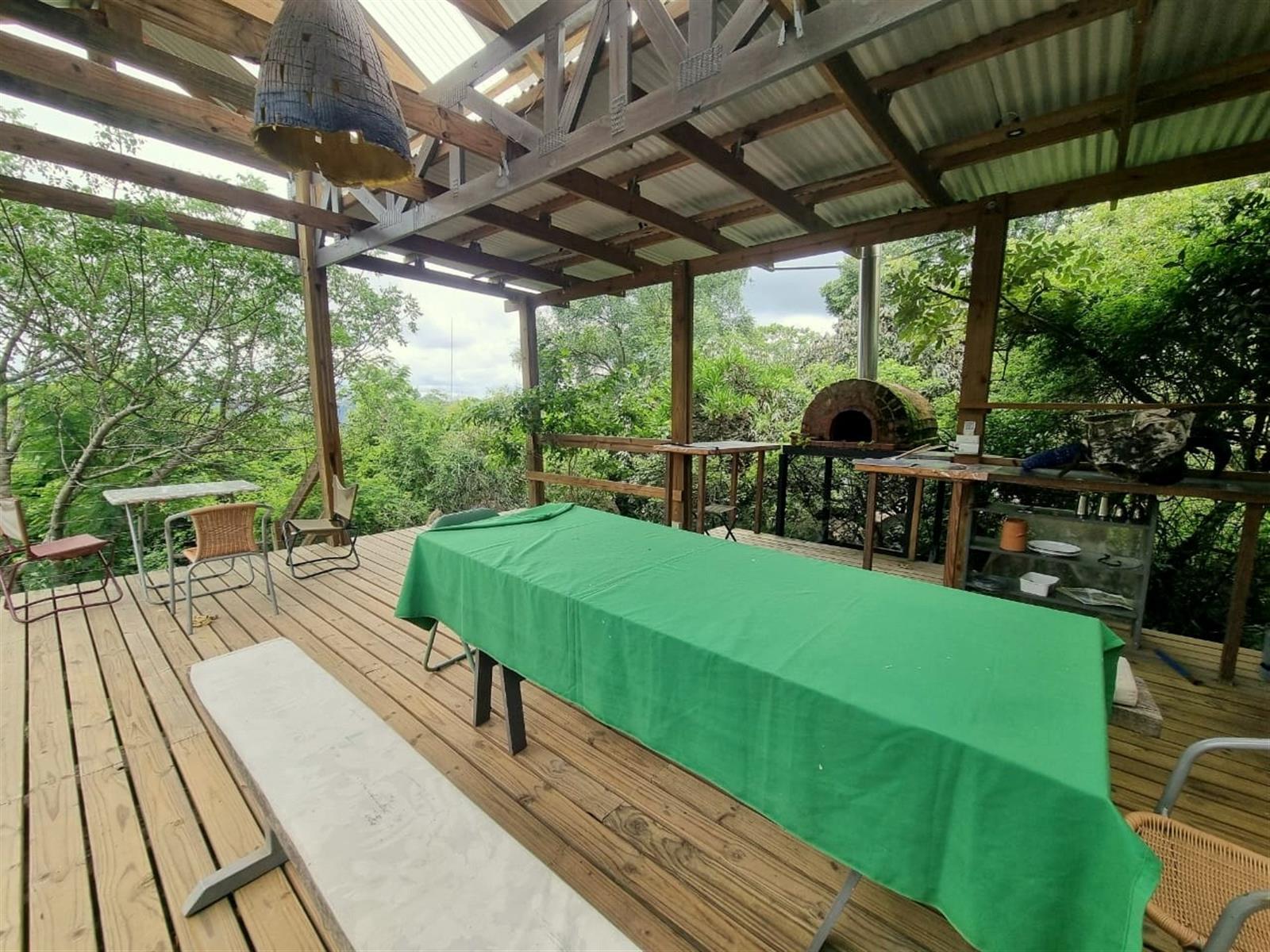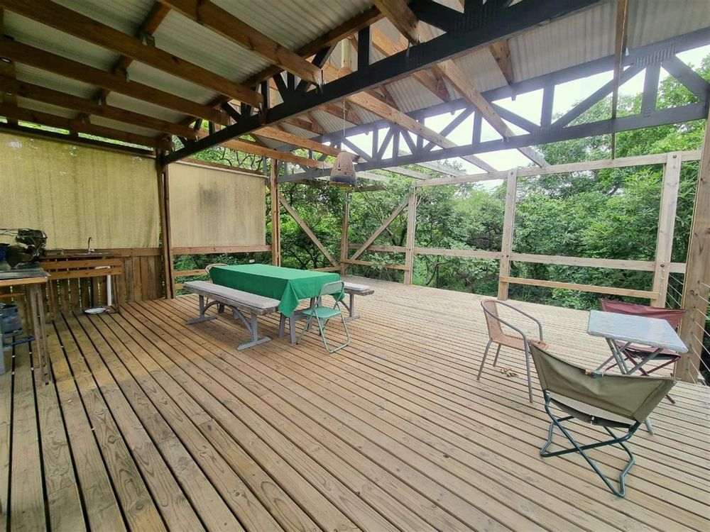 The slatted wooden ceiling in the kitchen is an unique element with sunlight peeking through setting the mood of the open plan dining room. The patio is extended by a wooden deck that can be accessed by either the lounge or dining room with sliding doors to make the most of the lovely lowveld climate.