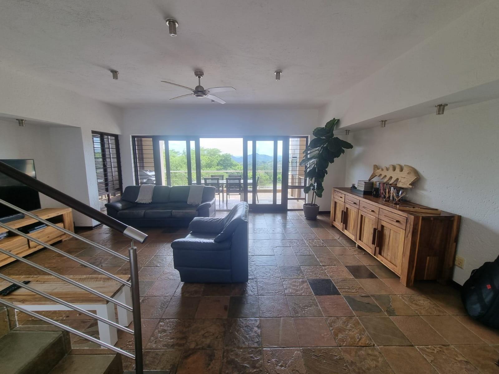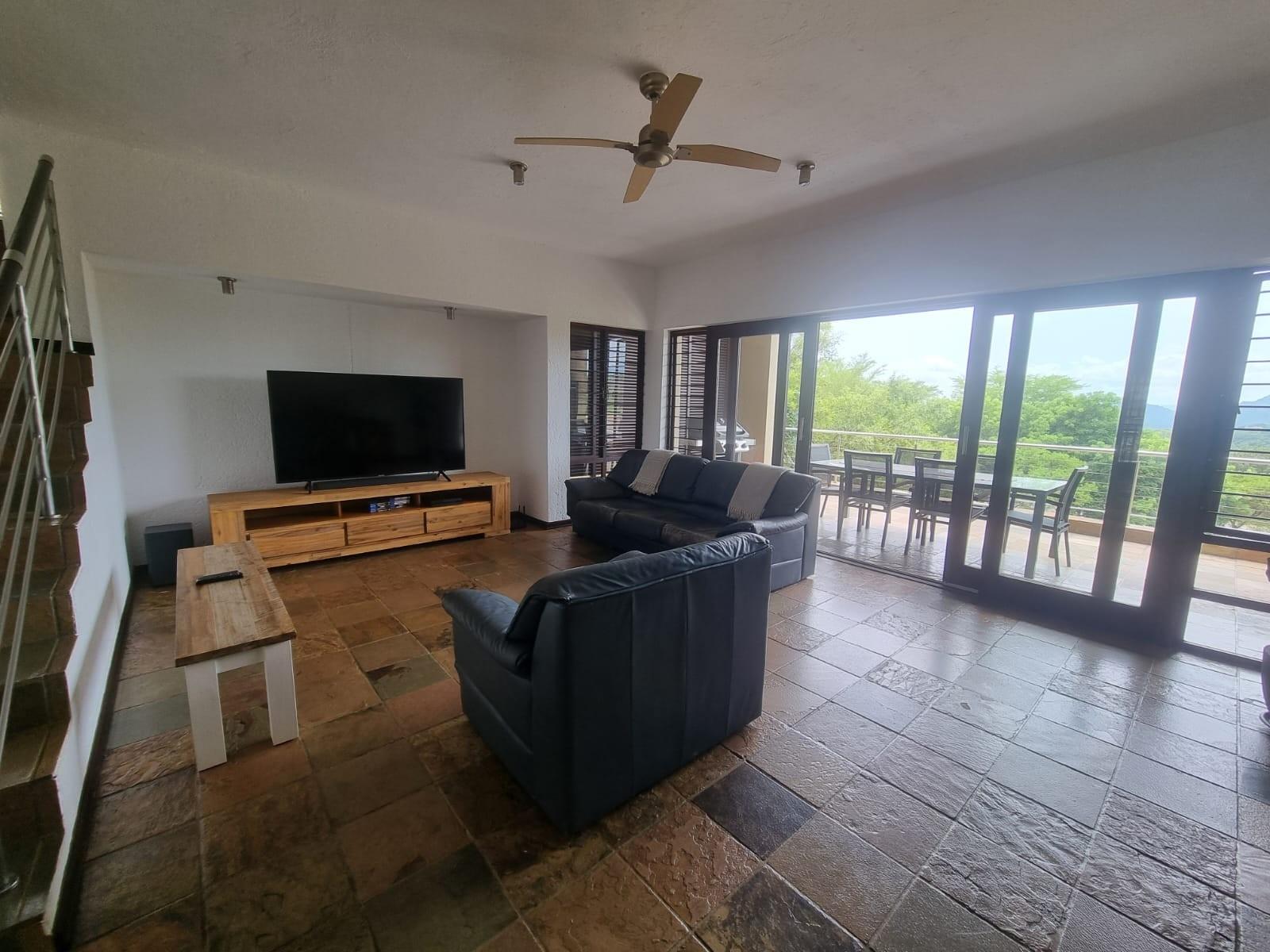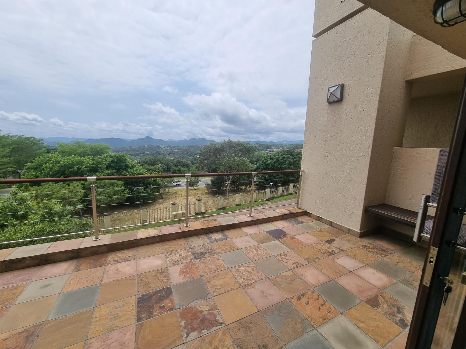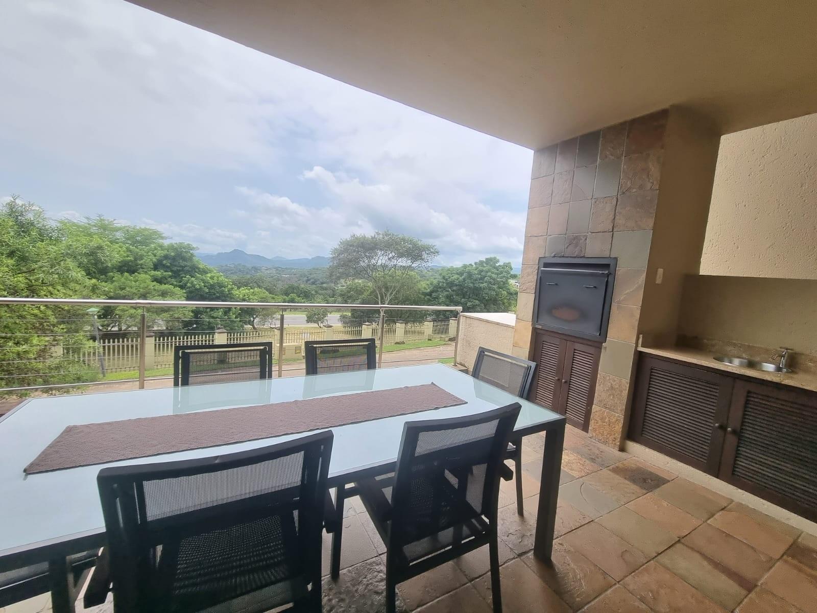 The wide pivot style front door opens onto a small landing space that leads to a lovely open plan living area with a spacious lounge and balcony with built-in braai offering some of the best views of the lowveld.