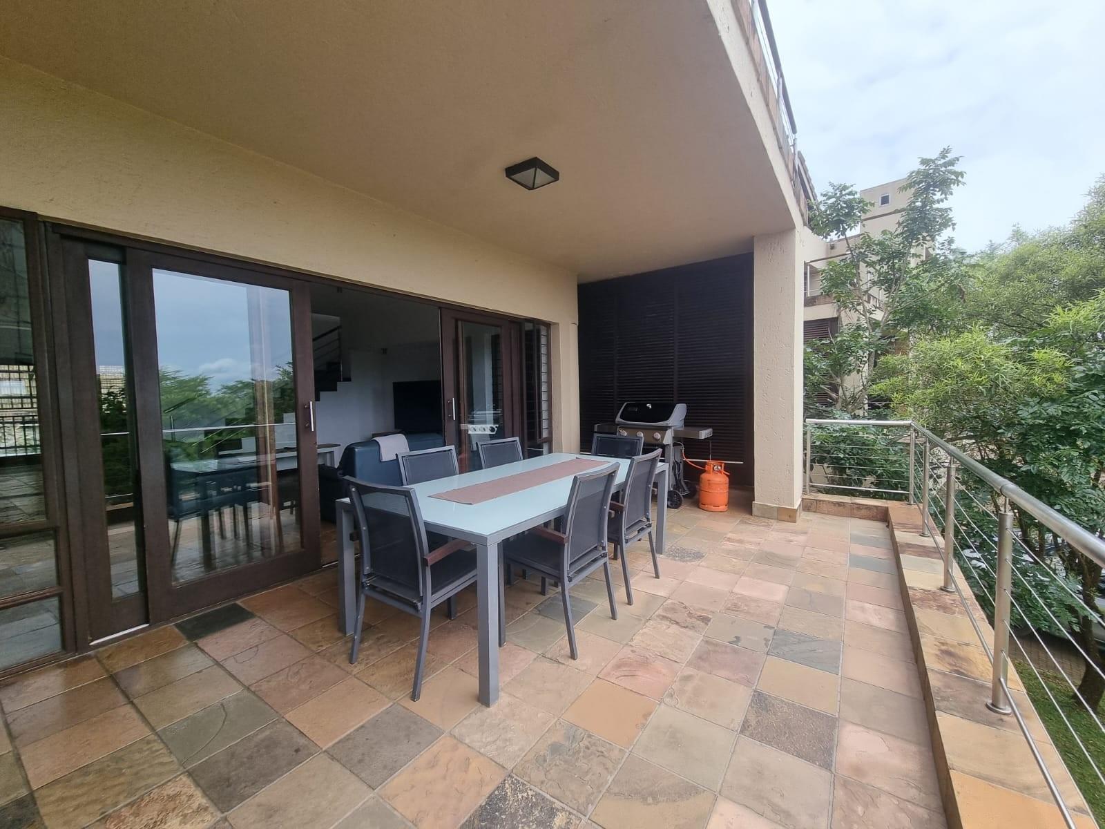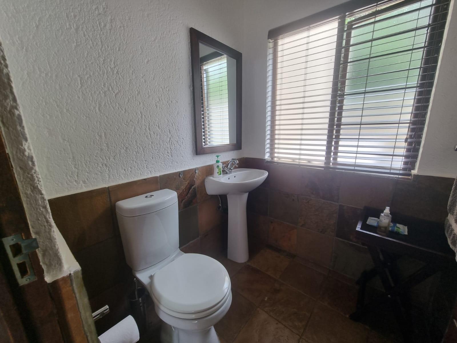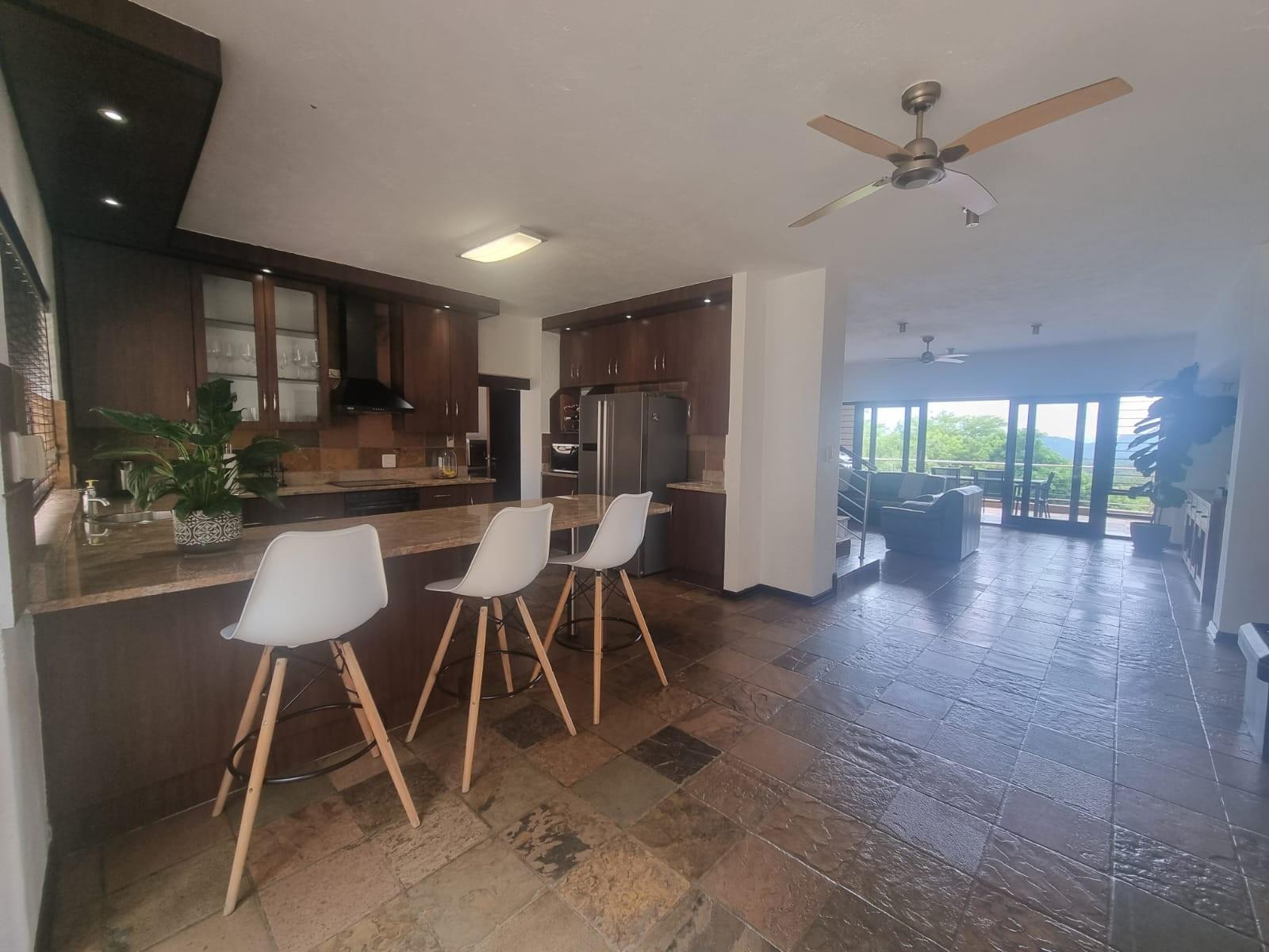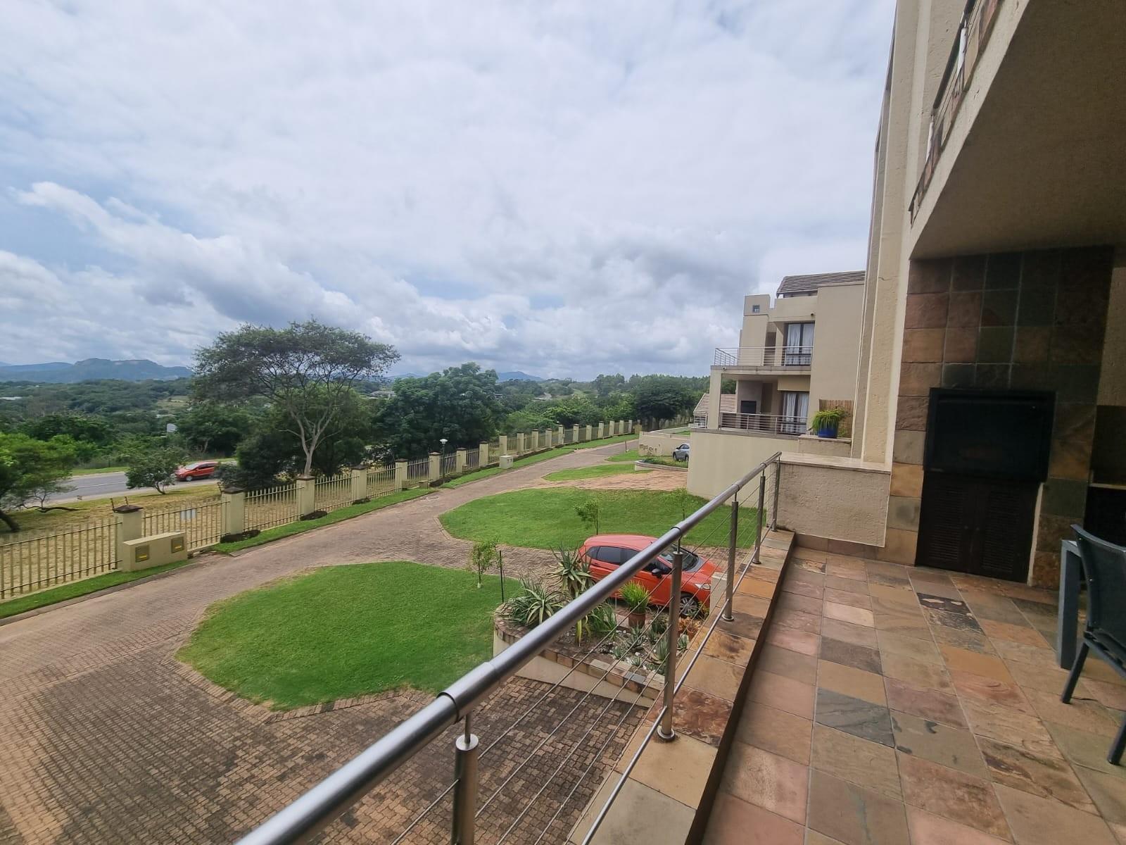 The wide pivot style front door opens onto a small landing space that leads to a lovely open plan living area with a spacious lounge and balcony with built-in braai offering some of the best views of the lowveld.