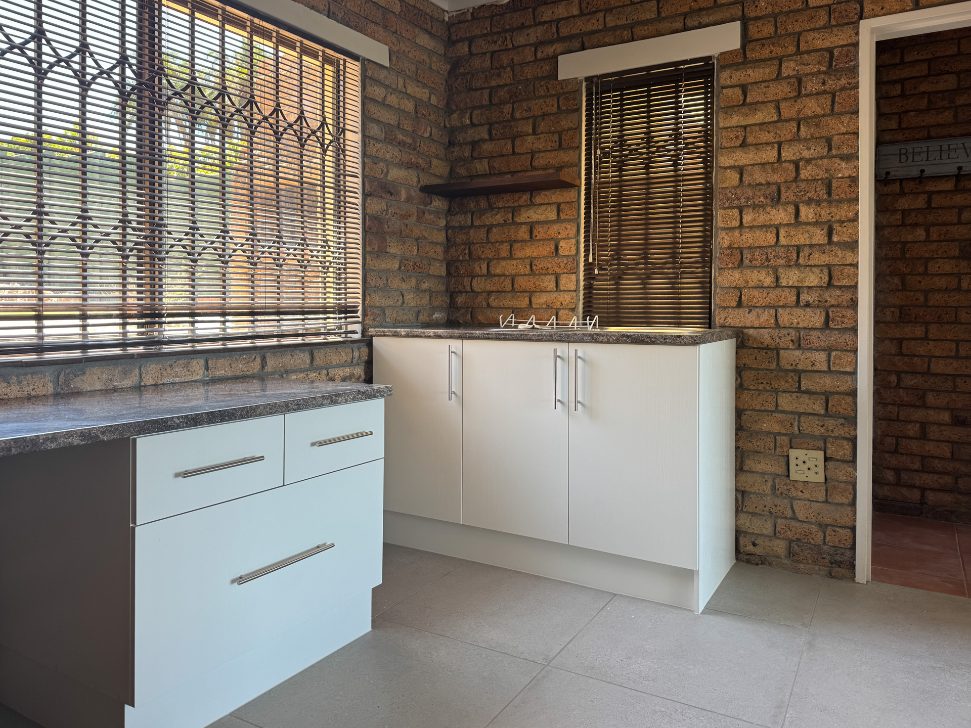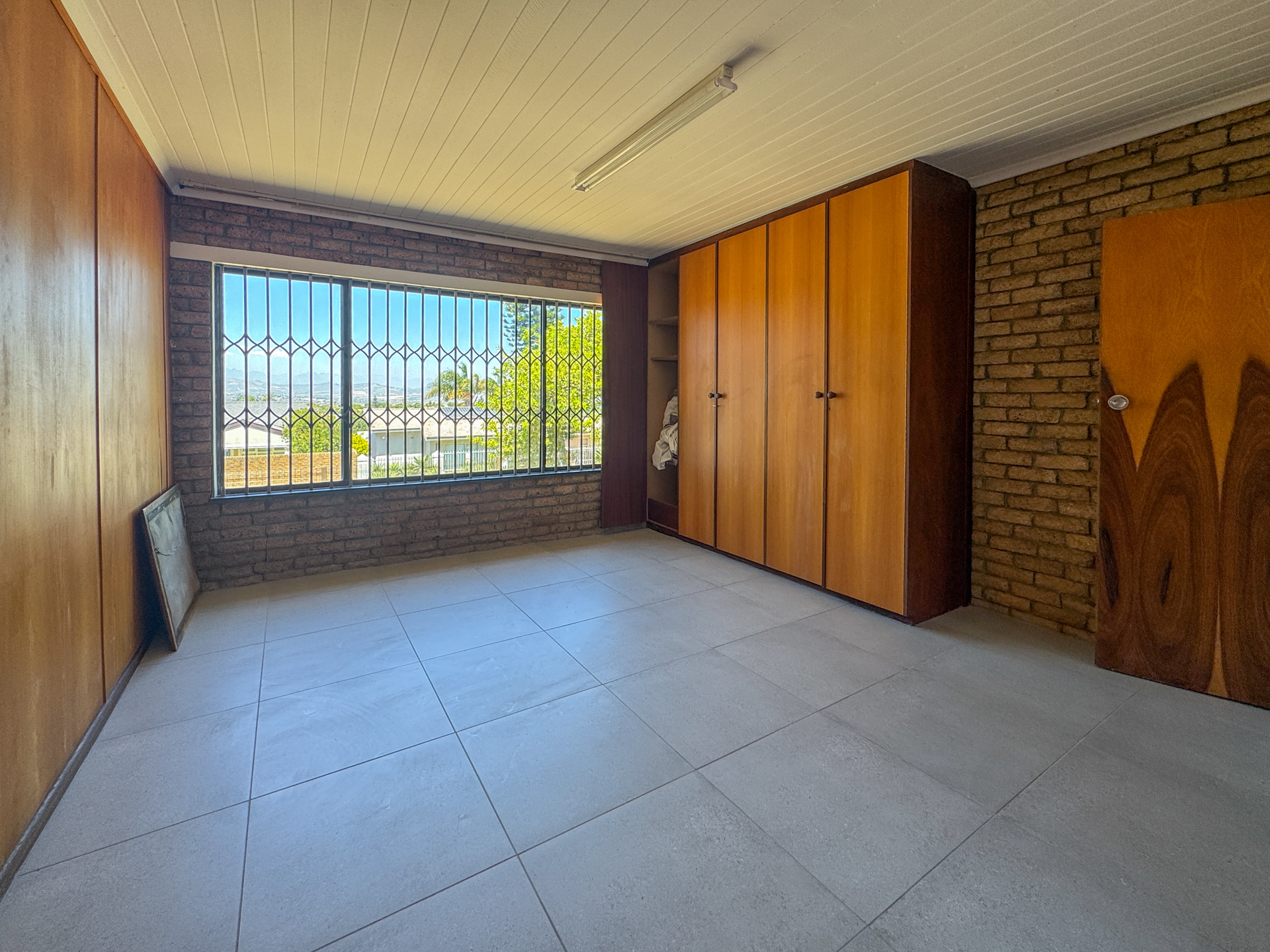 The main bedroom offers an en-suite bathroom, ample built-in cupboards, and sliding doors opening onto the backyard. The home is further equipped with a Geyserwise system and a solar geyser for improved energy efficiency.