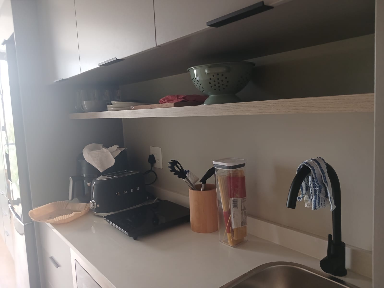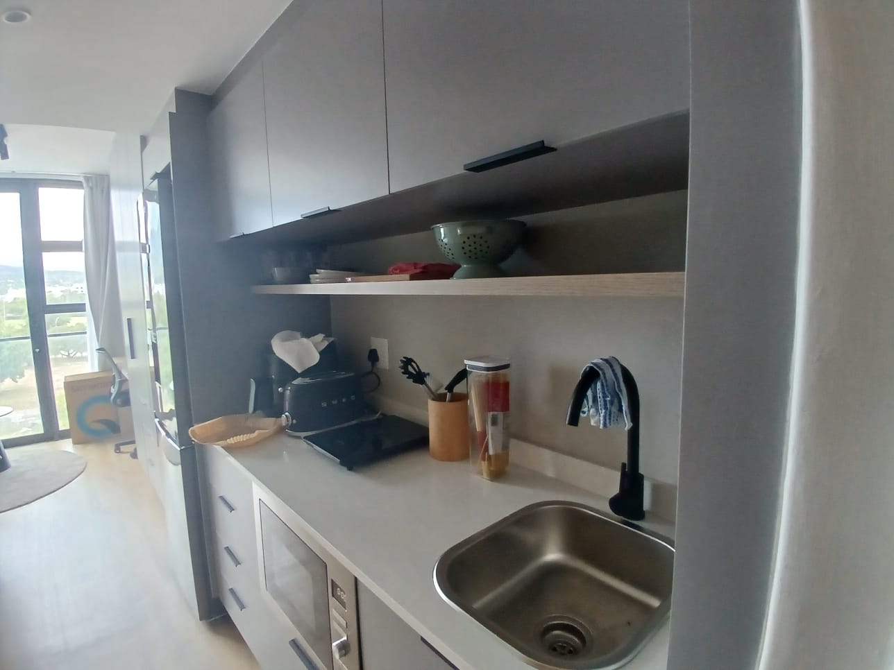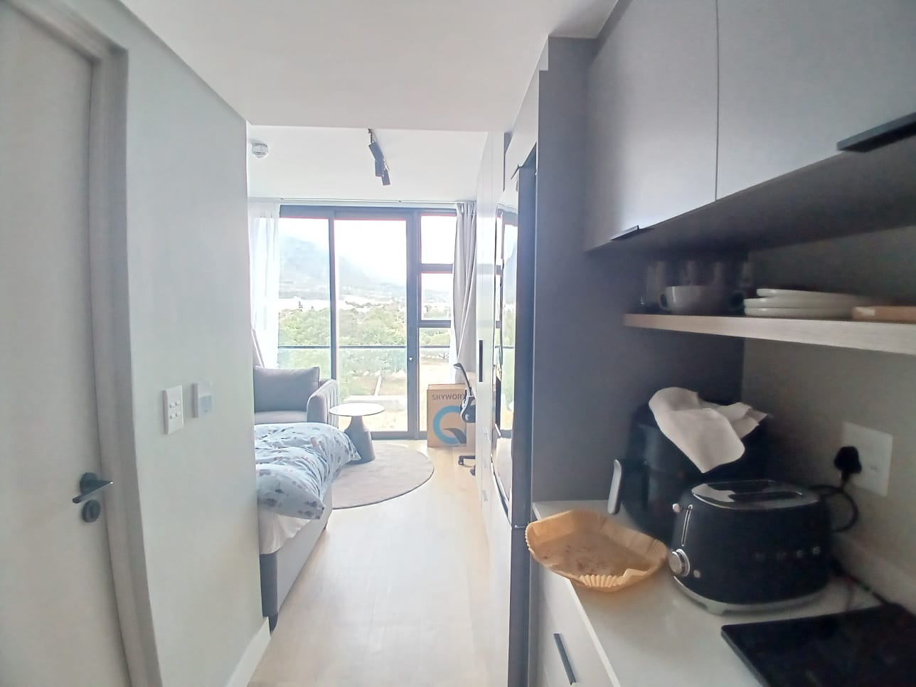 The unit includes a compact, fully equipped kitchen with a stove and fridge, as well as a modern bathroom with a shower. In addition, residents have access to a separate communal kitchen where you can cook to your heart’s content.