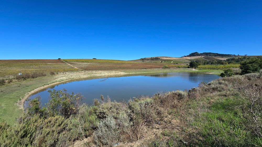 Irrigation water is drawn from a large farm dam with a capacity of about 79 million litres, and potable water is supplied from a natural spring situated on the farm.