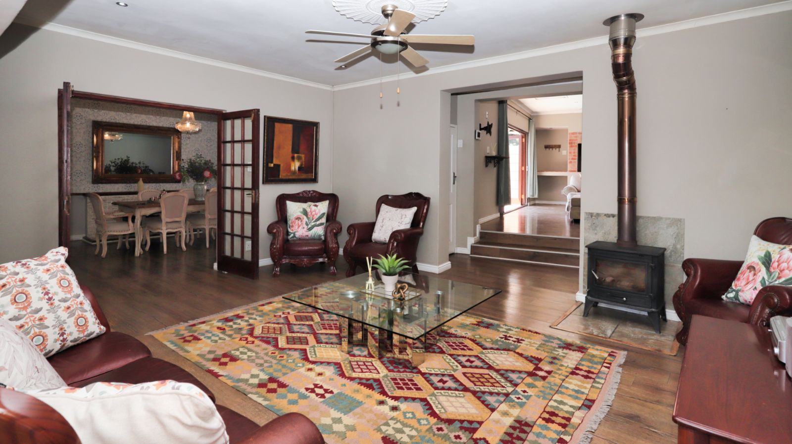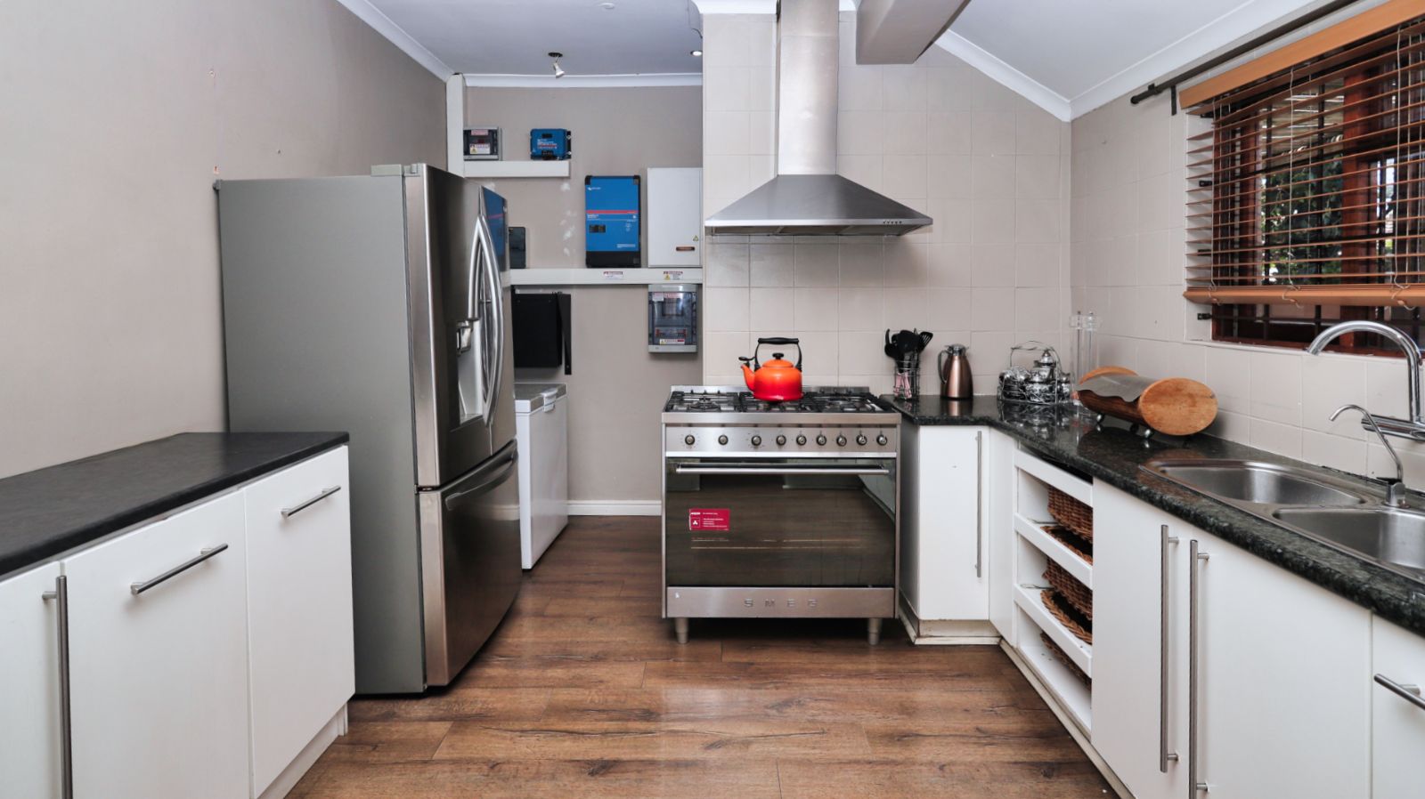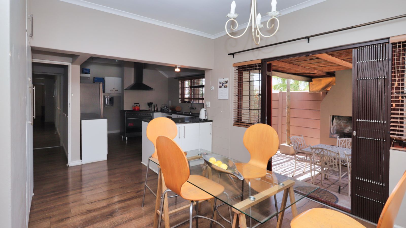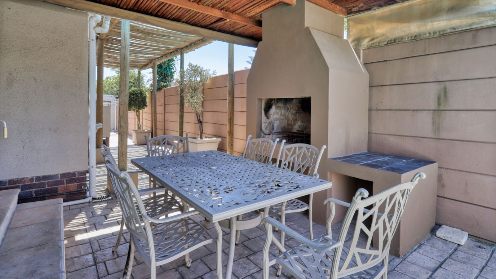 The kitchen is positioned separately from the main living areas and offers ample cupboard space, a pantry and a Smeg gas stove and oven. From the kitchen you walk out onto a covered patio with a built in braai, providing another comfortable entertainment area.