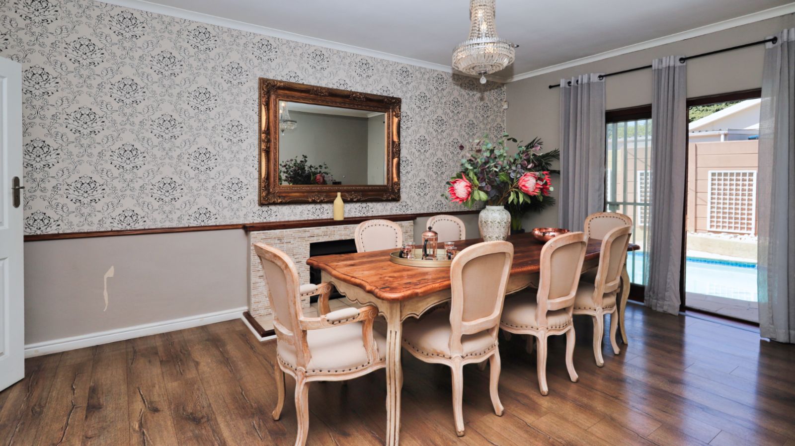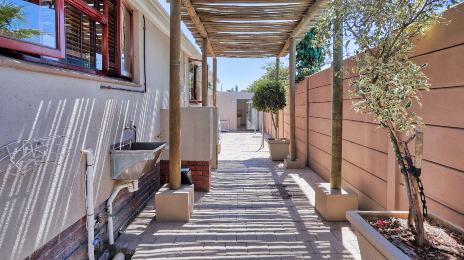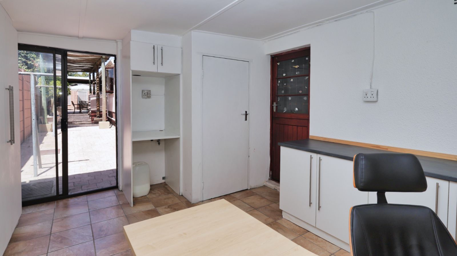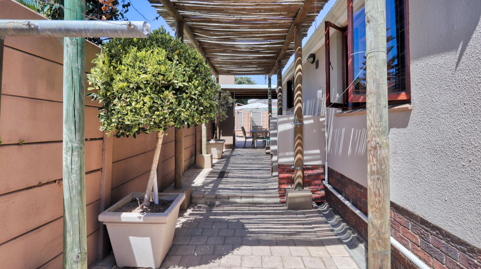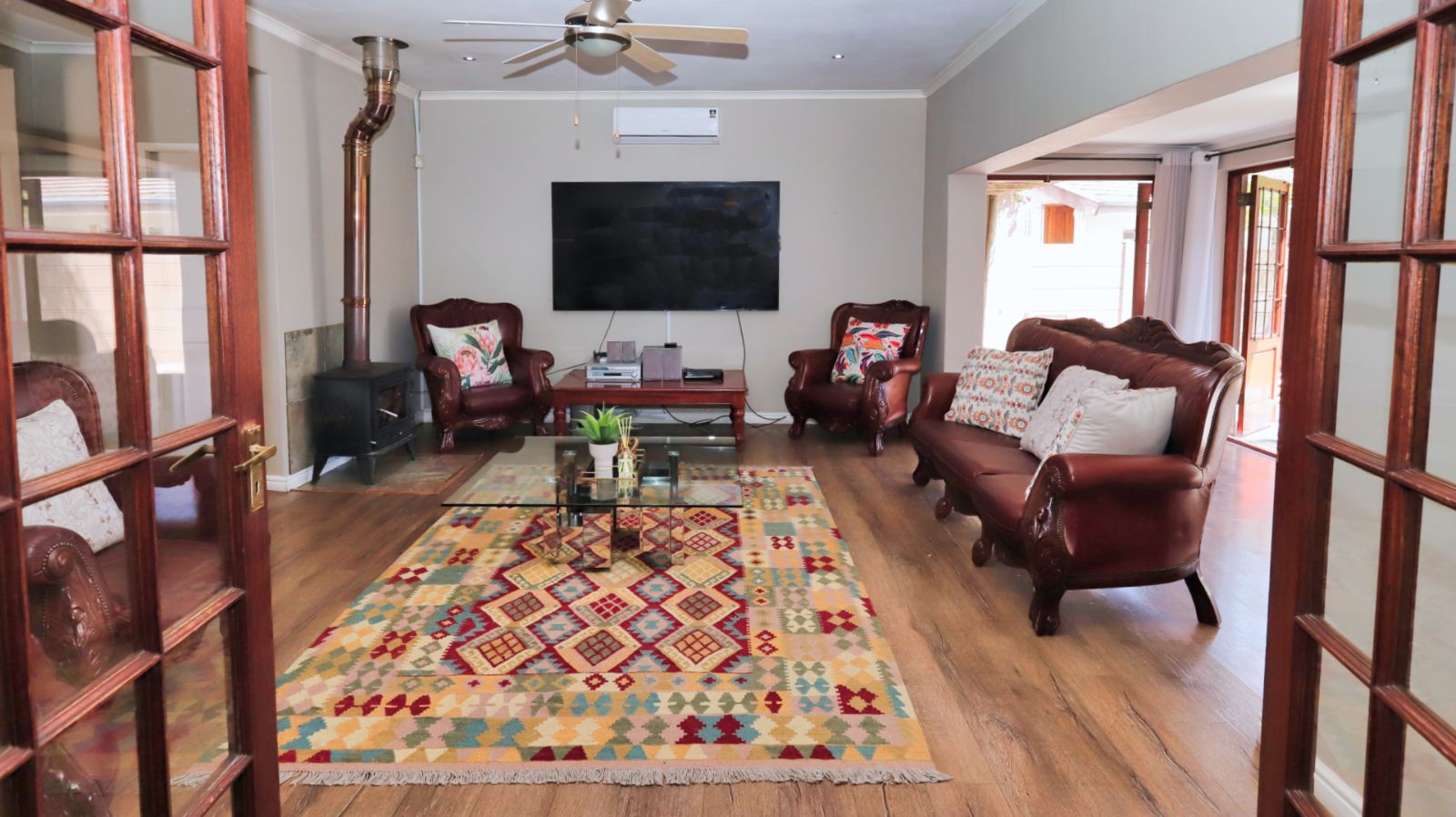 The kitchen is positioned separately from the main living areas and offers ample cupboard space, a pantry and a Smeg gas stove and oven. From the kitchen you walk out onto a covered patio with a built in braai, providing another comfortable entertainment area.