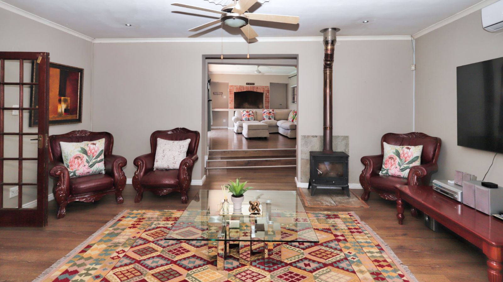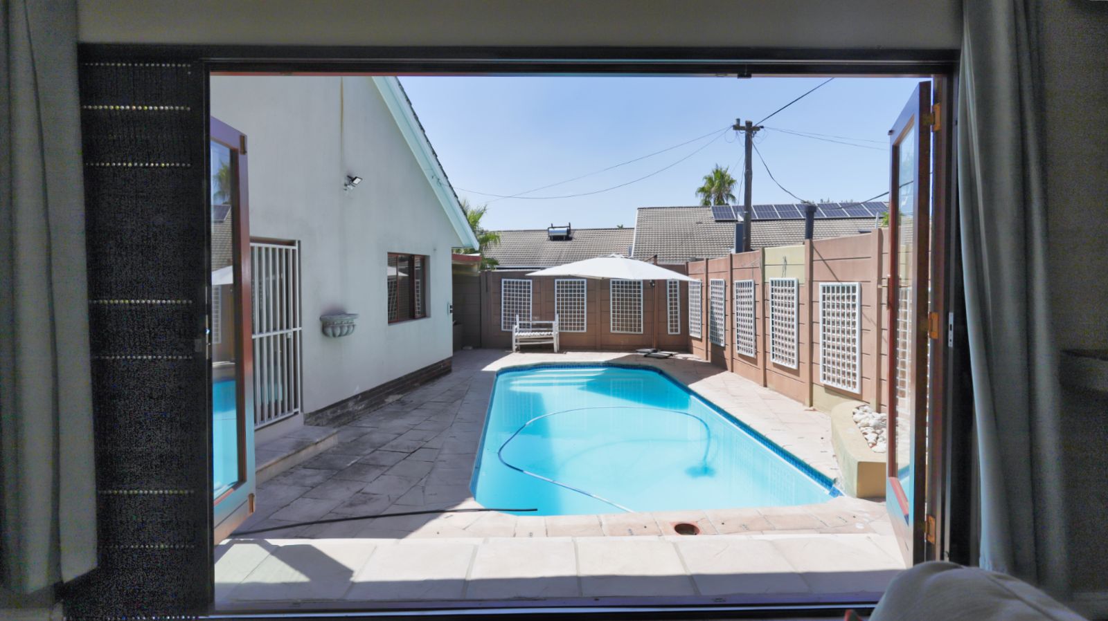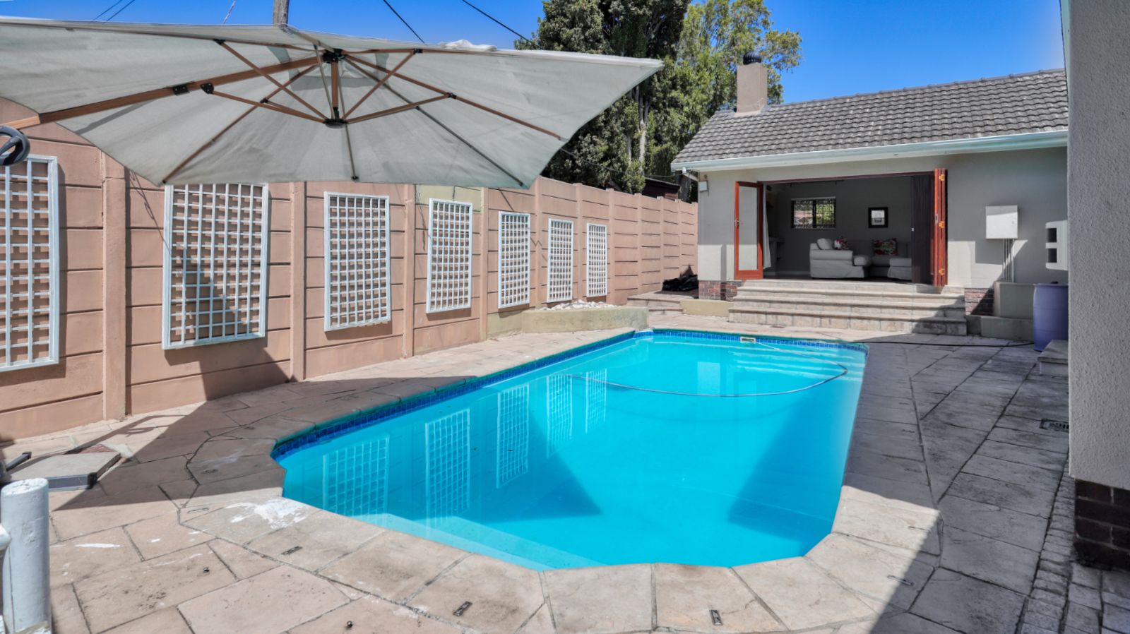 Moving through the home, the family TV room leads into a second lounge with a built in braai. Stacker doors open from this room to the pool area, creating an easy indoor outdoor flow and a great space for entertaining.