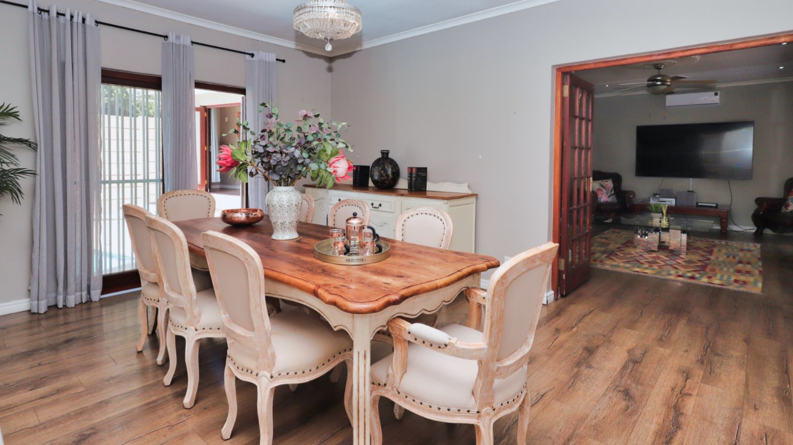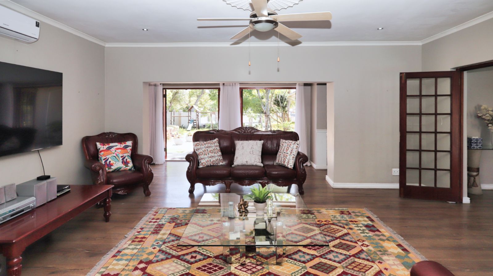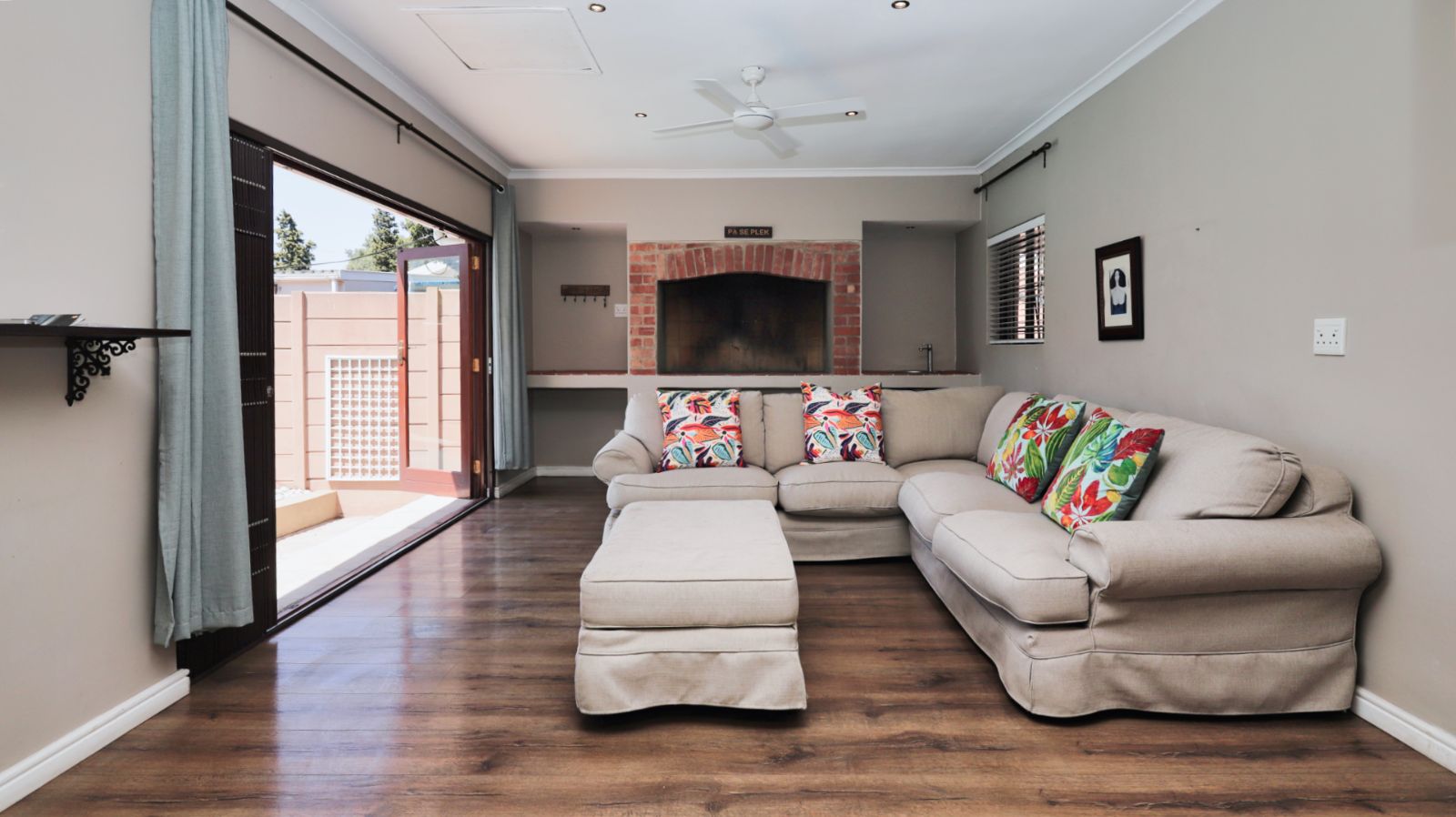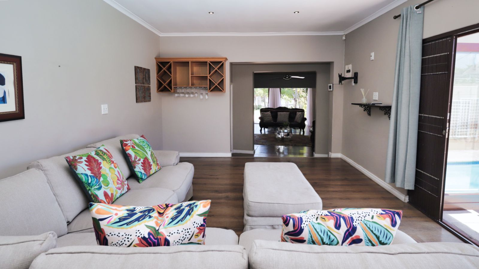 Moving through the home, the family TV room leads into a second lounge with a built in braai. Stacker doors open from this room to the pool area, creating an easy indoor outdoor flow and a great space for entertaining.