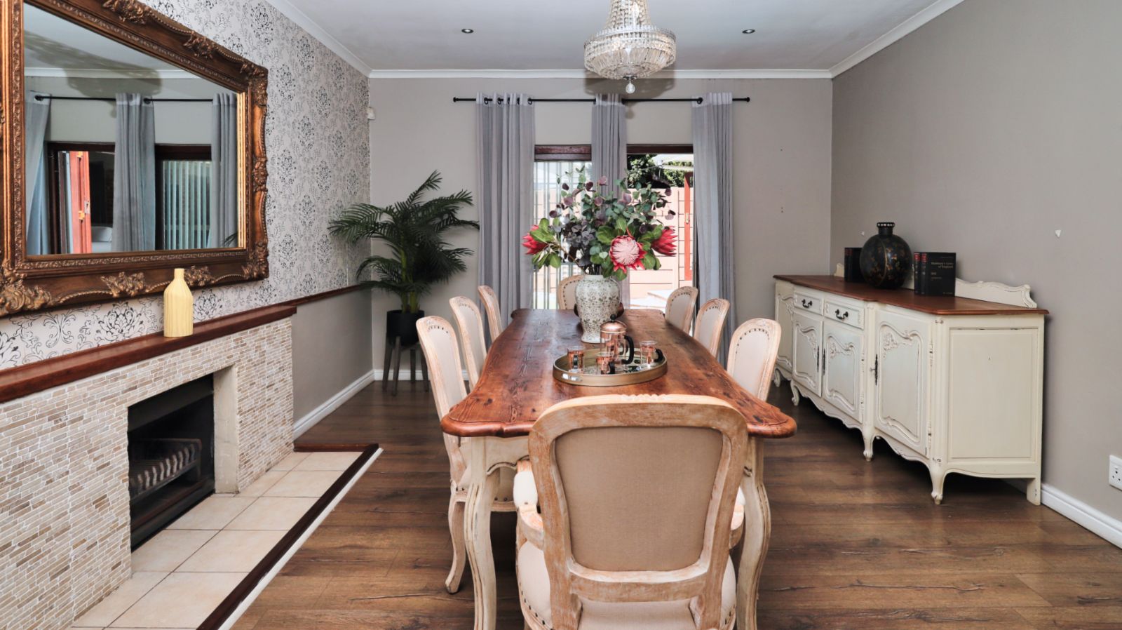 A landscaped front garden and walkway lead to the entrance of the home. As you step inside you are welcomed by the dining room and family TV room, both featuring fireplaces that add warmth and character to the space.
