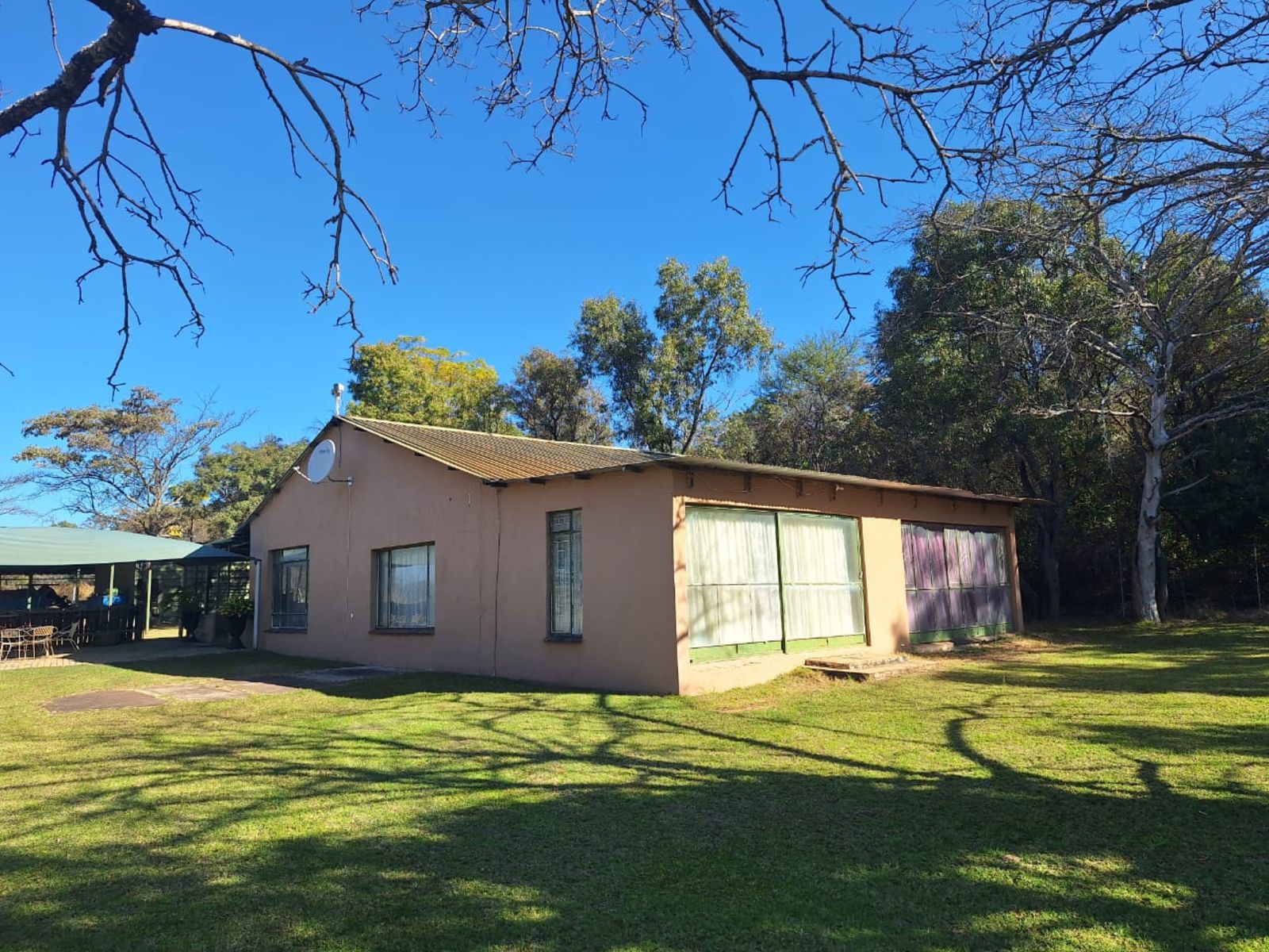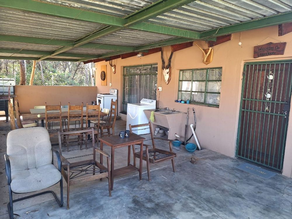 The charming 4-bedroom farmhouse includes a spacious veranda and braai area with panoramic views of roaming game—perfect for relaxing with friends and family.
