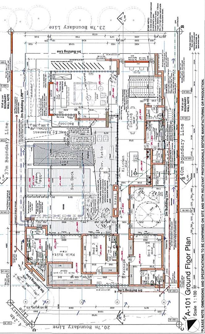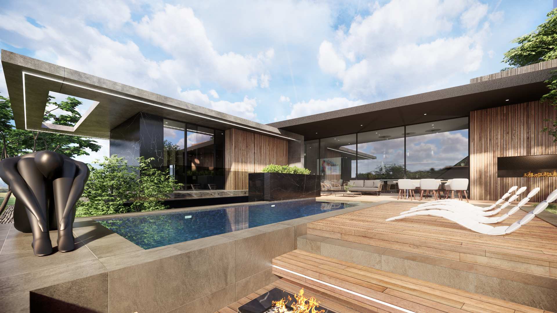 Timber screens with lovely strip lights, timber cladding on the outside of the home, and three garages with glass doors just make you feel like you are in another time. The flat roof has circular holes in the slab and a void for architectural reasons the shutters on the balcony are there to break any access sun