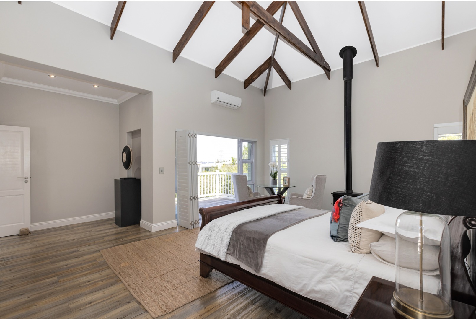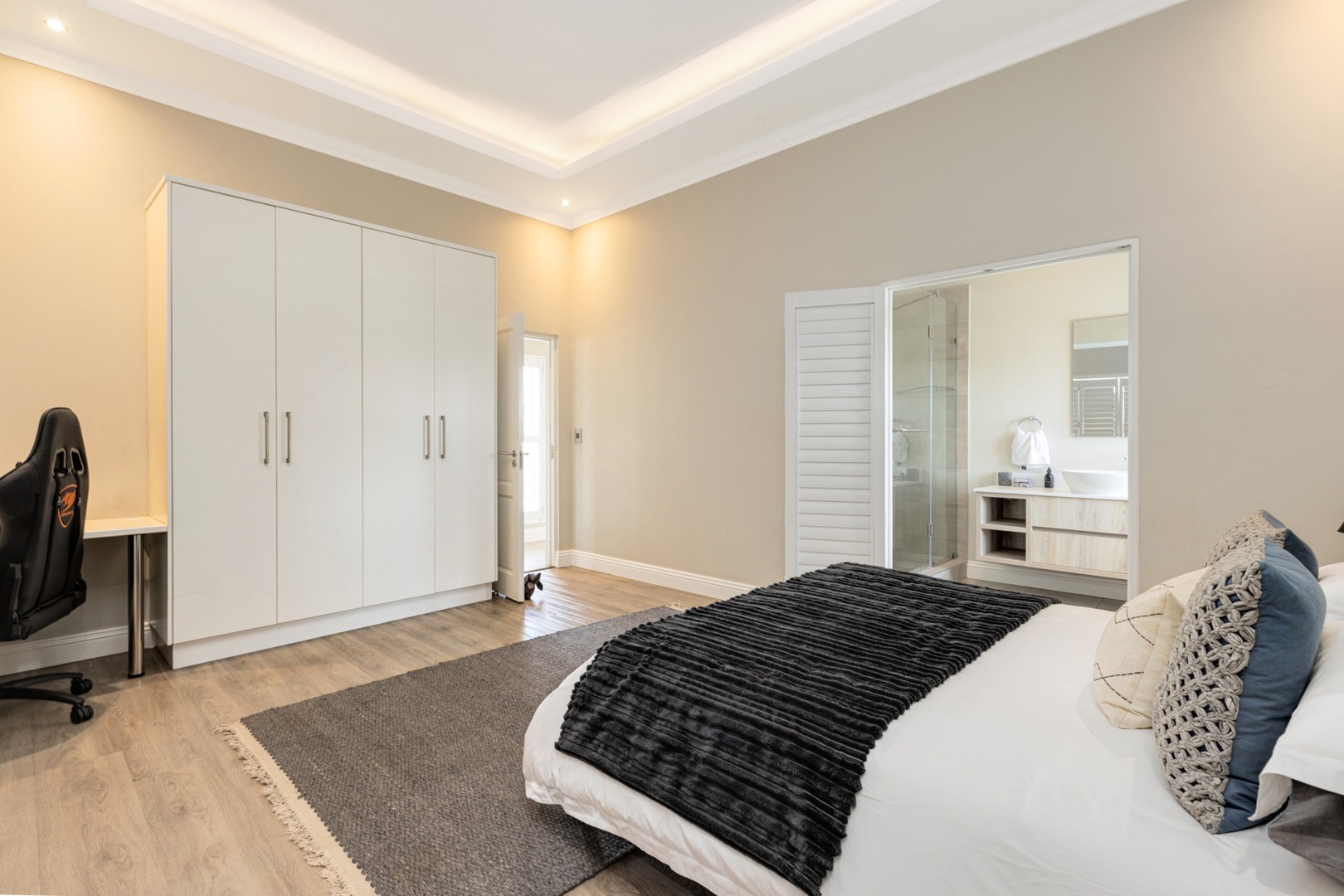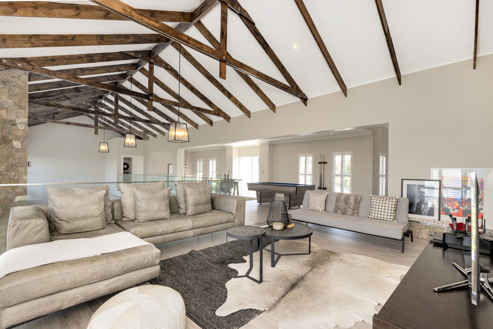 Upstairs - three bedrooms all en-suite include a luxurious master suite with balcony, fireplace, spacious walk-in closets and spa-inspired bathroom with outside shower. Pyjama lounge with gas fireplace and open study. Walk-in linen cupboard.