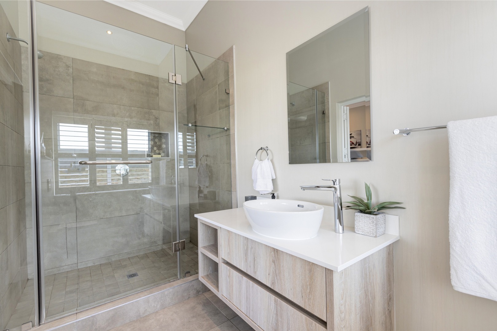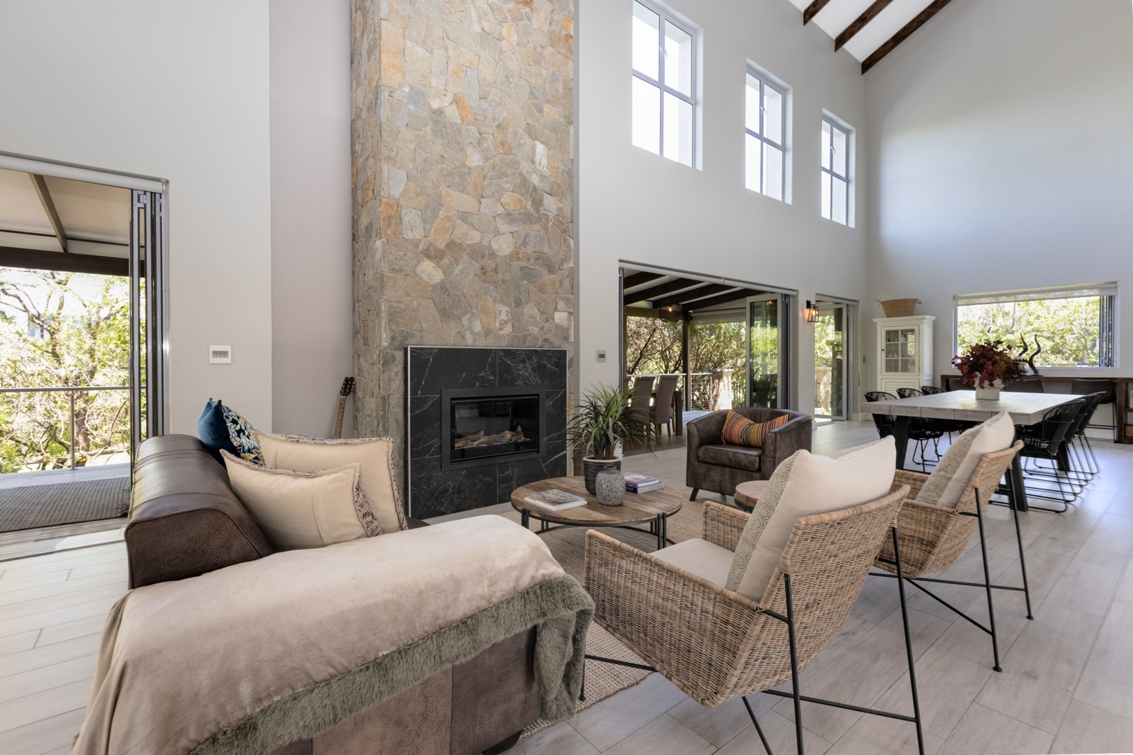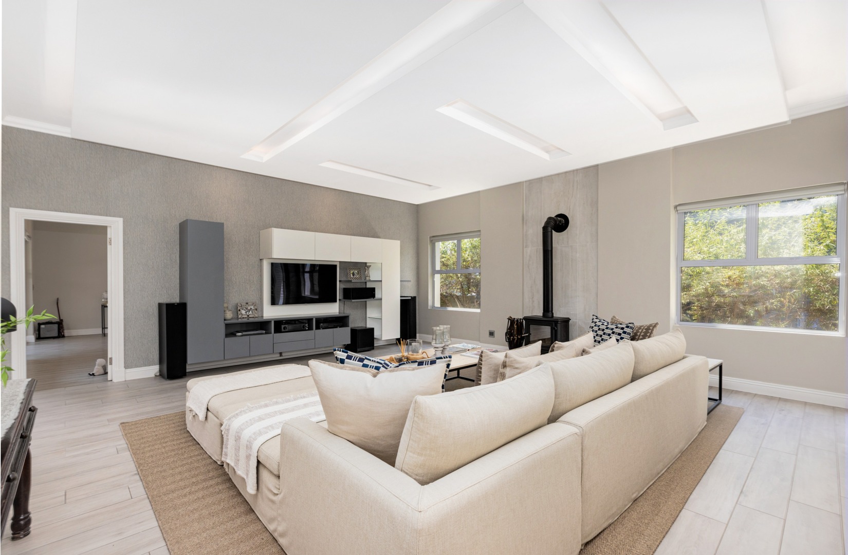 Upstairs - three bedrooms all en-suite include a luxurious master suite with balcony, fireplace, spacious walk-in closets and spa-inspired bathroom with outside shower. Pyjama lounge with gas fireplace and open study. Walk-in linen cupboard.
