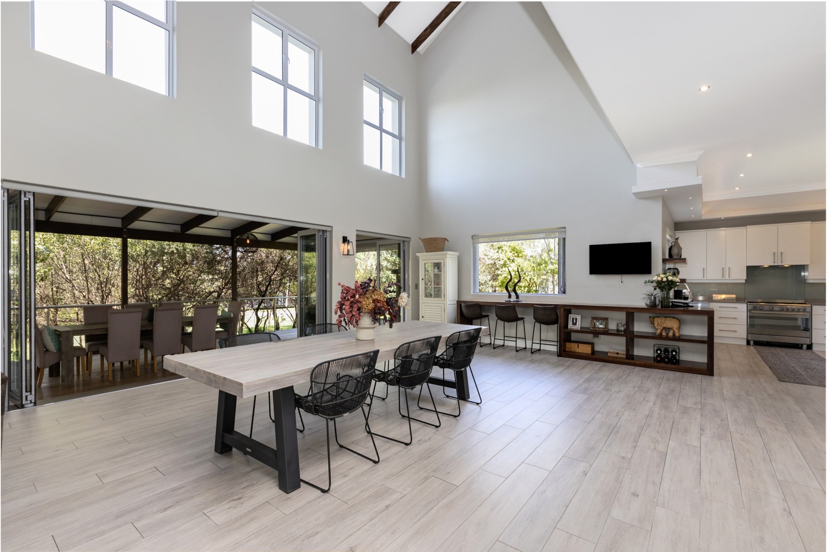 Venture downstairs to the ground level an open plan family room, formal lounge with gas fireplace with stone cladding and a dining room. Gourmet eat-in Kitchen with garden views with separate laundry and scullery. This entire space opens up to a greenbelt and covered outdoor entertainers patio with build in gas braai, swimming-pool and bar