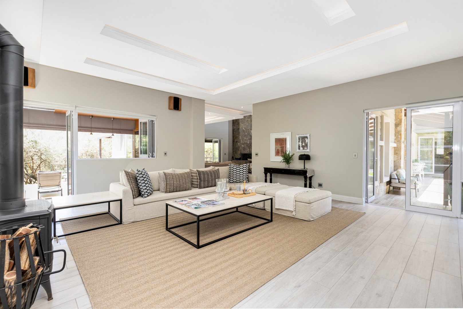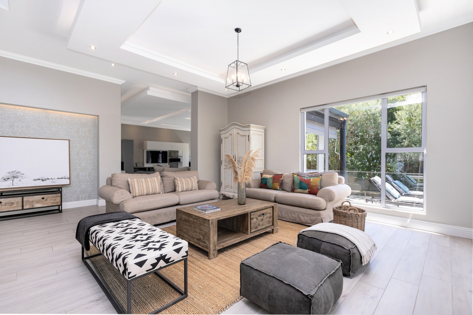 Complementing this beauty, the architecture and interior of the home are refreshingly contemporary, while exuding a welcoming ambience. As you enter through the double doors you immediately get captured by the grand yet comfortable spaces and exquisite double volume ceilings with exposed beams of the residence.
