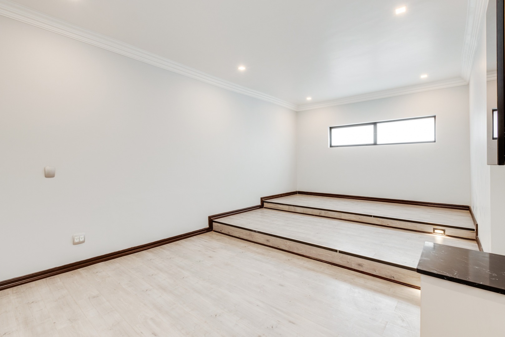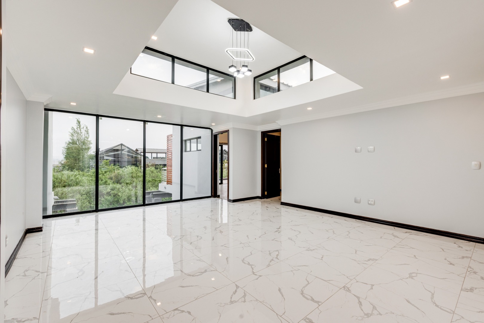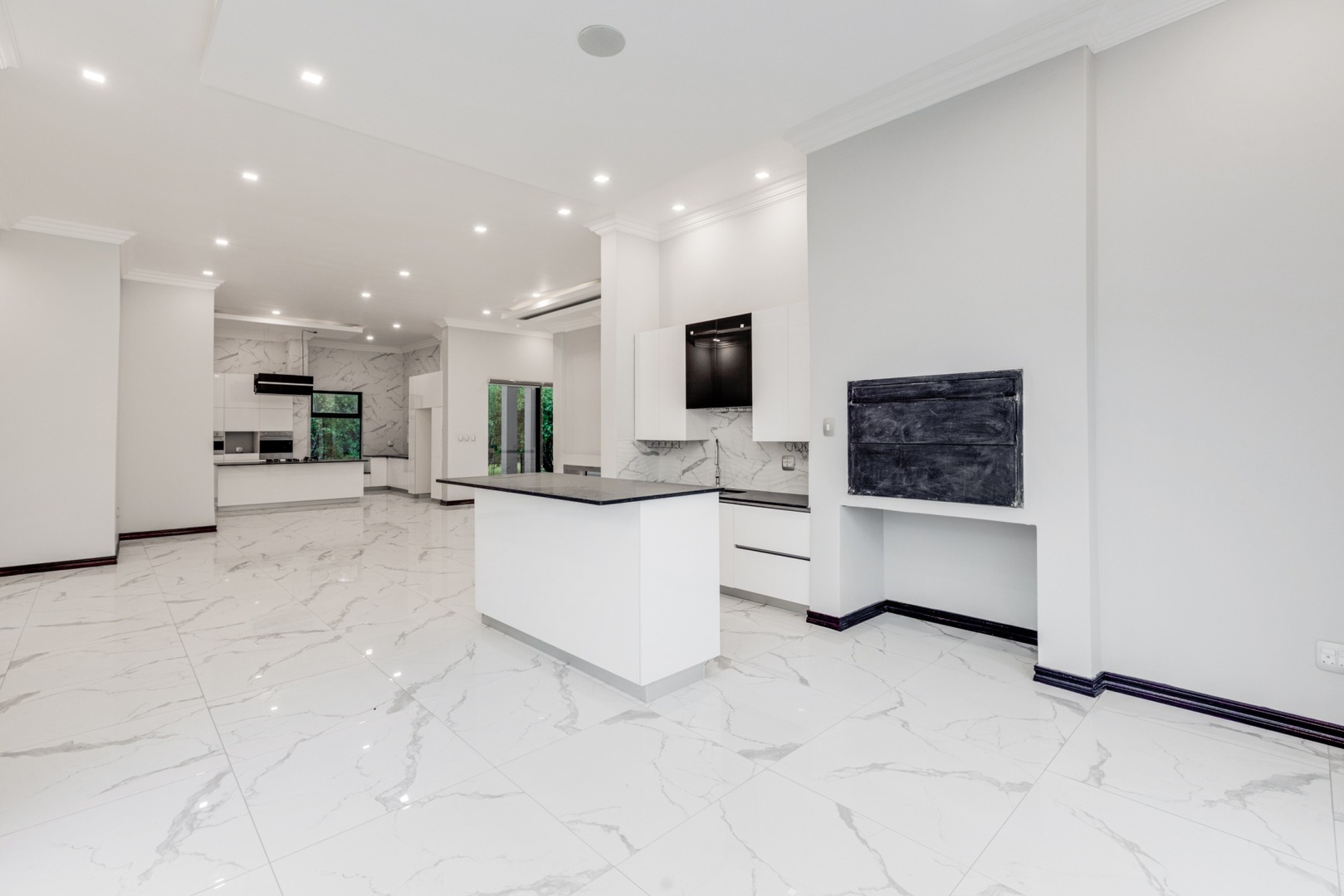 A beautiful 5-bed north-facing home with double volume entrance hall, open-plan living and dining area, placed around a double-sided gas fireplace. An indoor built-in bar counter with a place for an under-counter fridge. The drinks cabinet and braai area with glass sliding doors lead to the swimming pool area.
