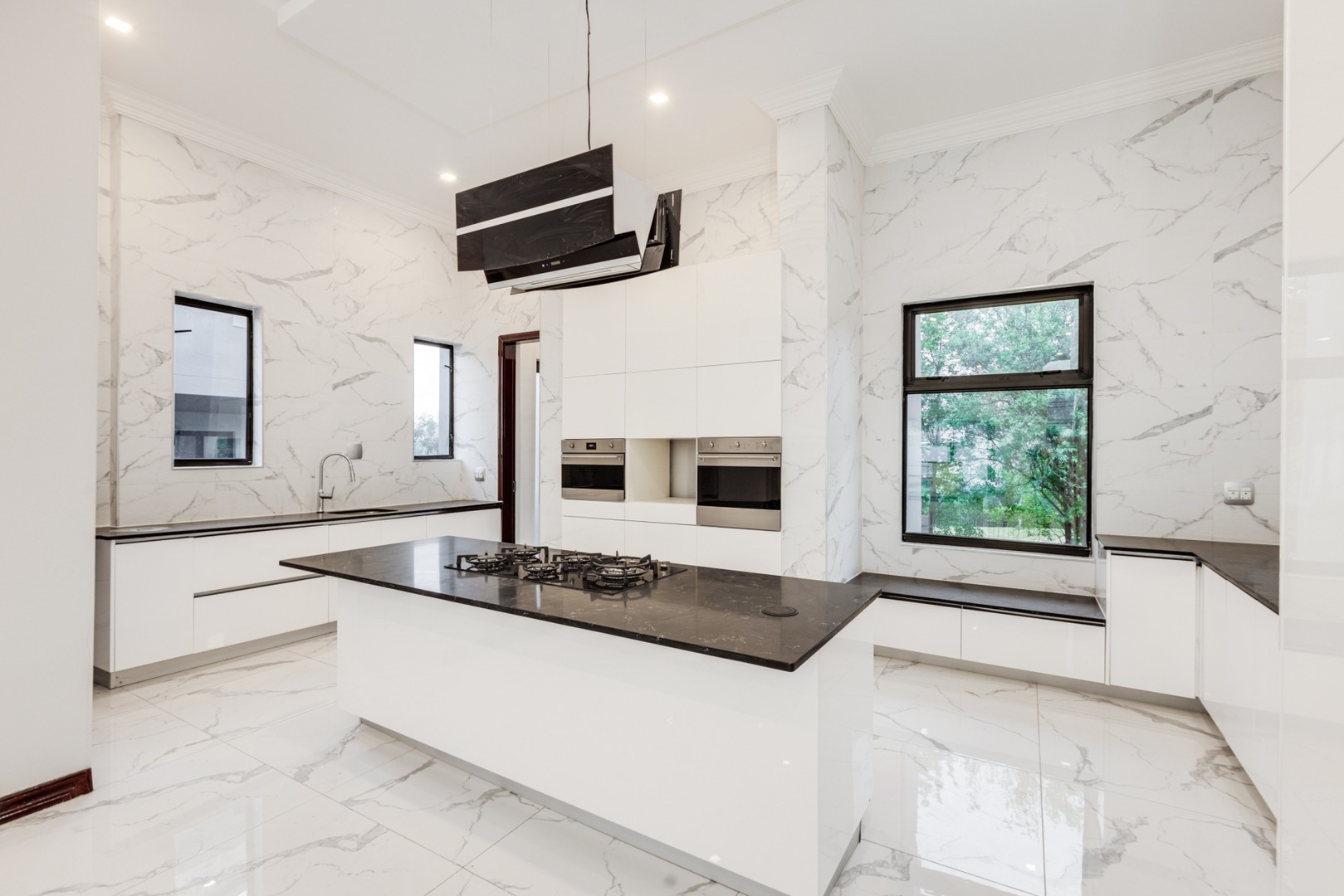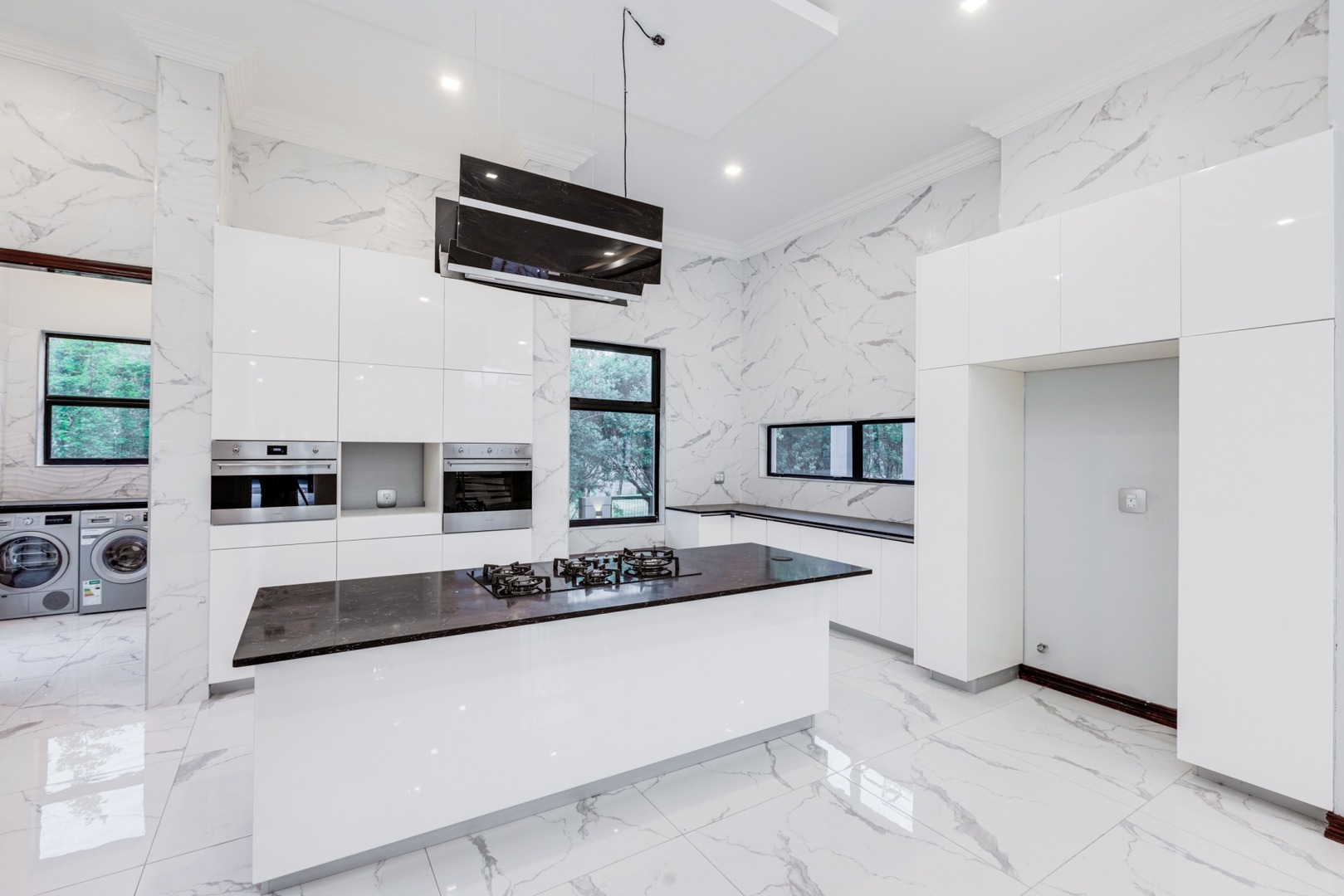The modern open-plan kitchen has ample cupboard space, fitted with a central island and breakfast bar, gas hob, eye-level oven, and microwave as well as a prep bowl. Walk-in pantry, separate scullery, and laundry room - with gas hob, washing machine, tumble dryer, and dishwasher.