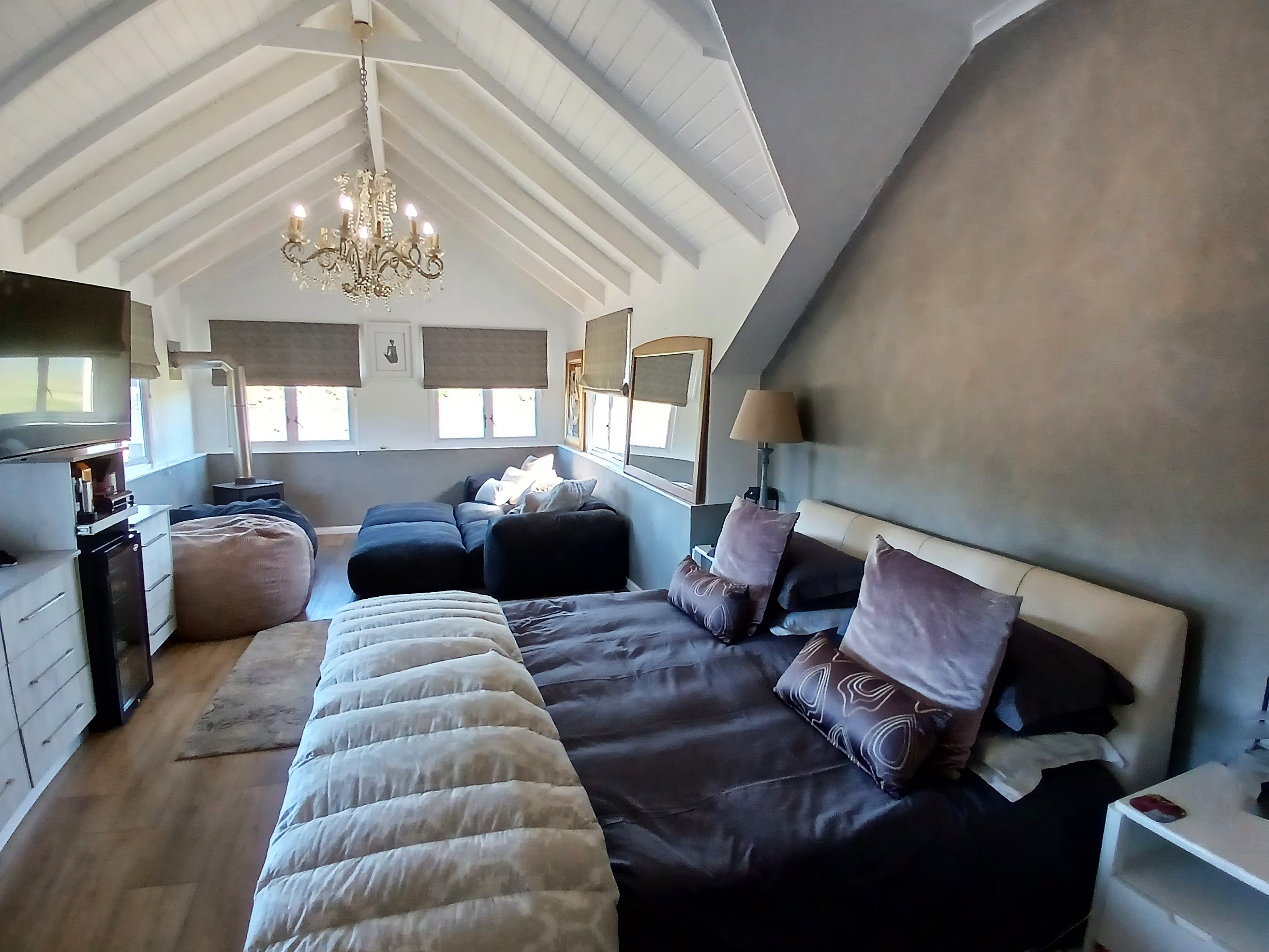 A separate one-bedroom flat overlooks the inviting pool area, complete with a pool house and lush gardens. This property also features a robust 13KVA solar system, ensuring energy efficiency and sustainability.