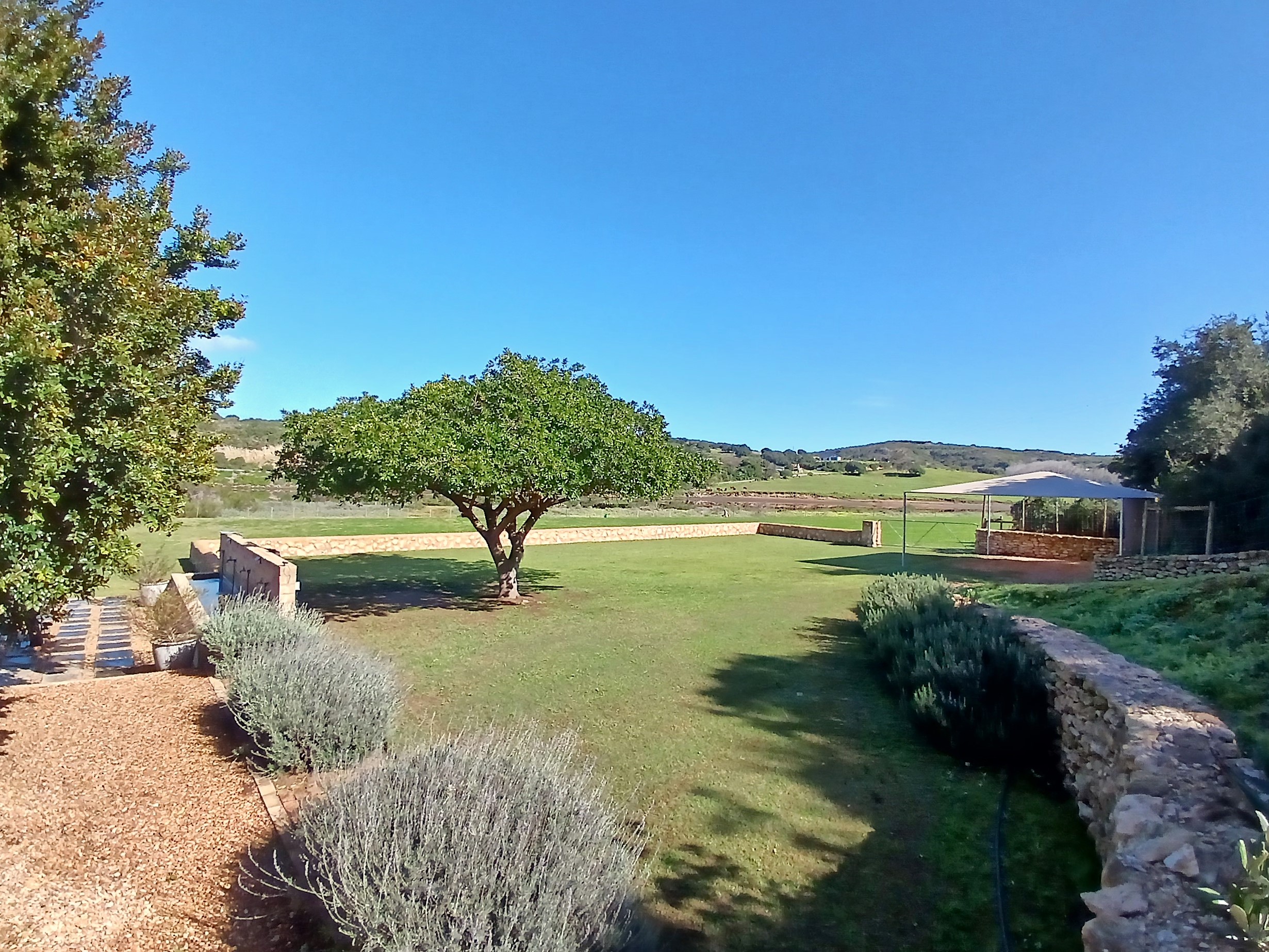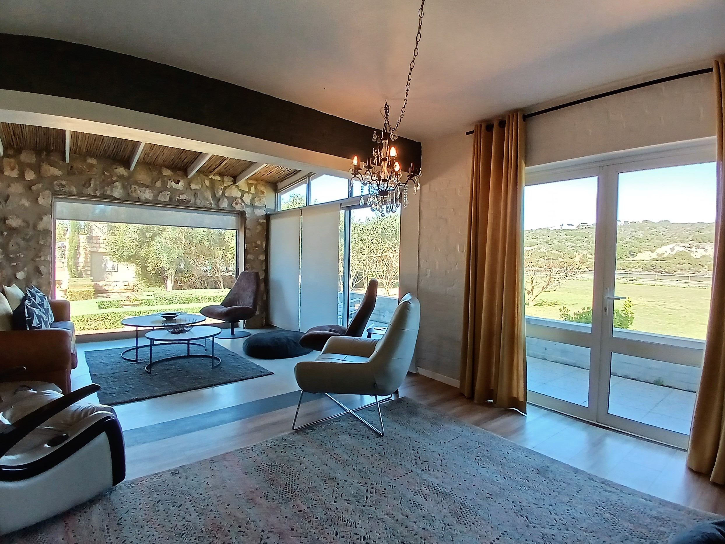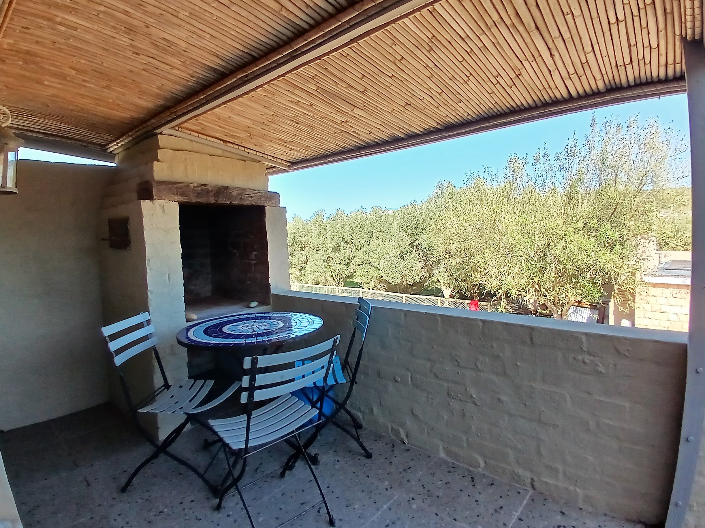 The main house offers three spacious bedrooms and two exquisitely appointed bathrooms. An open-plan living area and kitchen are accentuated by a charming dual-sided fireplace, creating a cozy ambiance in both spaces. Characteristic Spanish reed ceilings and beautiful stone walls add to the home's allure, while large windows provide uninterrupted views of the tranquil river.