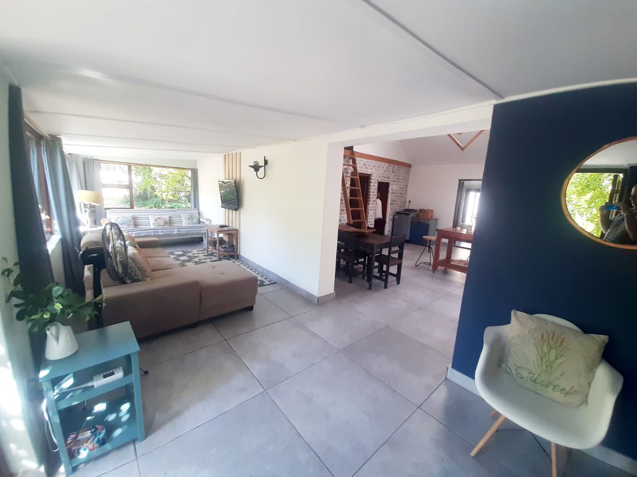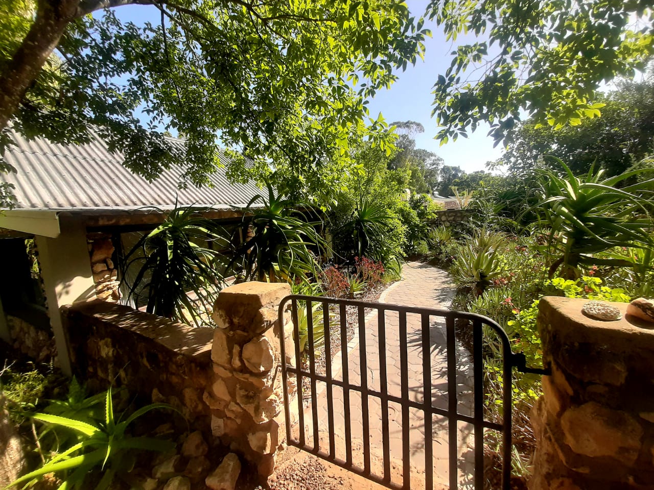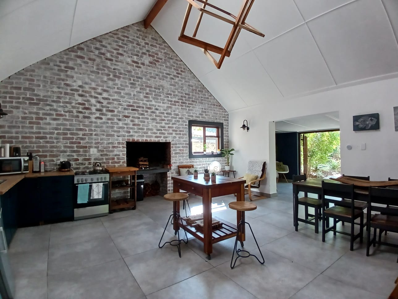 The heart of the cottage is the open-plan living area, complete with an indoor braai, creating a cozy atmosphere for shared moments. Step out onto the patio, adorned with the shade of graceful trees and overlooking a serene stream. Follow the pathway to discover an outdoor built-in braai area nestled beside the babbling stream, providing an enchanting setting for al fresco dining.