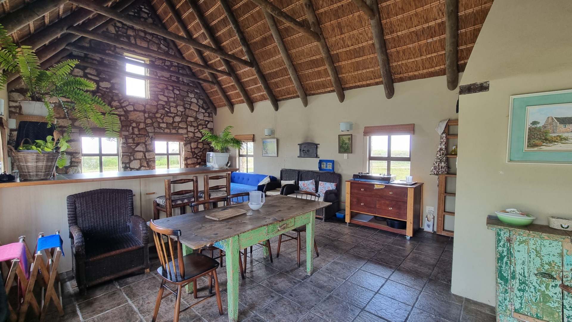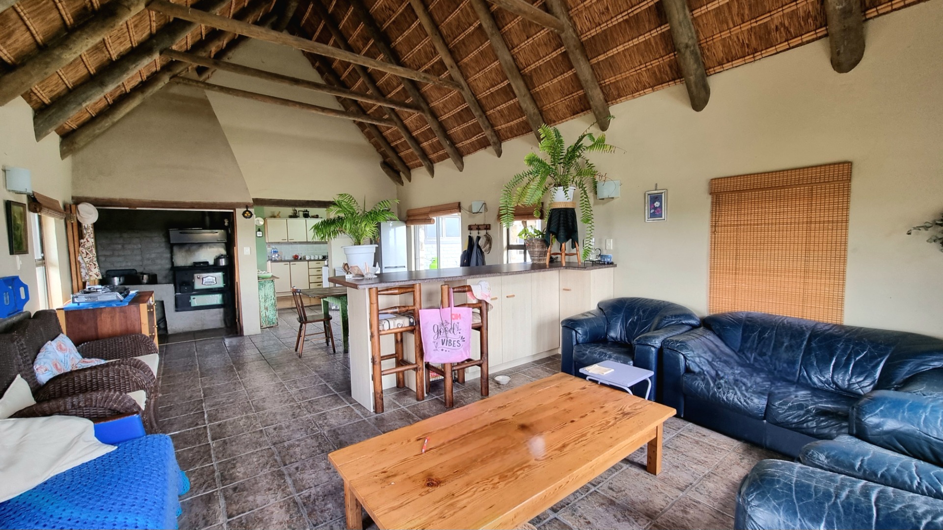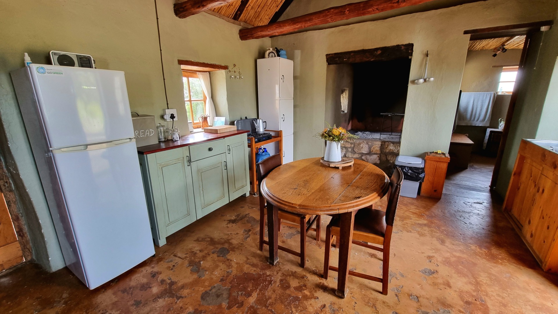Main House: Open plan kitchen, dining, and living room, 4 bedrooms, and 2 bathrooms. (Solar / Gas)