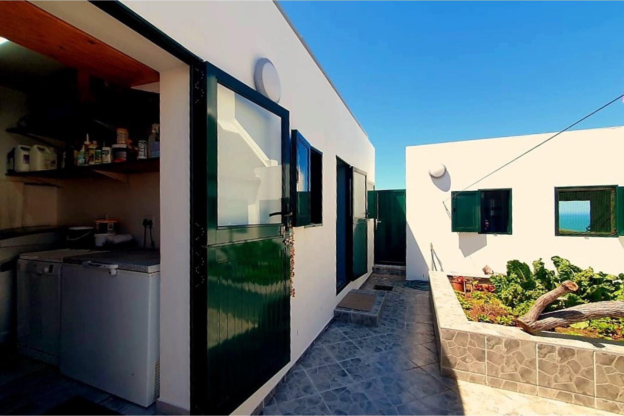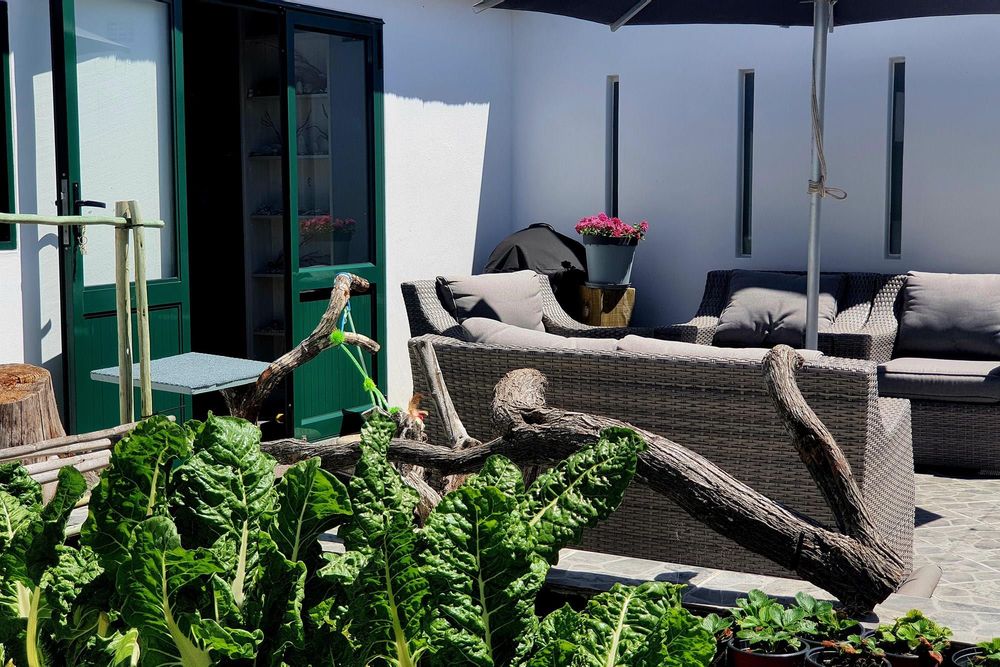 The kitchen and dining area extend effortlessly to an enclosed courtyard, creating an inviting space for entertainment and relaxation. This area includes a beautifully prepared space for growing fresh vegetables.