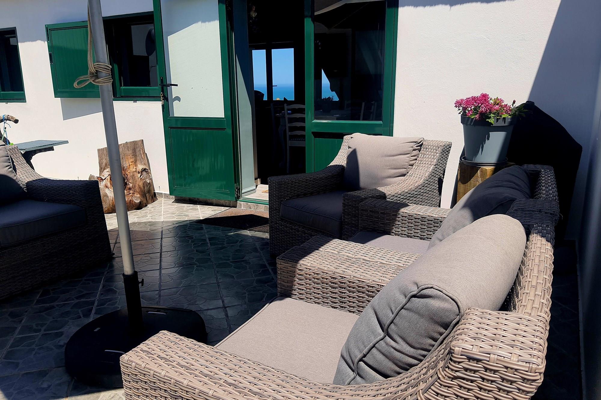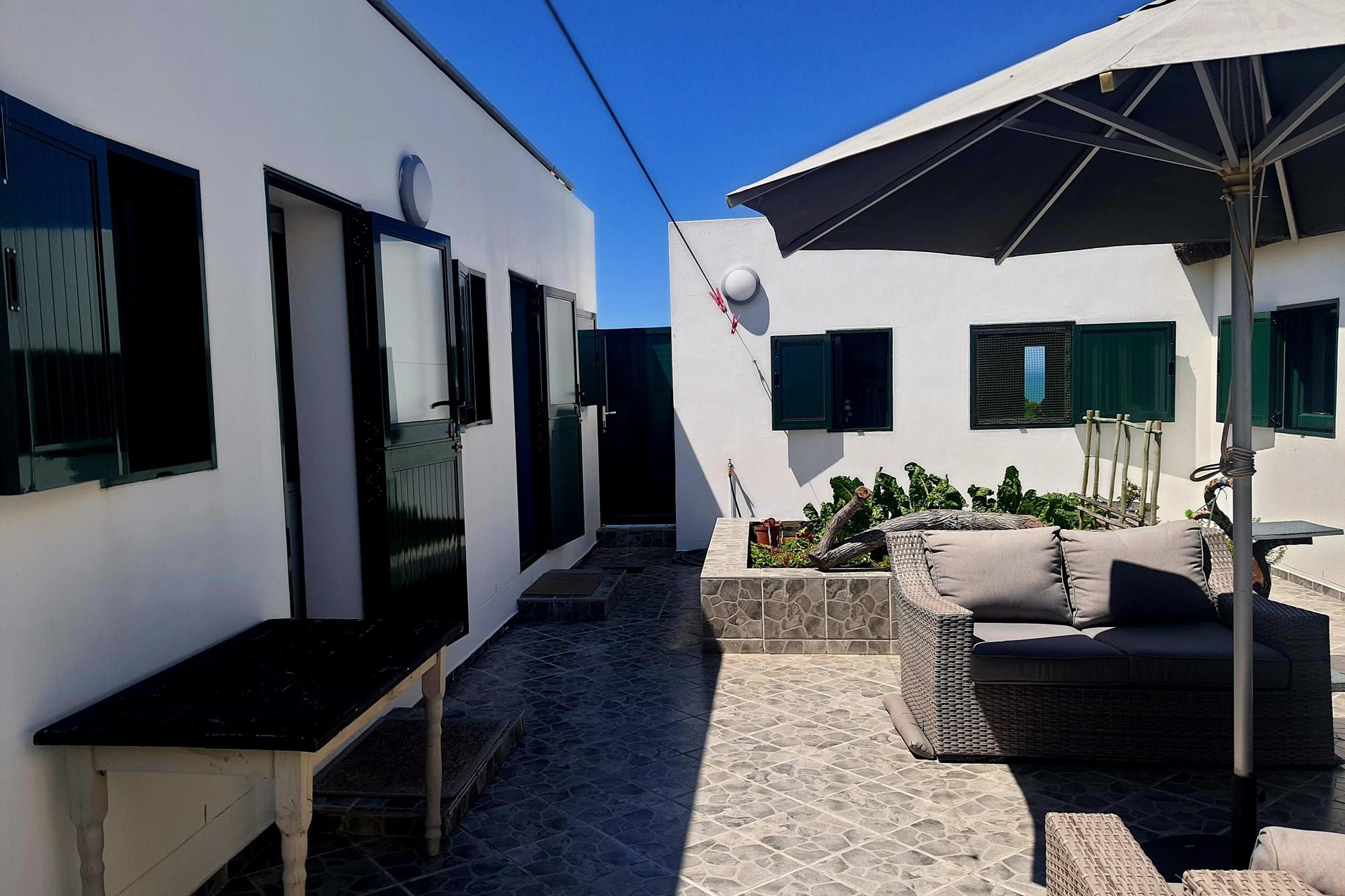 Across the courtyard, a separate bedroom with its own bathroom provides a serene sanctuary for guests.