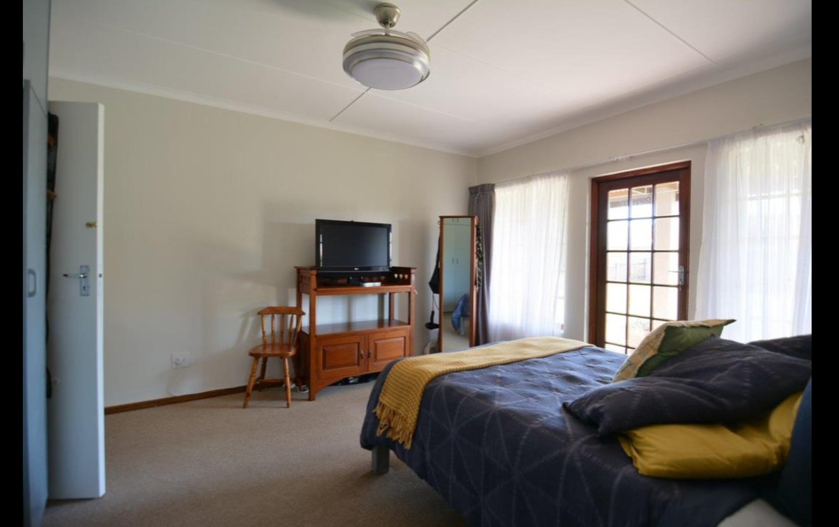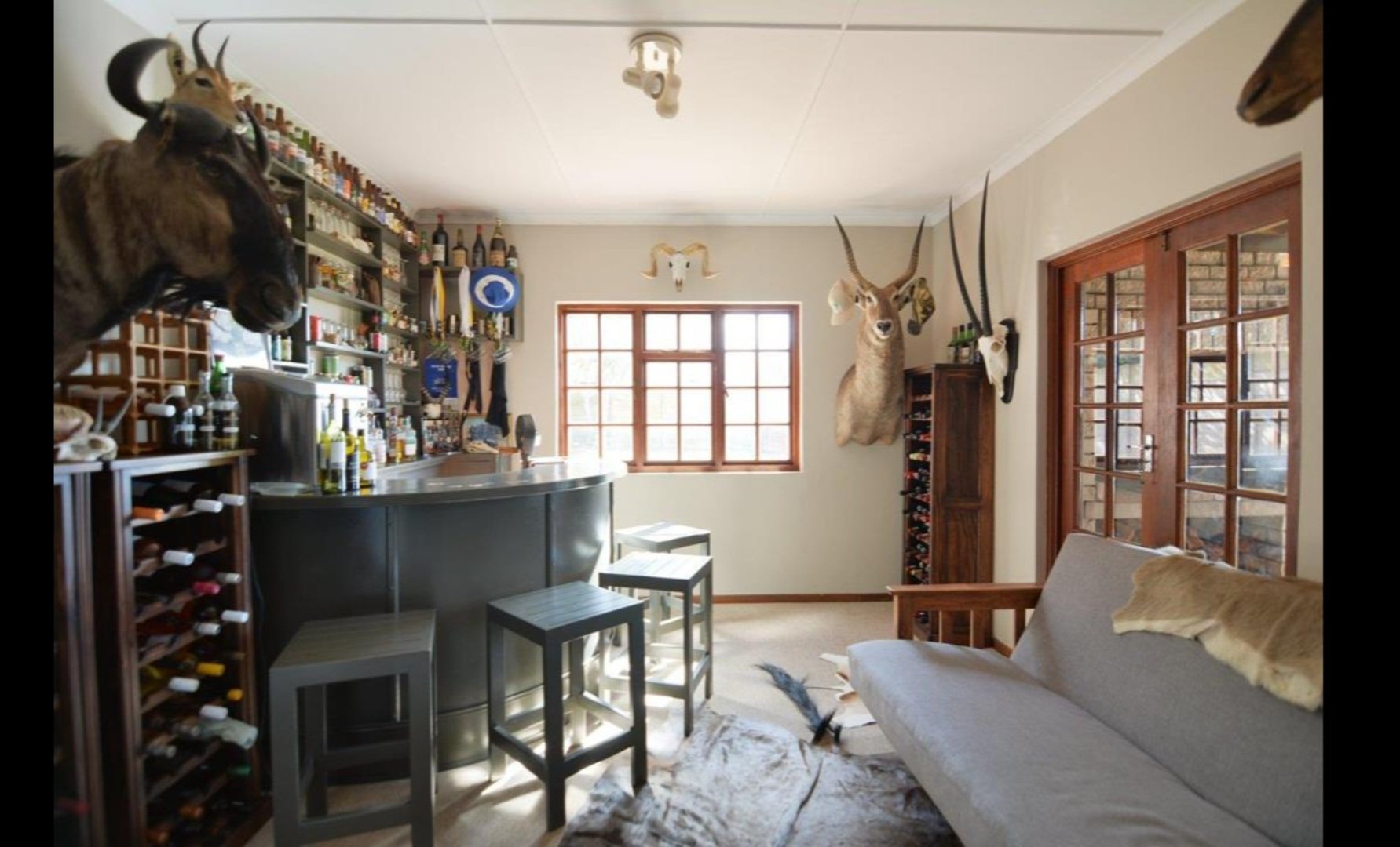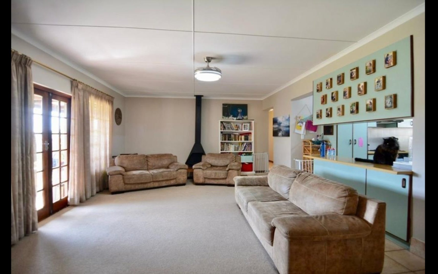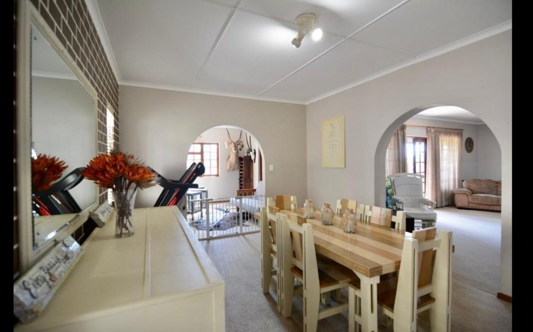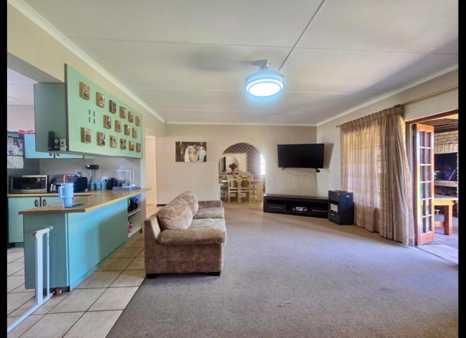 Spacious Kitchen is perfectely centred in the house. There is a entertainment room with a build in bar, leading to the covered Braai area. The living area is open plan with the Kitchen flowing into the Lounge area, which is adjacent to the Dinning room.