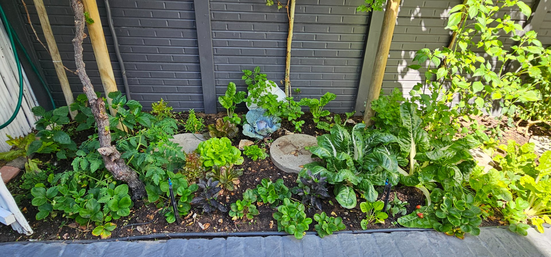 The manicured garden is packed with Herbs and various Vegetables. There is Olive trees and loads more.