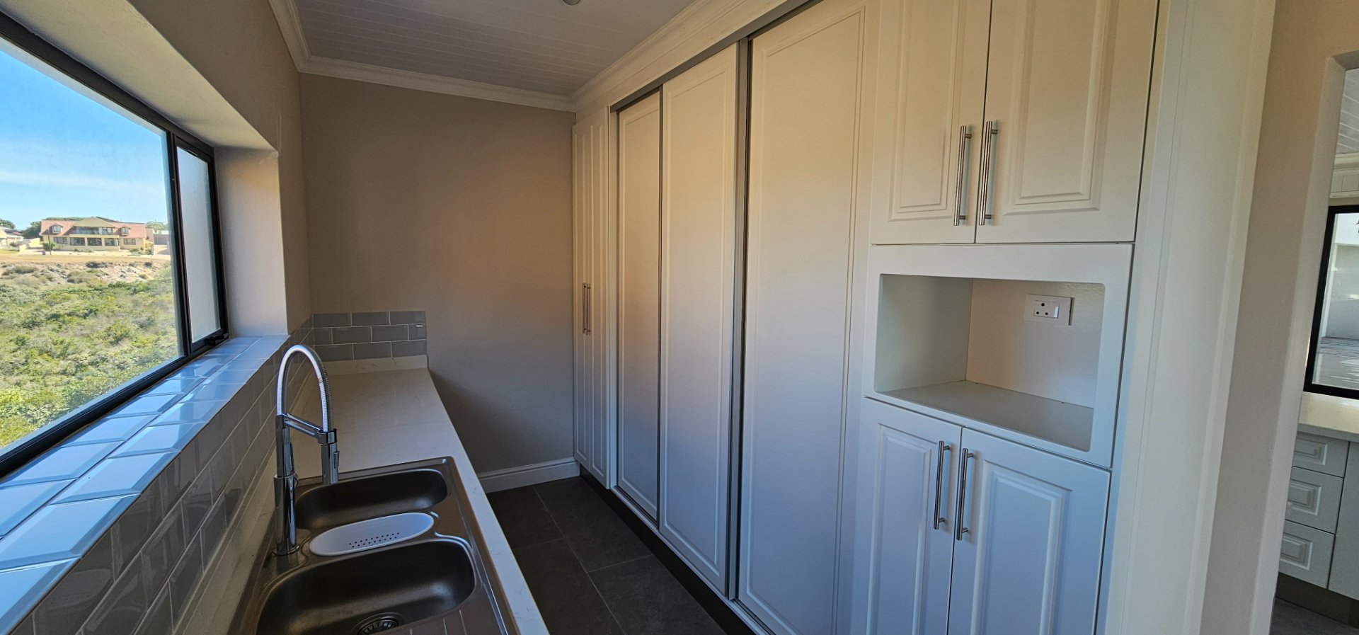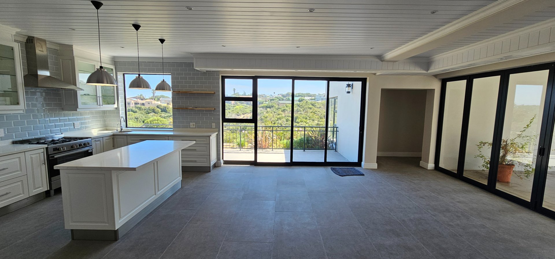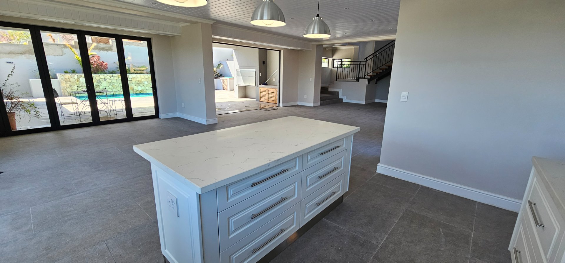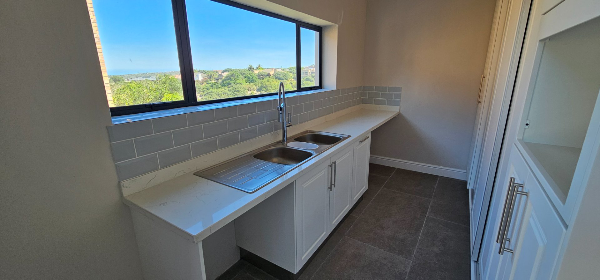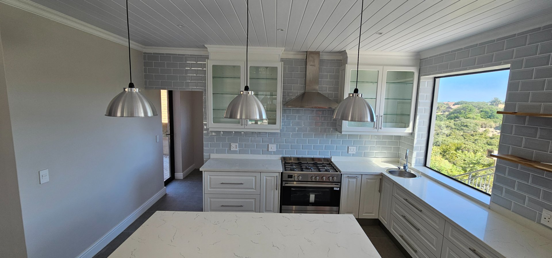 As you move to the Kitchen, there is two big Slidding doors. One leading to a big Veranda with stunning views of the estuary behind the house and distant Sea views. To right the doors open up to the undercover Braai area and Swimming pool.