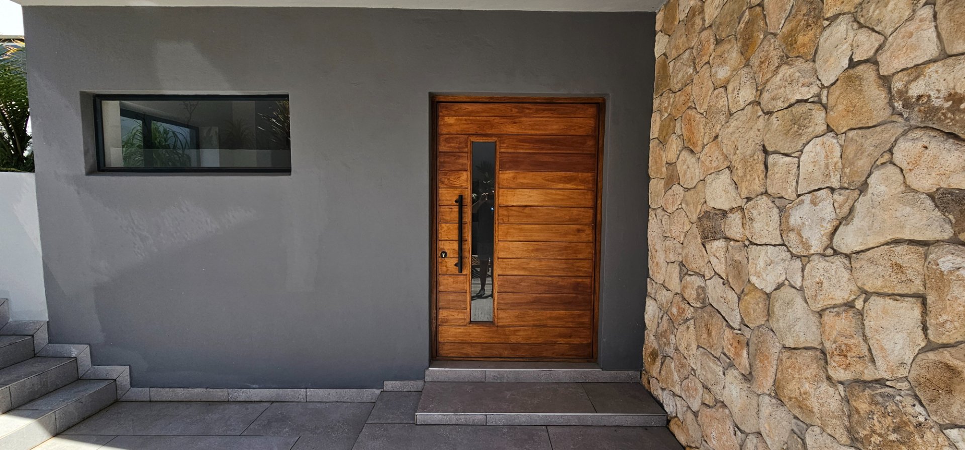 As you enter through the front gate, you are greeted by the manicured garden and beautifull Pool. To your left a huge front door inviting you inside.
