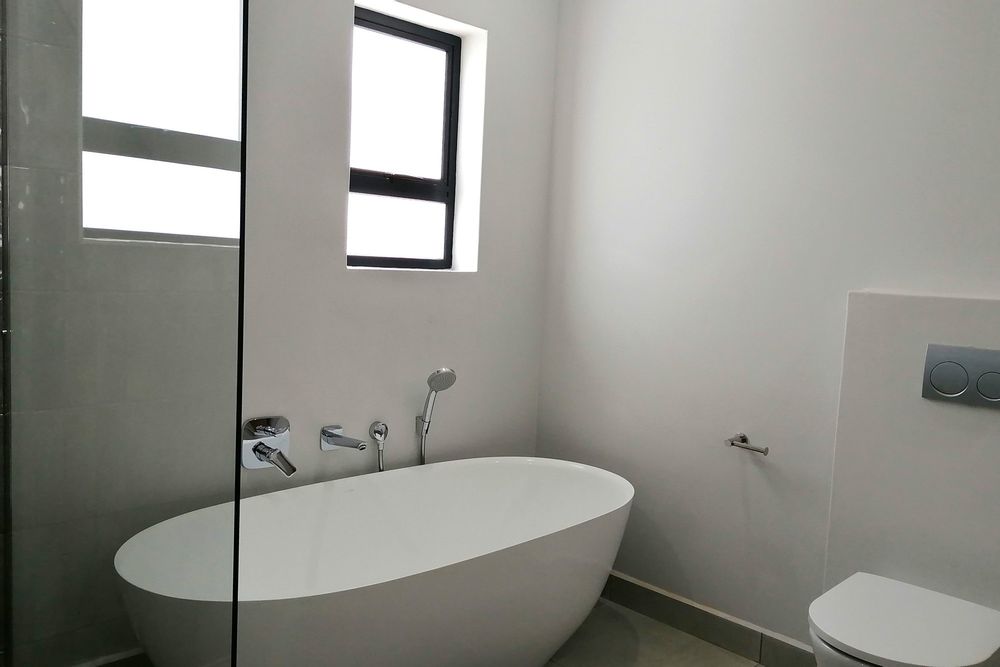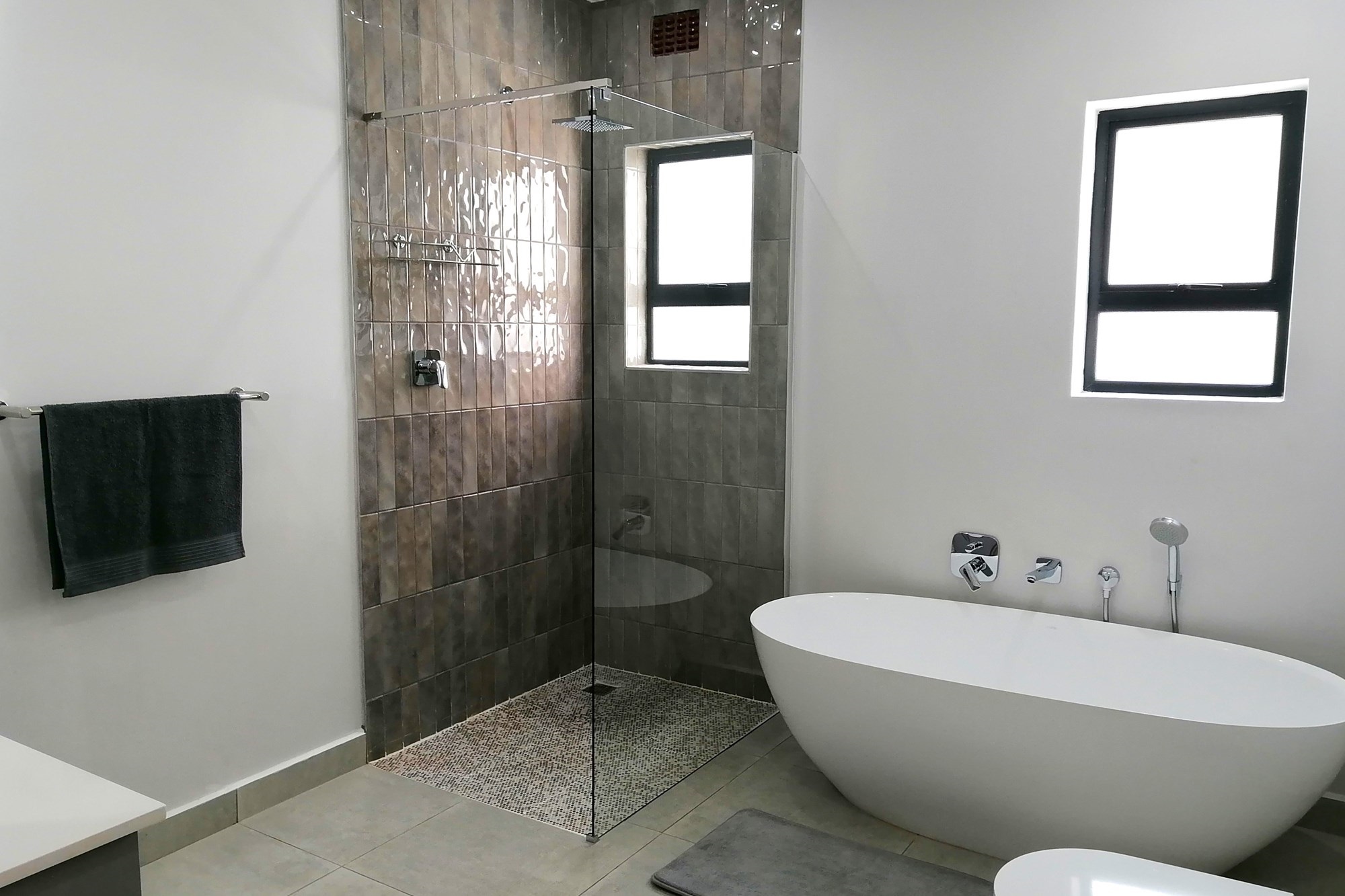 All three bedrooms are fitted with ample built-in cupboards, while the main bedroom offers an en-suite bathroom. The additional two bedrooms share a luxurious full bathroom designed with elegant features for added comfort. In the back yard you will find a charming one bedroom, en-suite flat with an open plan living and kitchen area, ideal for guests or rental opportunities. A double garage completes the property- adding practicality and value.