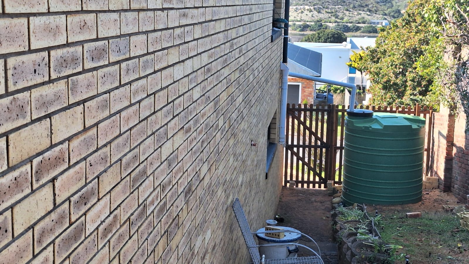 Dual rainwater harvesting tanks (2 500 L + 1 500 L), linked to a filtration system and large storage tank—ideal for irrigation and aiding off-grid resilience