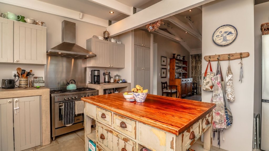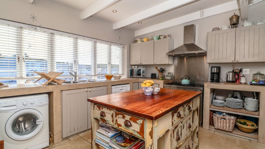 The upper level is the heart of the home, with a stylish dining area flowing into a well-appointed kitchen, ideal for both everyday meals and entertaining. A generous lounge leads out to a beautiful braai area and covered patio – perfect for relaxed coastal gatherings.