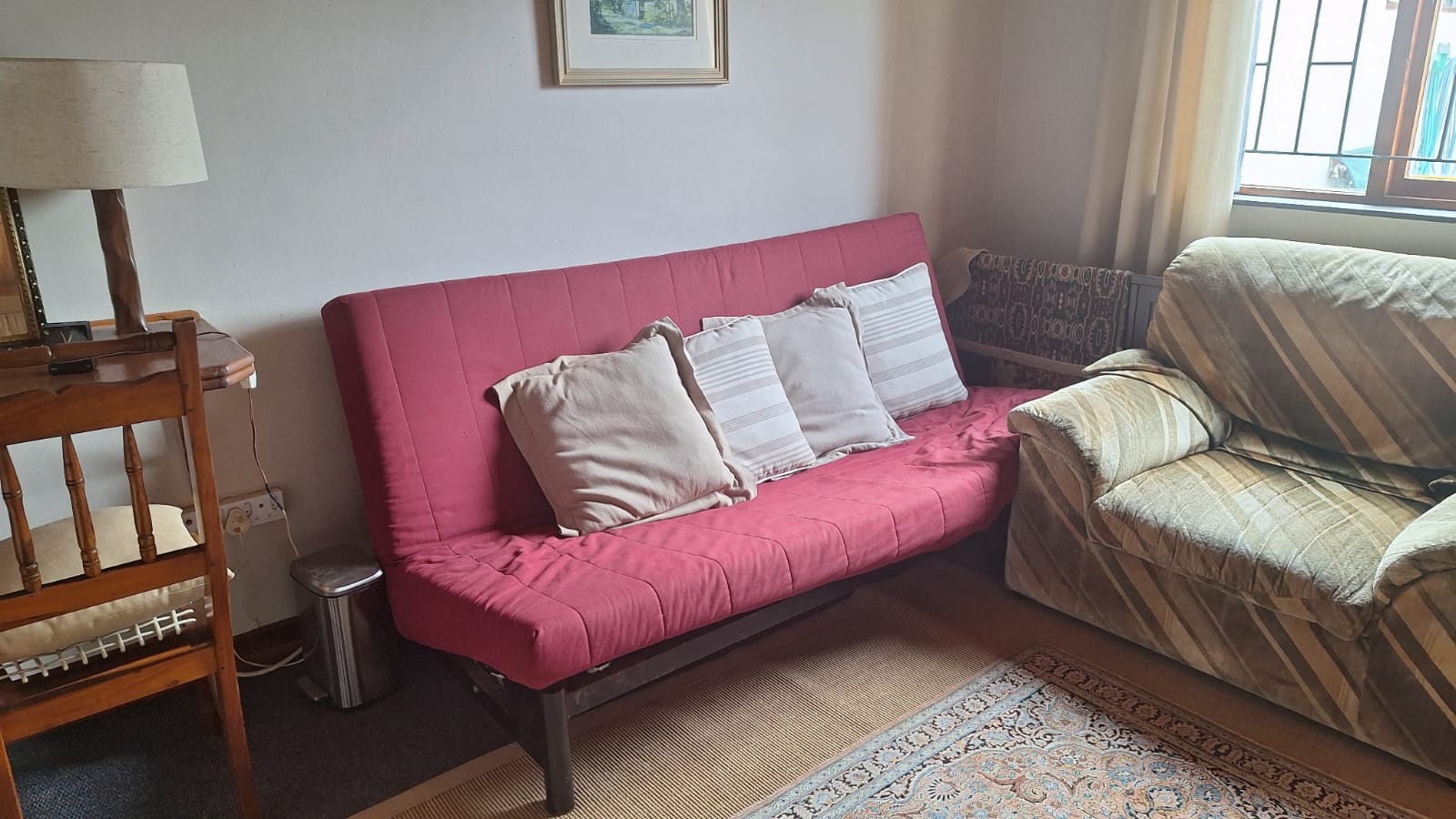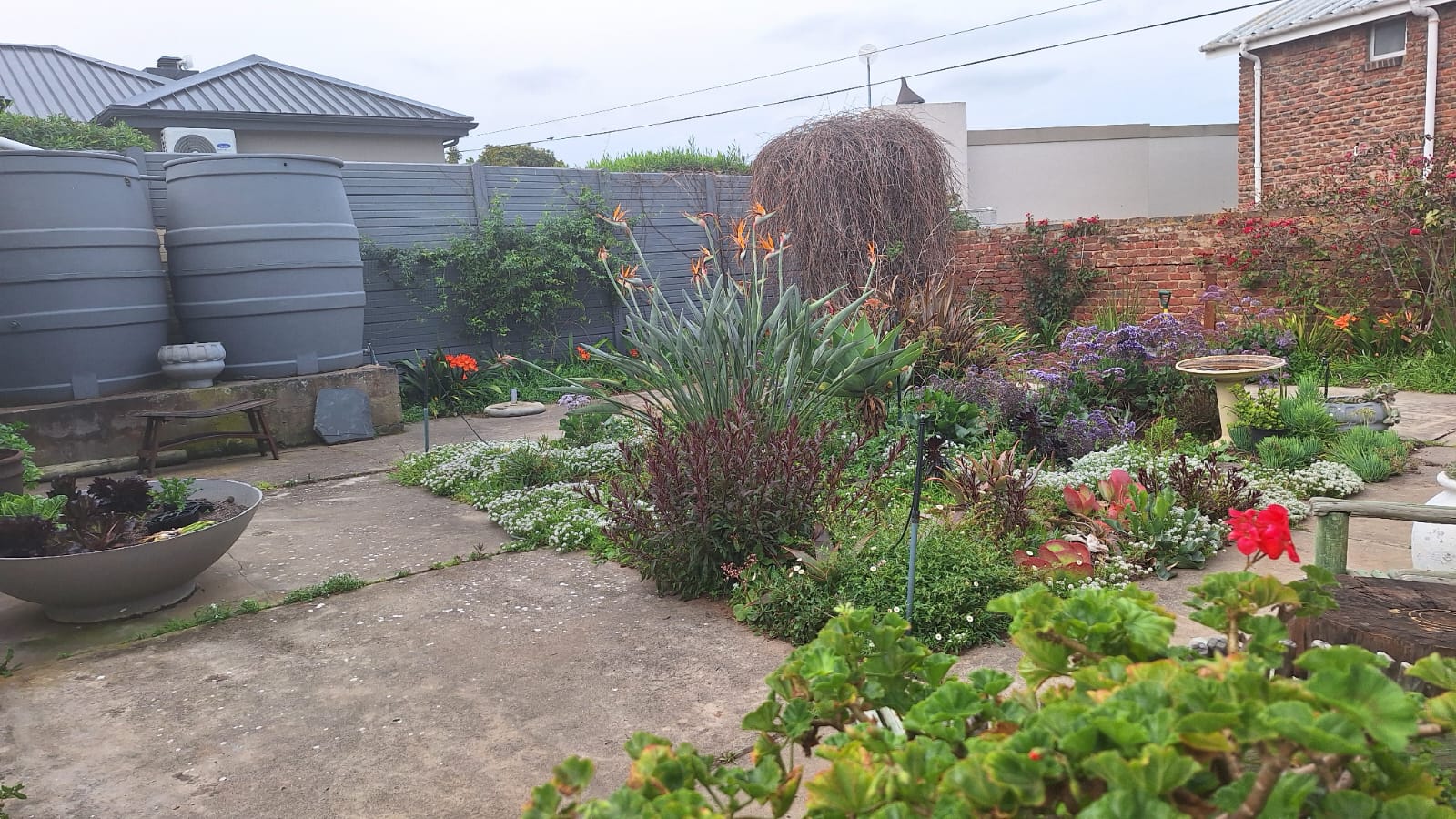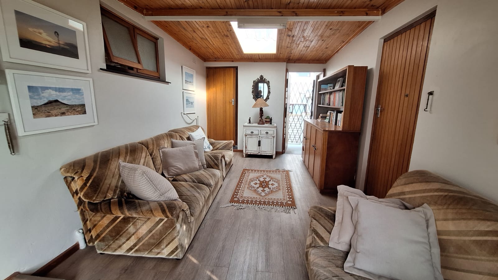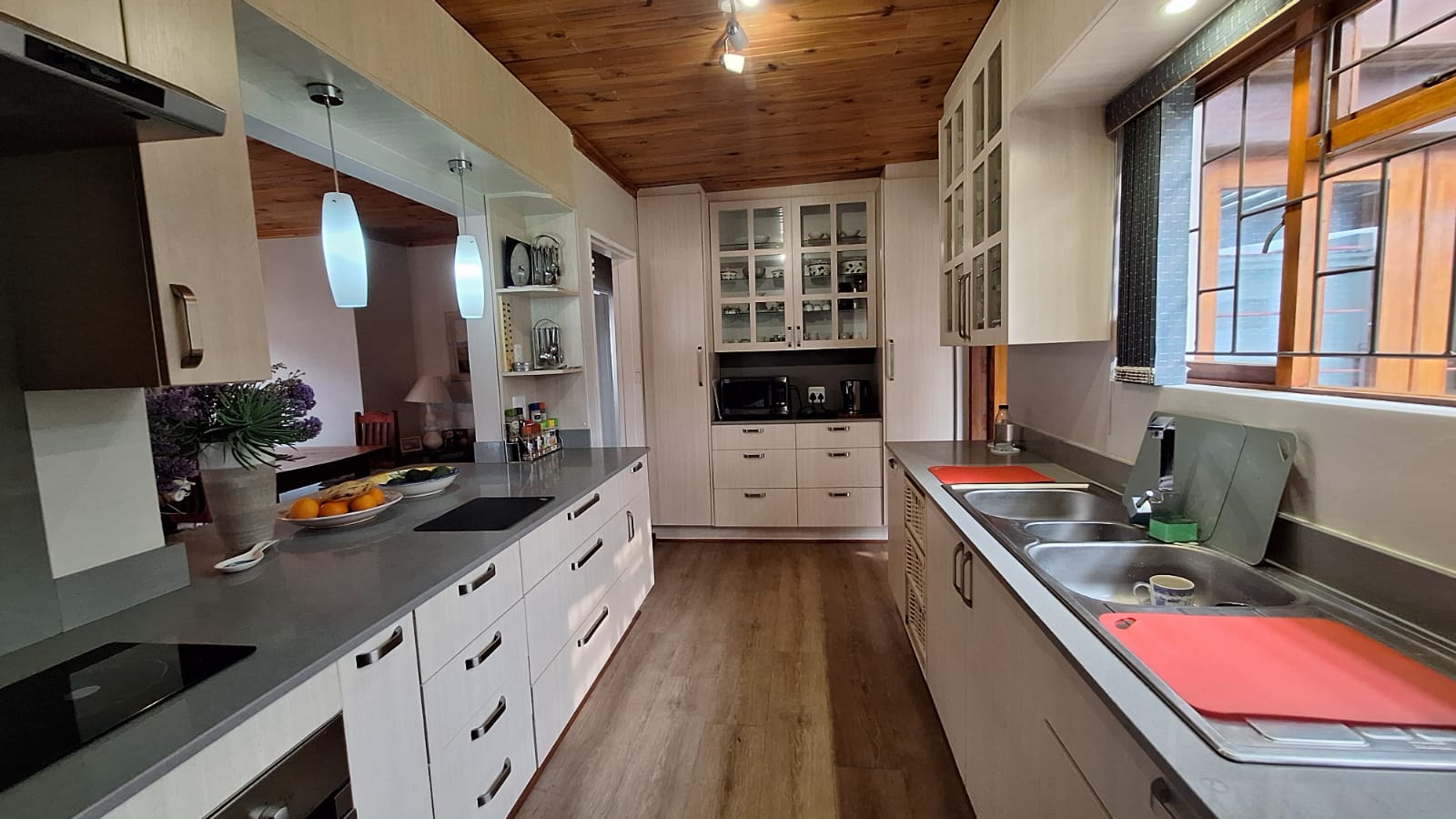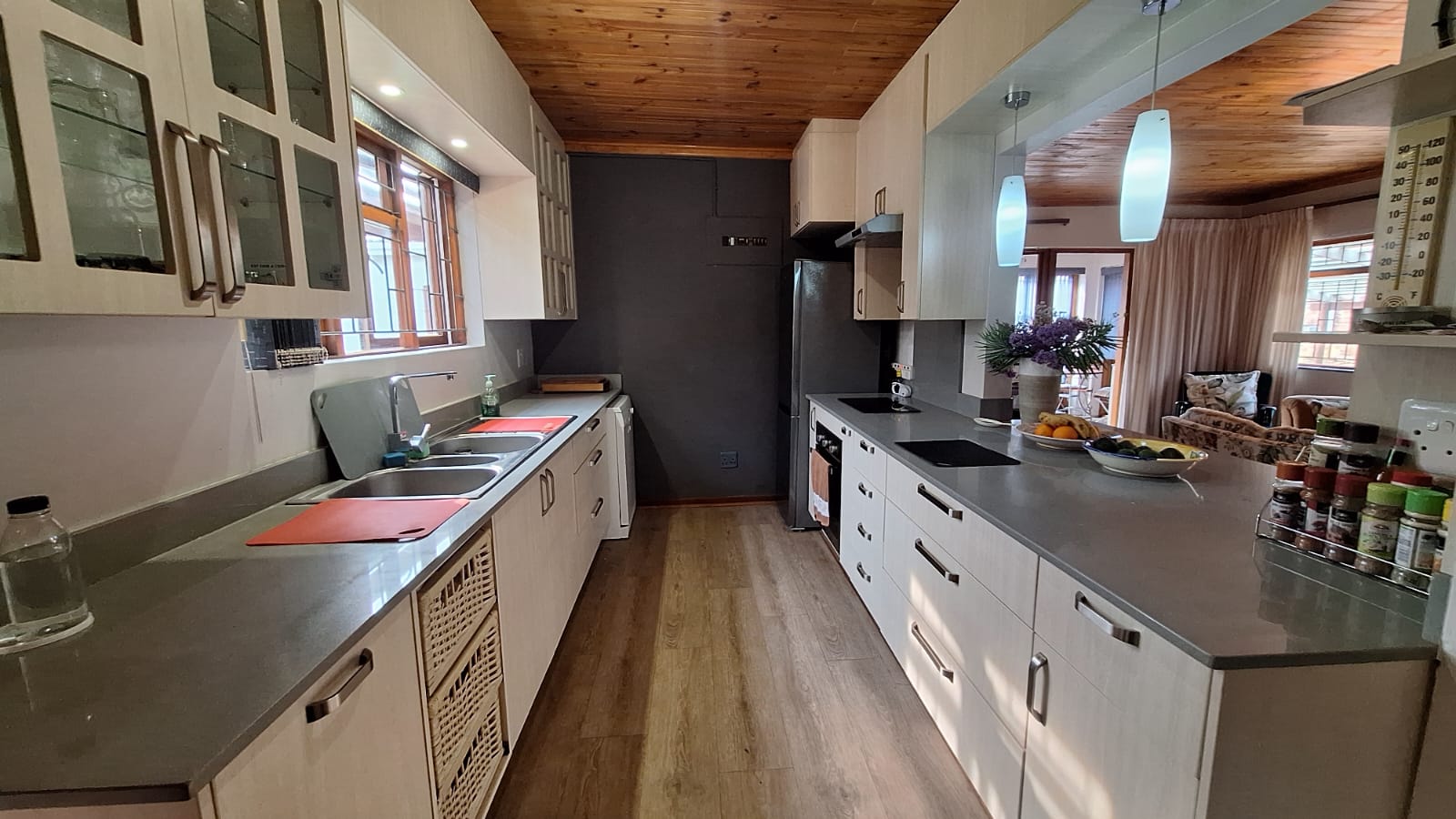 Outside, you’ll find a well-maintained, pet-friendly garden, with 2 water tanks. Paved driveway, and ample parking. Separate from home, manual double garage with ample storage, complete with washing facilities. Two covered bays. Added features include wooden window and door frames, a security gate, and a practical north-facing design for year-round comfort.