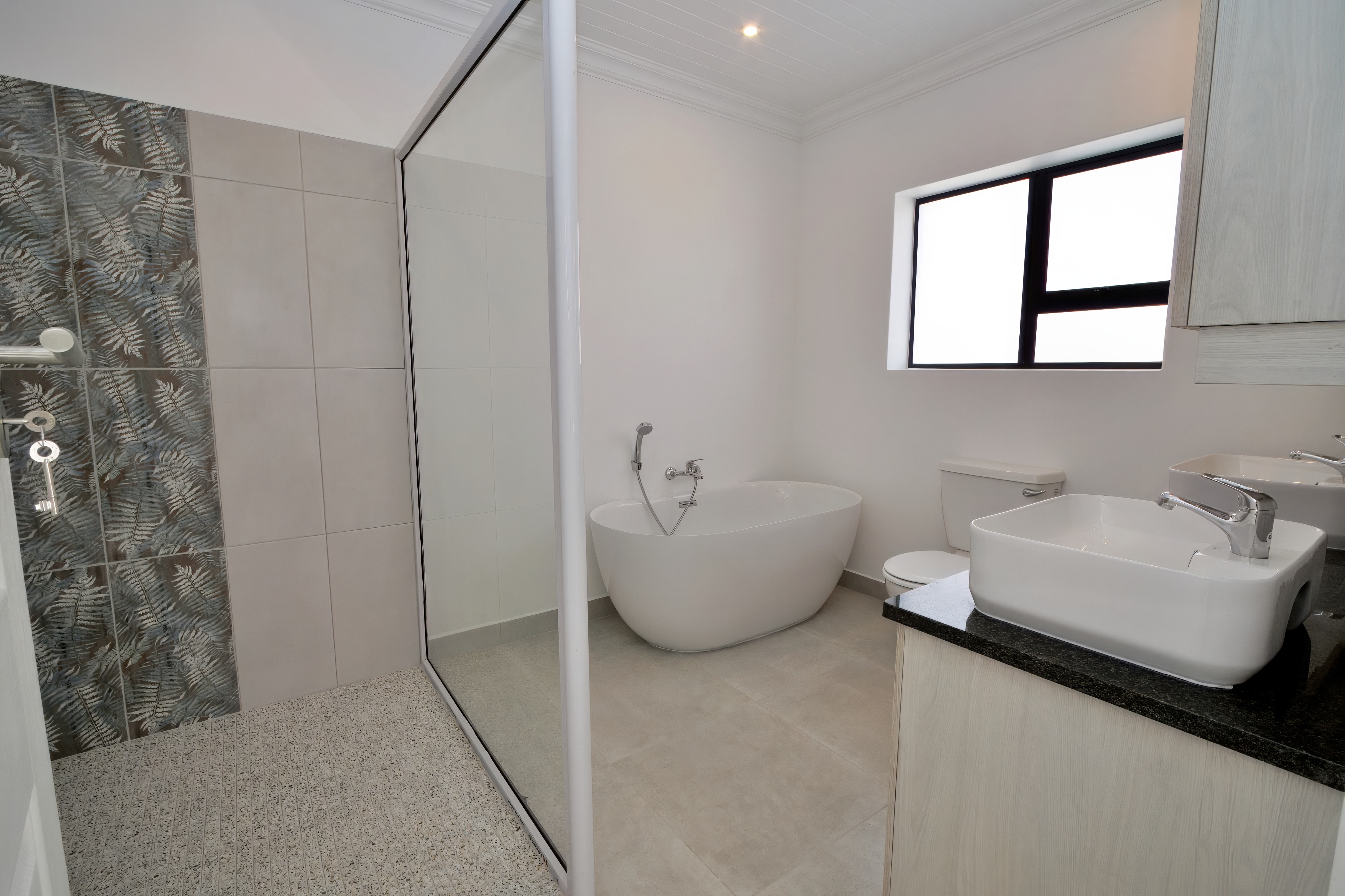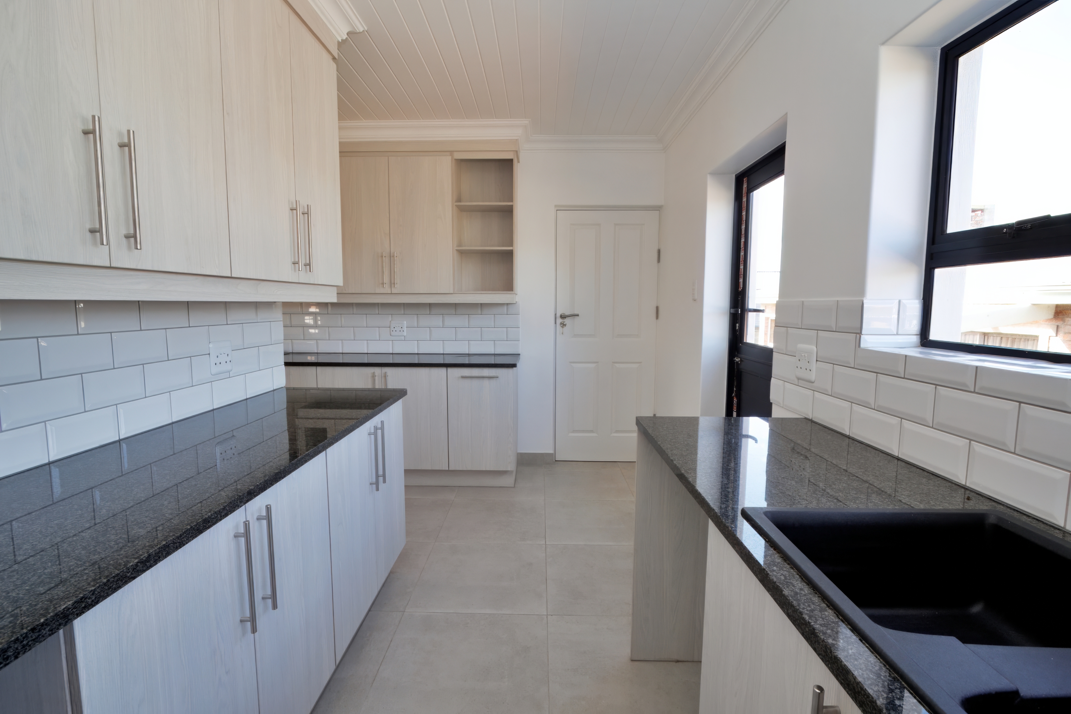 The property offers two bathrooms, one of which is a stylish en suite to the main bedroom. Throughout the home, modern finishes and tiled floors with a single uniform tile create a sleek, cohesive look, while the granite countertops in the kitchen add a touch of luxury.