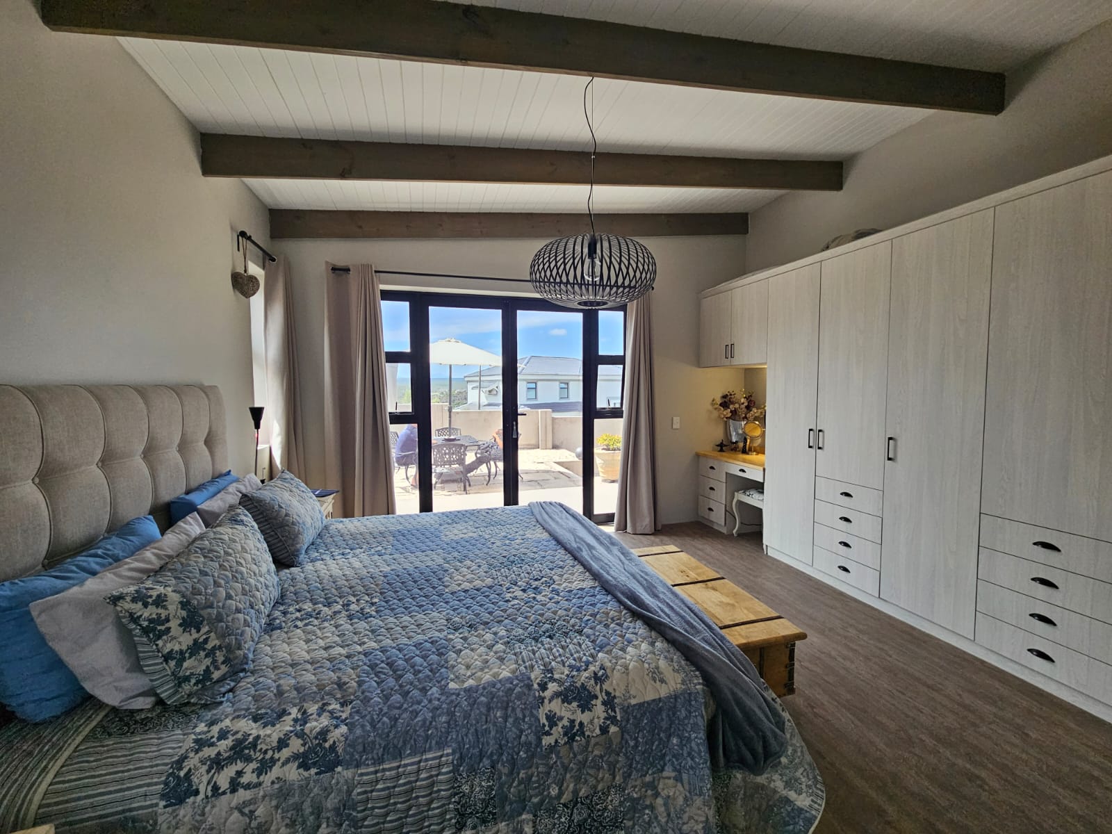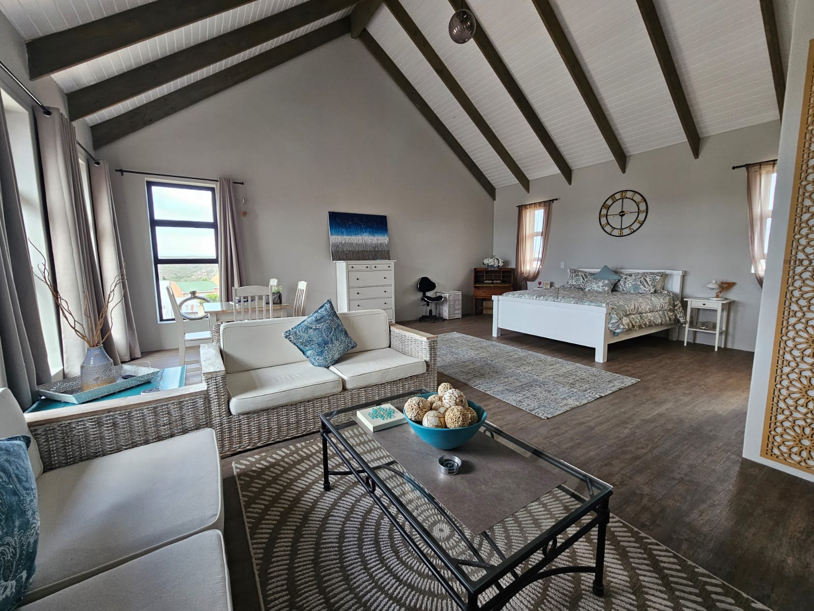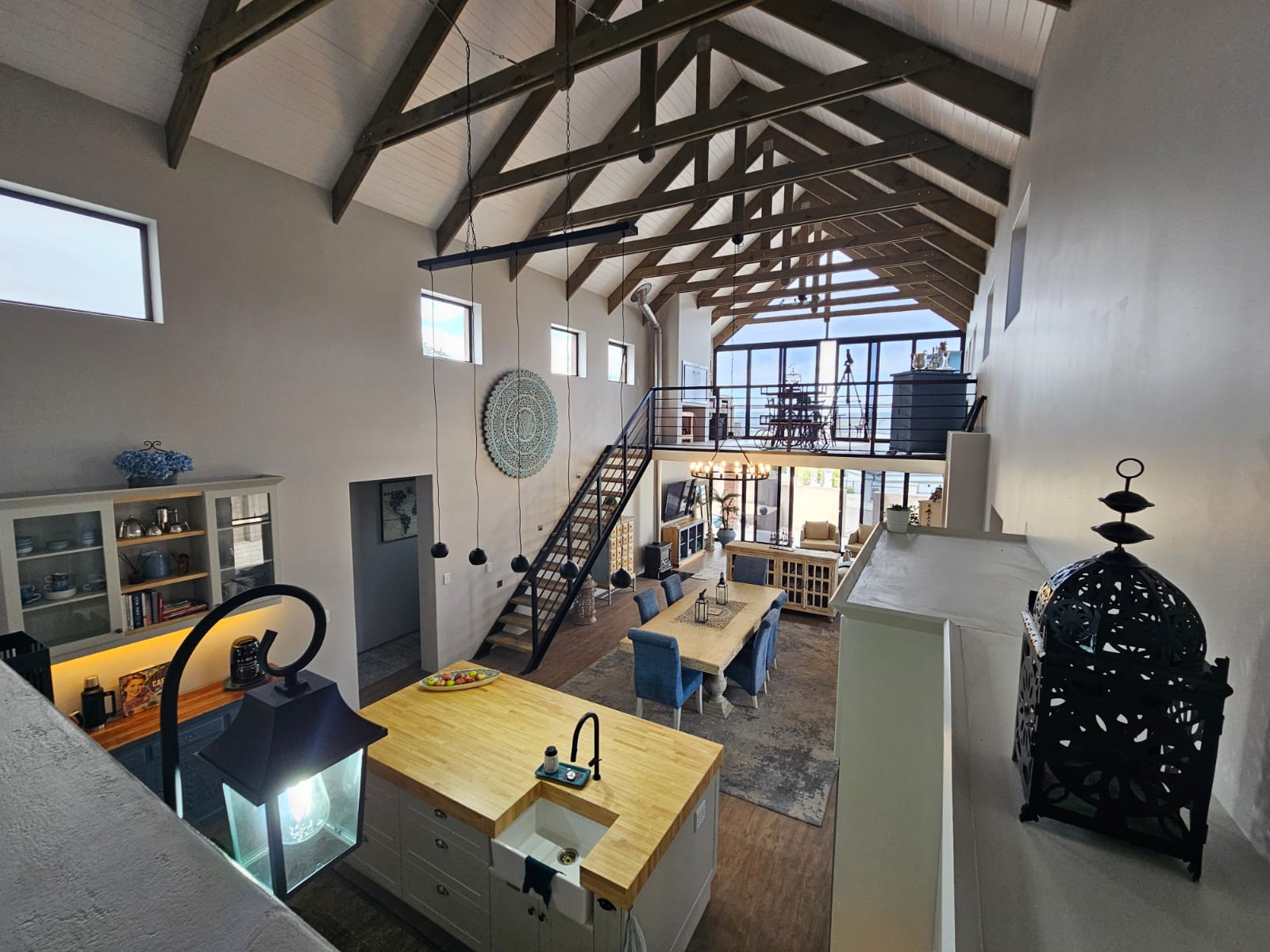 Upstairs, a lofted entertainment area offers an additional spacious lounge/dining room with a built-in braai, opening onto a balcony where you can soak in the most beautiful panoramic river views — perfect for sundowners and entertaining.