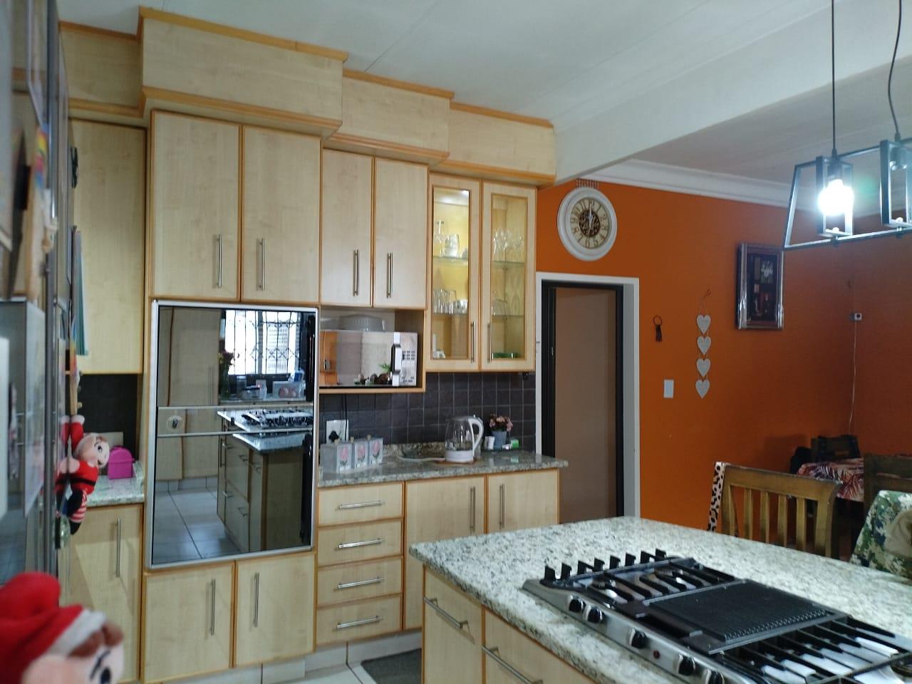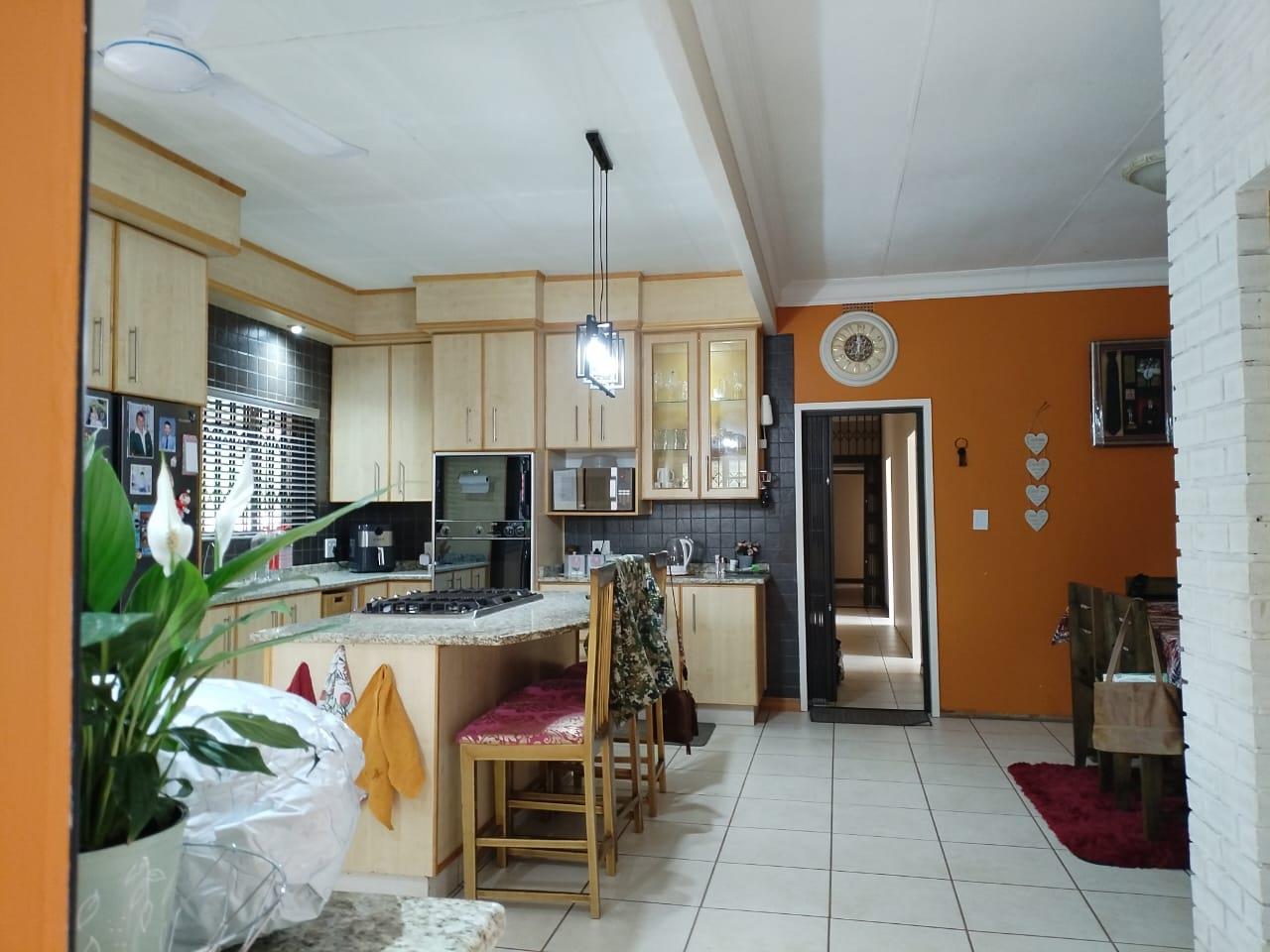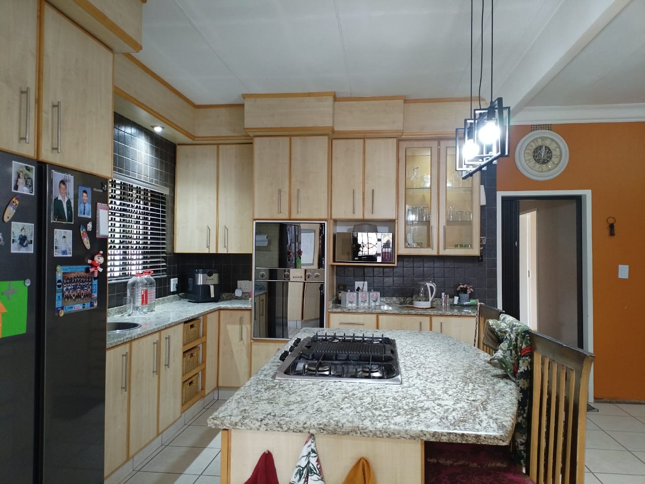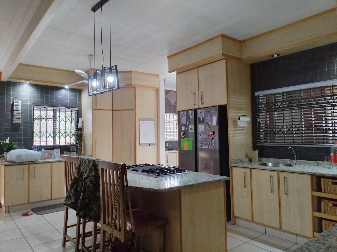The kitchen is a culinary dream, featuring granite countertops, ample built-in cupboards, a scullery and laundry, water purification system, gas stove, eye-level ovens, blinds, and an aircon, complemented by an open-plan dining area.