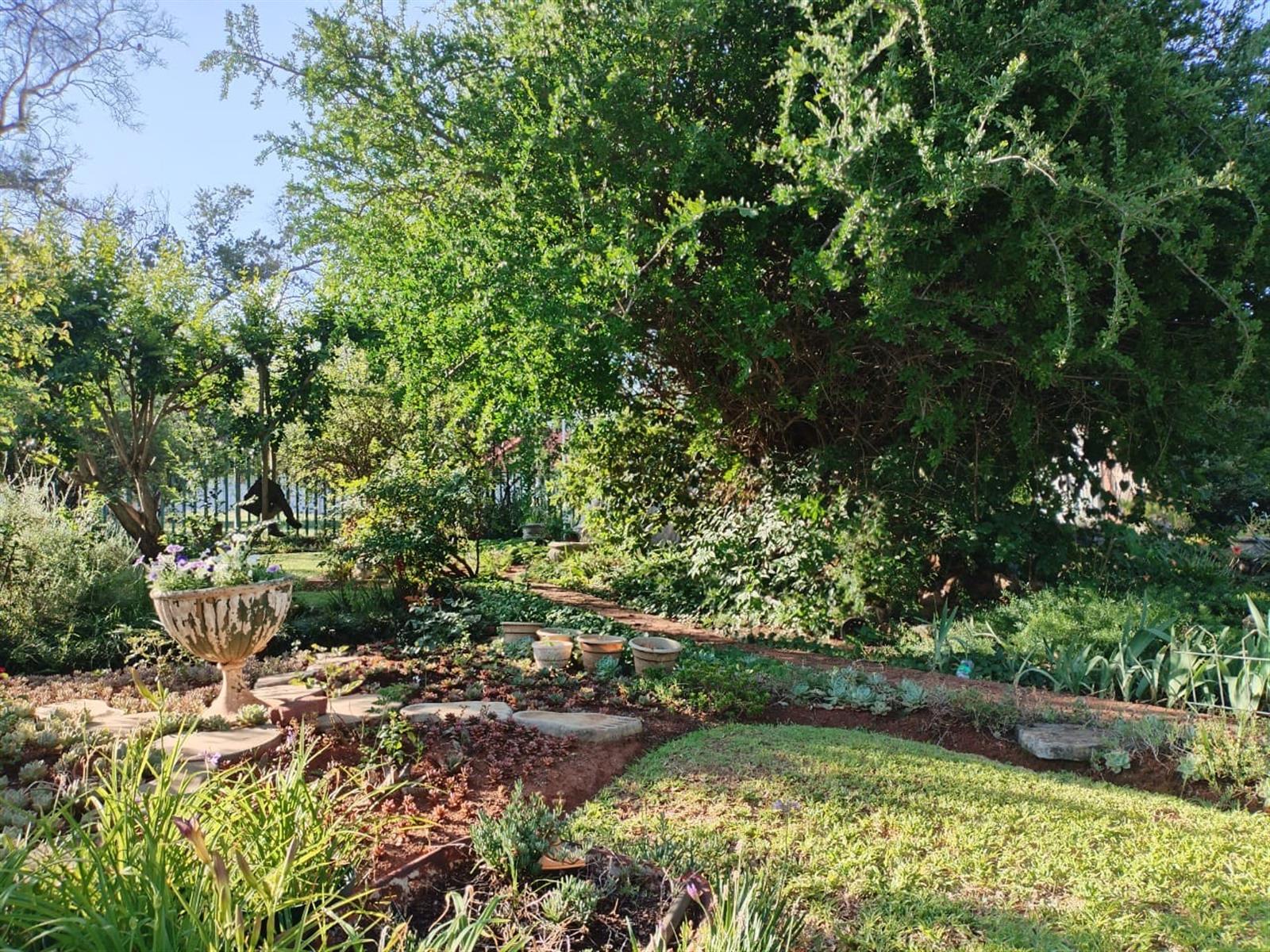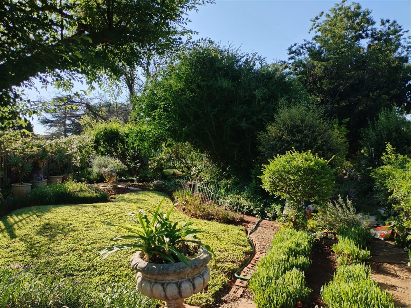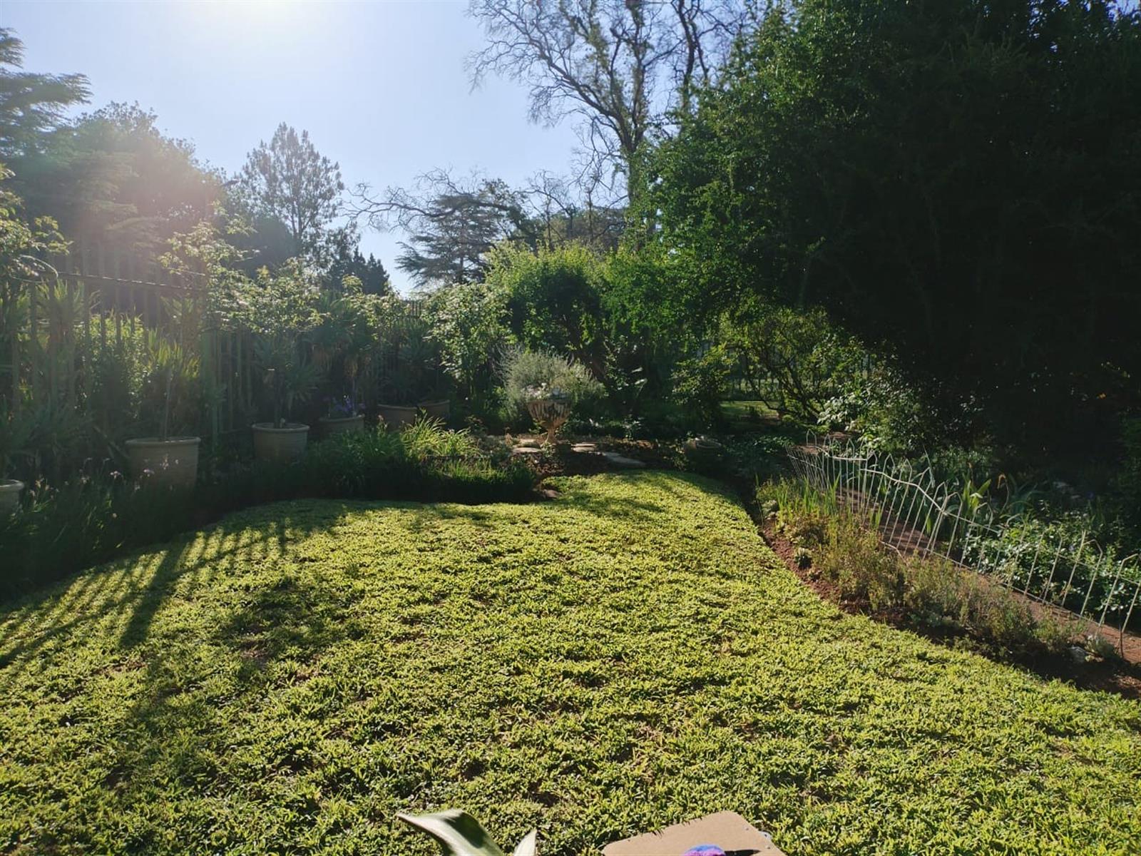 Garden: Lush green lawn with variety of plants and trees.