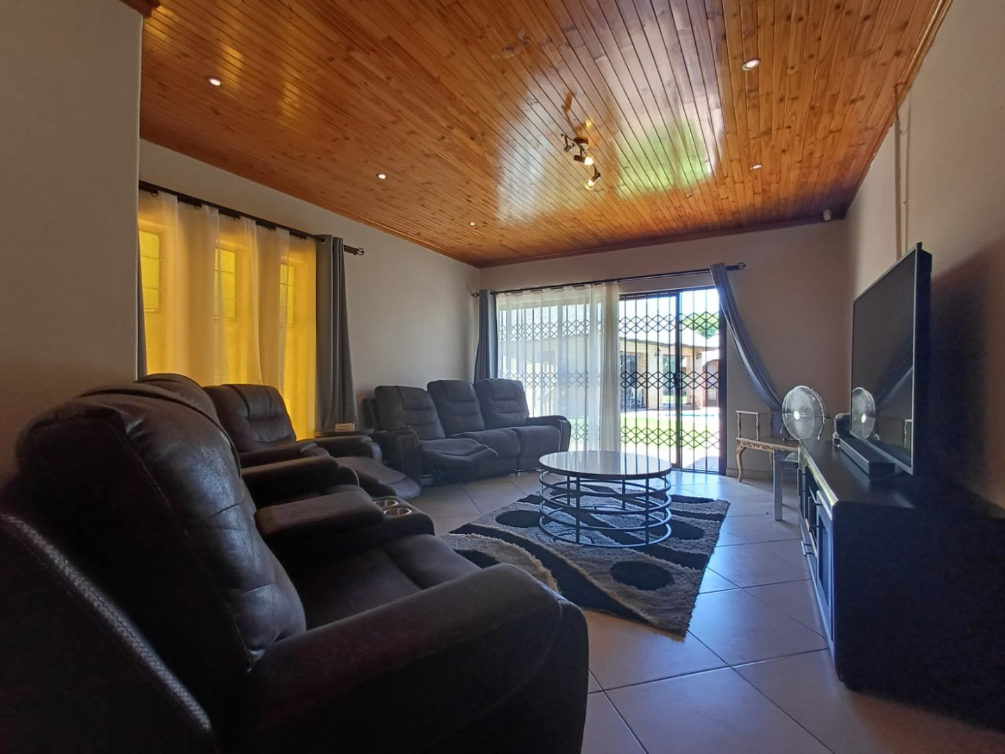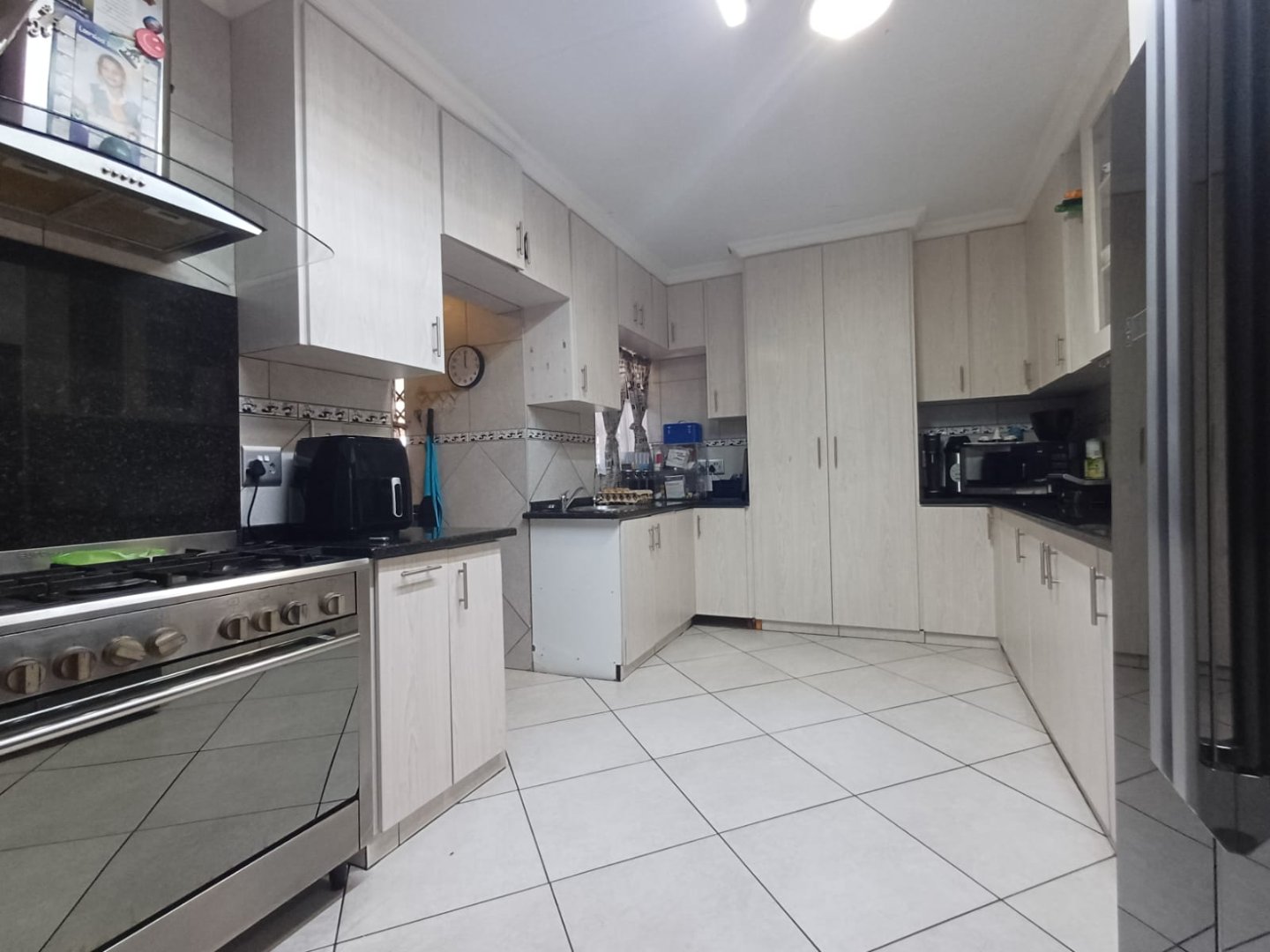 The home boasts a spacious lounge with sliding doors leading to the swimming pool and entertainment areas, as well as a separate TV room and a large dining room ideal for hosting family gatherings. The modern kitchen features granite countertops, built-in cupboards, a gas stove with an electric oven, an extractor fan, and a separate scullery and laundry room to accommodate all appliances.