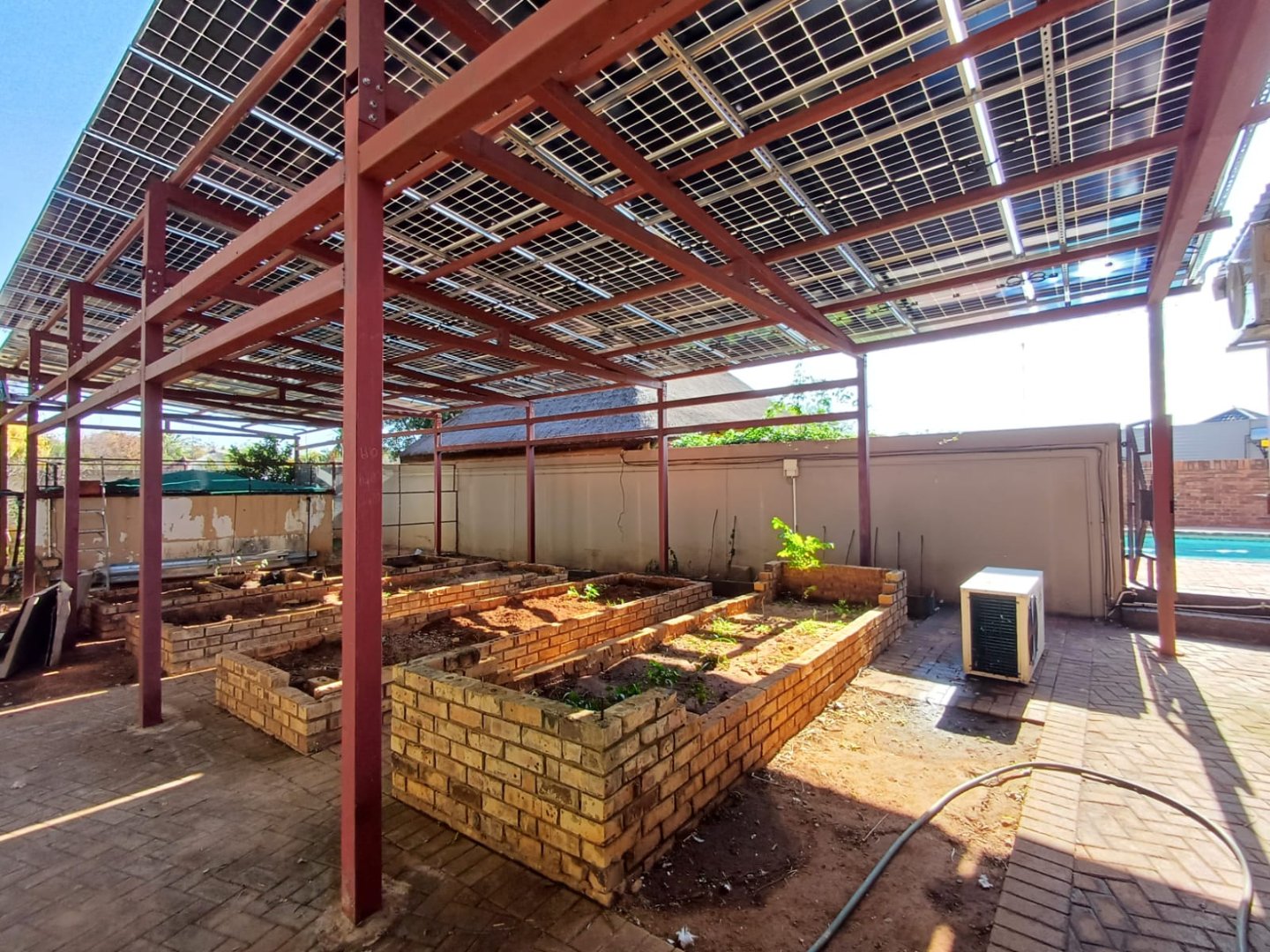 Outside, the home continues to impress with a sophisticated solar power system backed by 45 kW batteries and a 30 kVA generator that can support the entire property. Water sustainability is ensured through a perforated borehole, purification system, two 10 000-litre water tanks, and a reservoir. A computerized irrigation system maintains the beautifully landscaped garden and greenhouse.