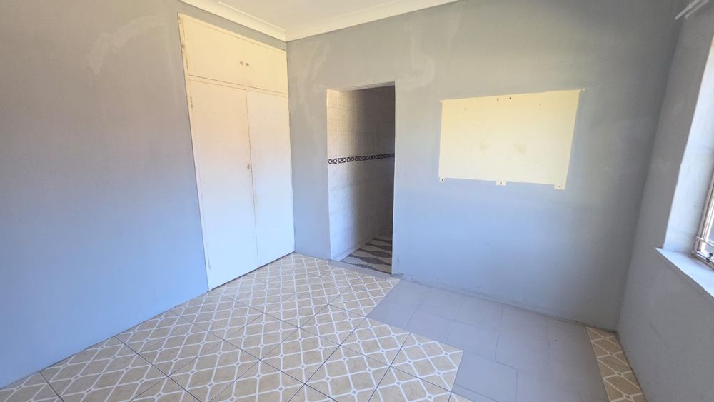 Inside, the home features a spacious lounge and a dedicated dining room, both ready for your personal touch. The main living areas boast clean, light-colored tiled flooring, with some sections featuring freshly painted walls. The kitchen is equipped with modern wood-grain cabinetry, dark countertops, a built-in oven, and a gas hob, providing a functional space for culinary enthusiasts. While some areas, including parts of the kitchen and main living space, show signs of ongoing work with exposed beams and wiring, these elements highlight the potential for bespoke finishes.
