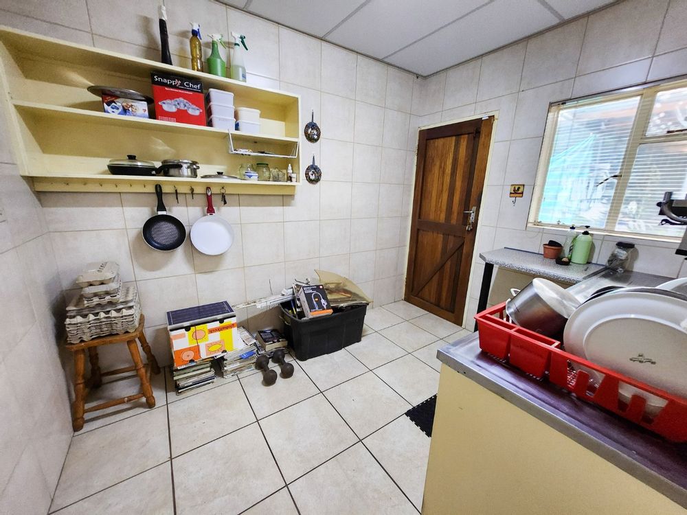 The kitchen is neat and functional, with good cupboard space and room for all your appliances. Outside, the property truly shines. A lovely, well-kept garden surrounds the home, supported by a strong borehole, irrigation system, and water tanks to keep everything lush and green all year round.