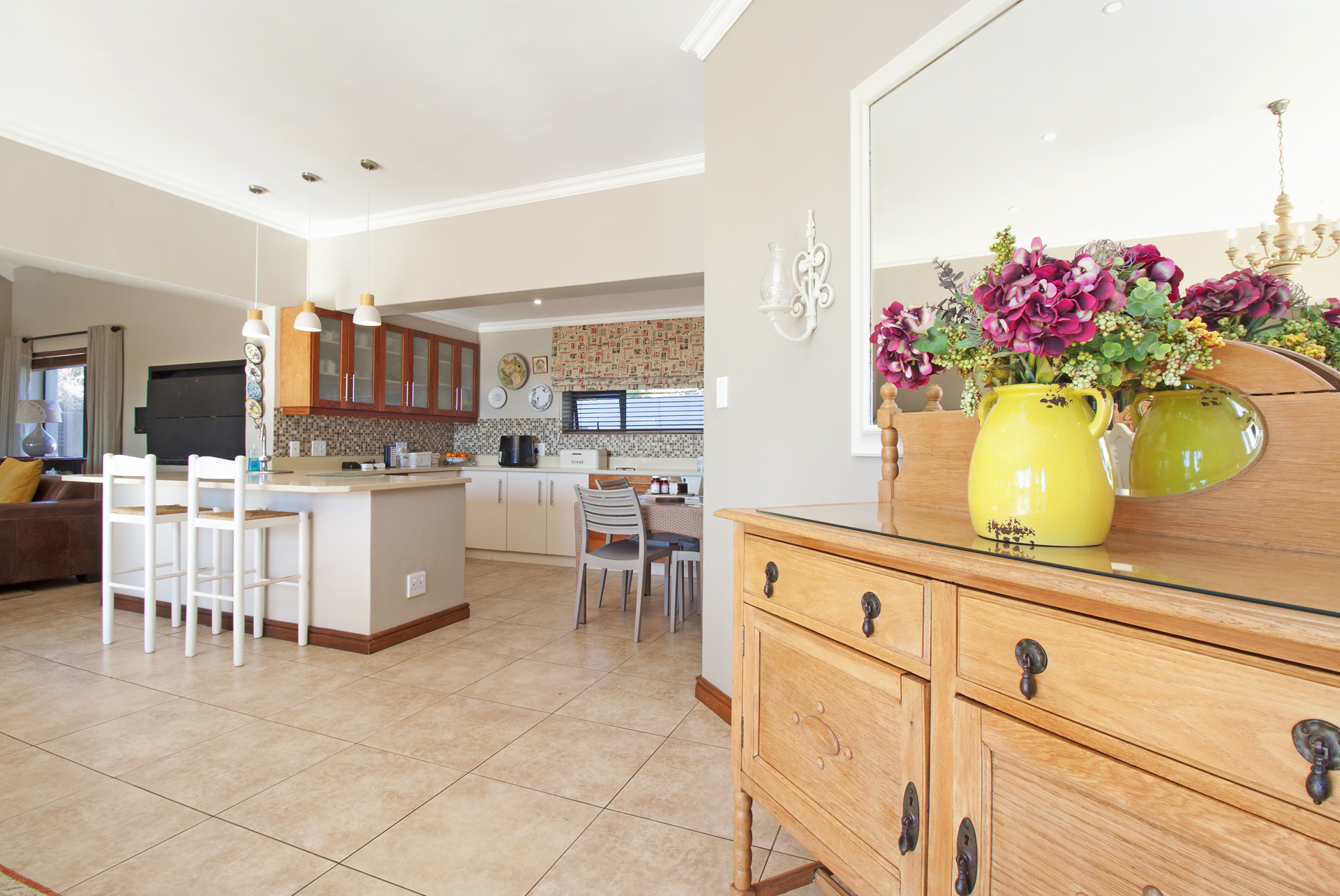 The ground floor is all about effortless indoor–outdoor living: stacking aluminium doors open to a sparkling pool and landscaped garden, while three interlinked living spaces—including an enclosed sunroom and an indoor braai—make year-round entertaining easy. A well-appointed open-plan kitchen with scullery anchors the home, and a generous downstairs bedroom with an adjacent bathroom is ideal for guests or multi-generational living.