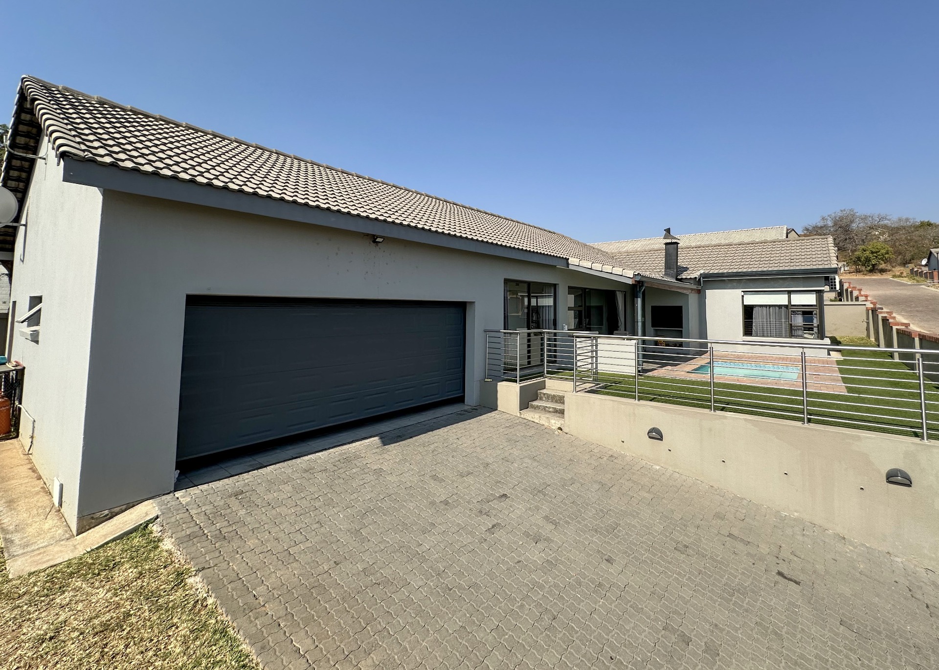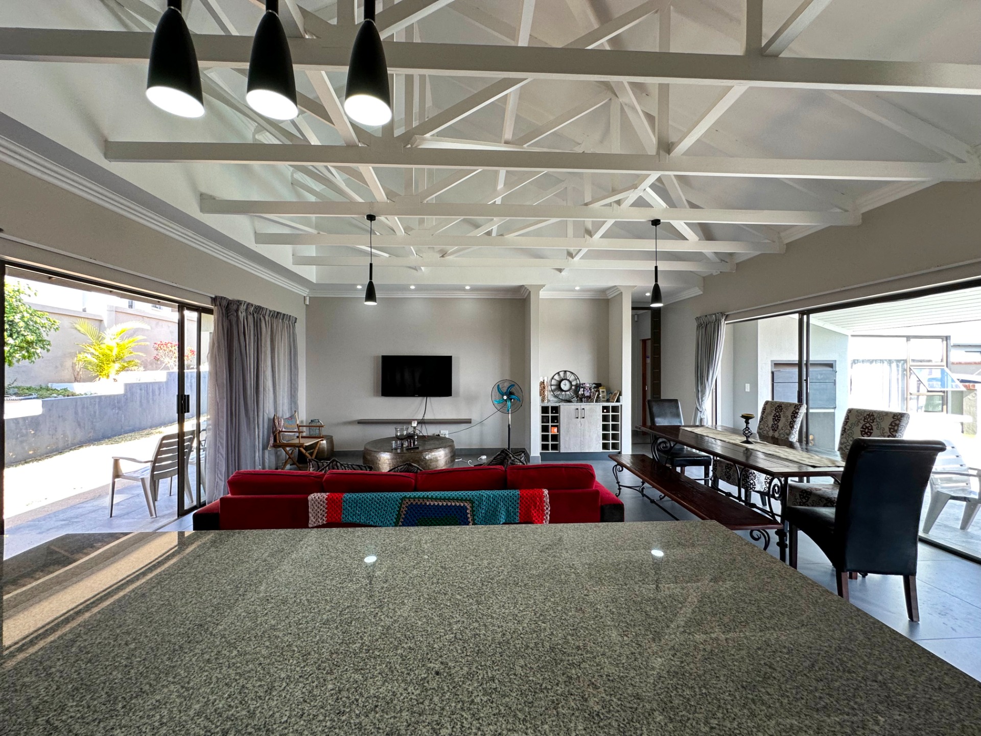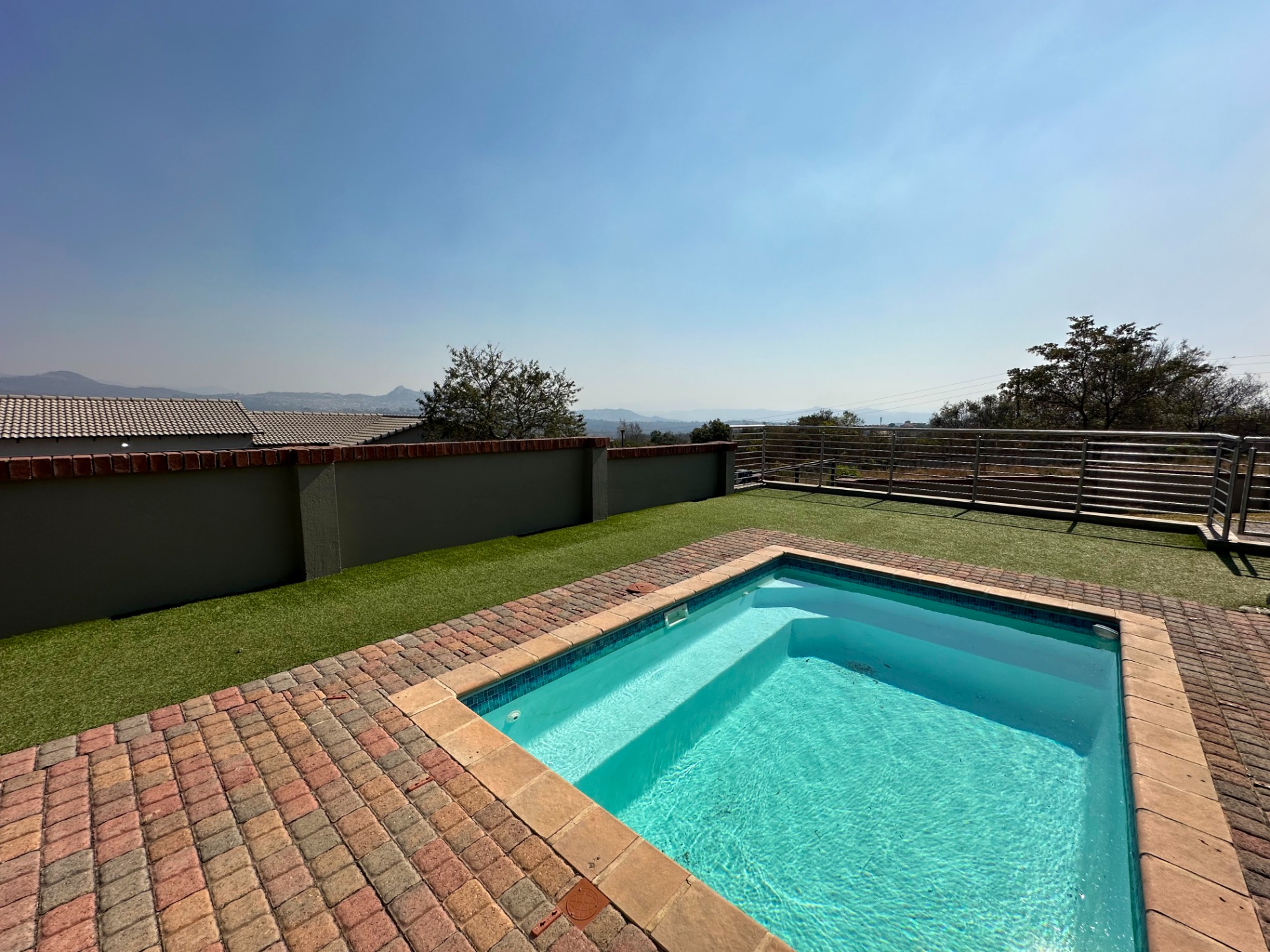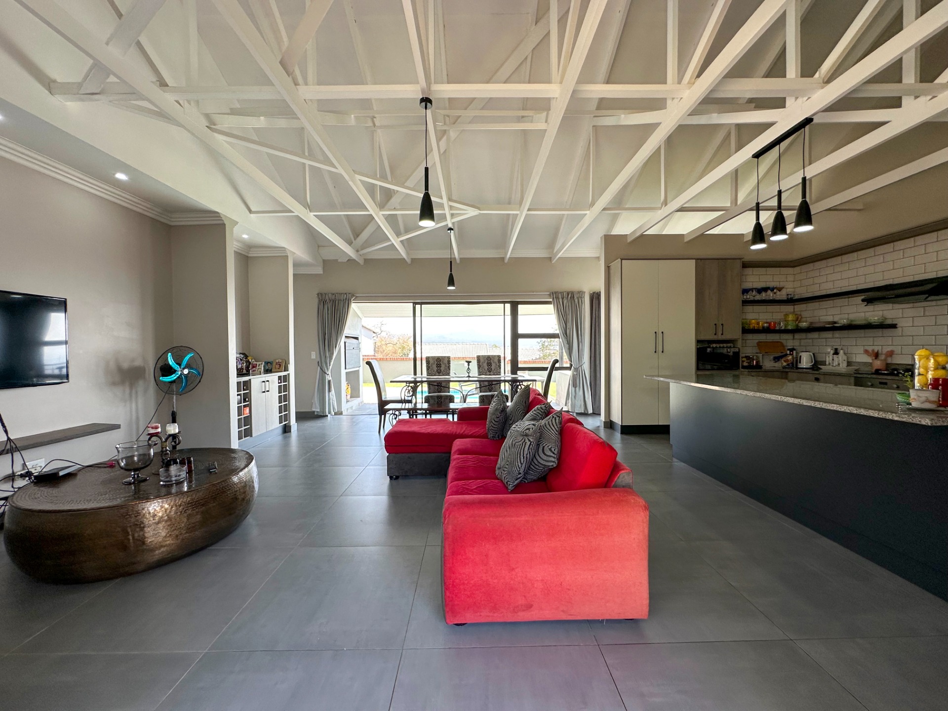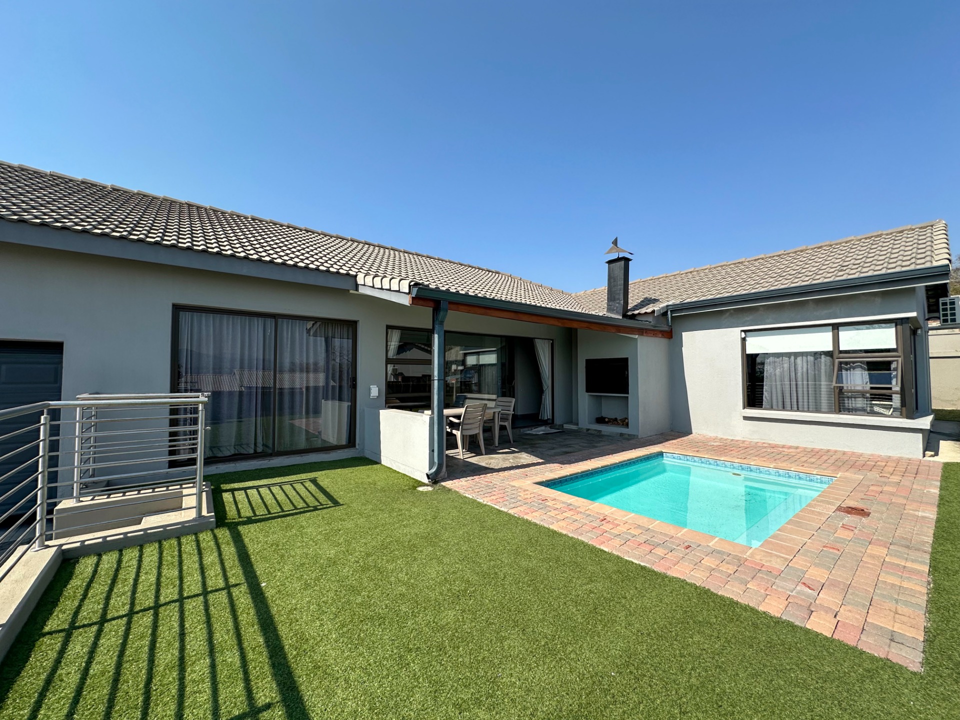 This stunning newly built property promises a quality and secure lifestyle, conveniently located near all major amenities. As you enter, you'll be greeted by a spacious open-plan living area, featuring glass doors that lead to a covered patio with a built-in braai, perfect for entertaining. The patio overlooks a sparkling pool, creating an inviting outdoor space.