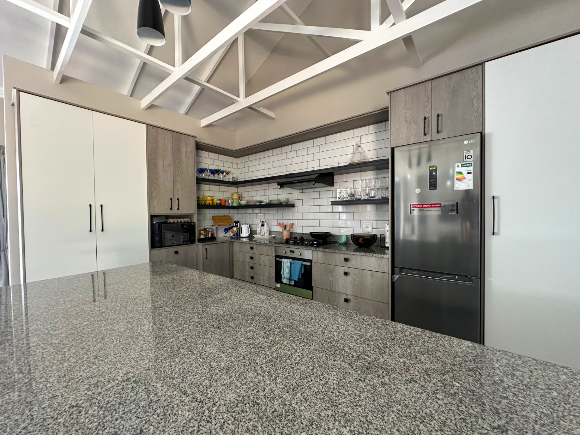 The well-equipped modern kitchen is adjacent to the living area and includes a separate scullery and laundry room, ensuring both style and functionality.